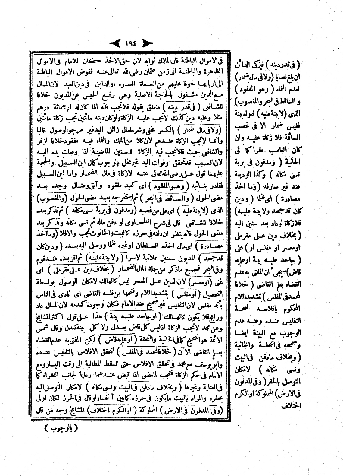 فِي الْأَمْوَالِ الْبَاطِنَةِ فَإِنَّ الْمُلَّاكَ نُوَّابُهُ لِأَنَّ حَقَّ الْأَخْذِ كَانَ لِلْإِمَامِ فِي الْأَمْوَالِ الظَّاهِرَةِ وَالْبَاطِنَةِ إلَى زَمَنِ عُثْمَانَ - رَضِيَ اللَّهُ تَعَالَى عَنْهُ - فَفَوَّضَ الْأَمْوَالَ الْبَاطِنَةَ إلَى أَرْبَابِهَا خَوْفًا عَلَيْهِمْ مِنْ السُّعَاةِ السُّوءِ أَوْ الدَّيْنِ فِي دَيْنِ الْعَبْدِ لِأَنَّ الْمَالَ مَعَ الدَّيْنِ مَشْغُولٌ بِالْحَاجَةِ الْأَصْلِيَّةِ وَهِيَ رَفْعُ الْحَبْسِ عَنْ الْمَدْيُونِ خِلَافًا لِلشَّافِعِيِّ (فِي قَدْرِ دَيْنِهِ) مُتَعَلِّقٌ بِقَوْلِهِ فَلَا تَجِبُ فَإِنَّهُ إذَا كَانَ لَهُ أَرْبَعُمِائَةِ دِرْهَمٍ مَثَلًا وَعَلَيْهِ دَيْنٌ كَذَلِكَ لَا تَجِبُ عَلَيْهِ الزَّكَاةُ وَلَوْ كَانَ دَيْنُهُ مِائَتَيْنِ تَجِبُ زَكَاةُ مِائَتَيْنِ.