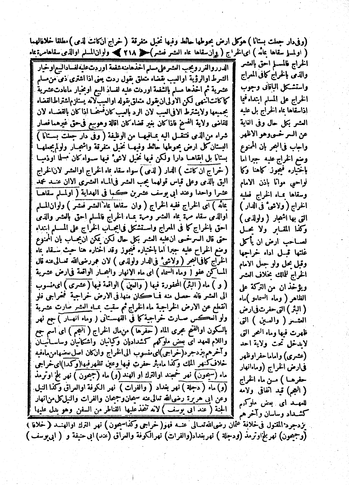 (وَمَاءُ أَنْهَارٍ) جَمْعُ نَهْرٍ بِالسُّكُونِ أَوْ الْفَتْحِ مَجْرَى الْمَاءِ (حَفَرَهَا) مِنْ مَالِ الْخَرَاجِ (الْعَجَمُ) أَيْ اسْمُ جَمْعٍ وَاللَّامُ لِلْعَهْدِ أَيْ بَعْضُ مُلُوكِهِمْ كشداديان وكيانيان وإشكانيان وساسانيان وَآخِرُهُمْ بِيَزْدَجْرِدُ (خَرَاجِيٌّ) أَيْ مَنْسُوبٌ إلَى الْخَرَاجِ وَإِنْ كَانَ أَصْلُ بَعْضِهَا مِنْ مَاءٍ فِيهِ خِلَافٌ كَنَهْرِ الْمَلِكِ وَكَذَا مَاءُ بِئْرٍ حُفِرَتْ فِيهَا وَعَيْنٌ تَظْهَرُ فِيهَا (وَكَذَا) أَيْ خَرَاجِيٌّ مَاءُ (سَيْحُونَ) نَهْرُ خُجَنْدَ أَوْ التُّرْكِ أَوْ الْهِنْدِ.
