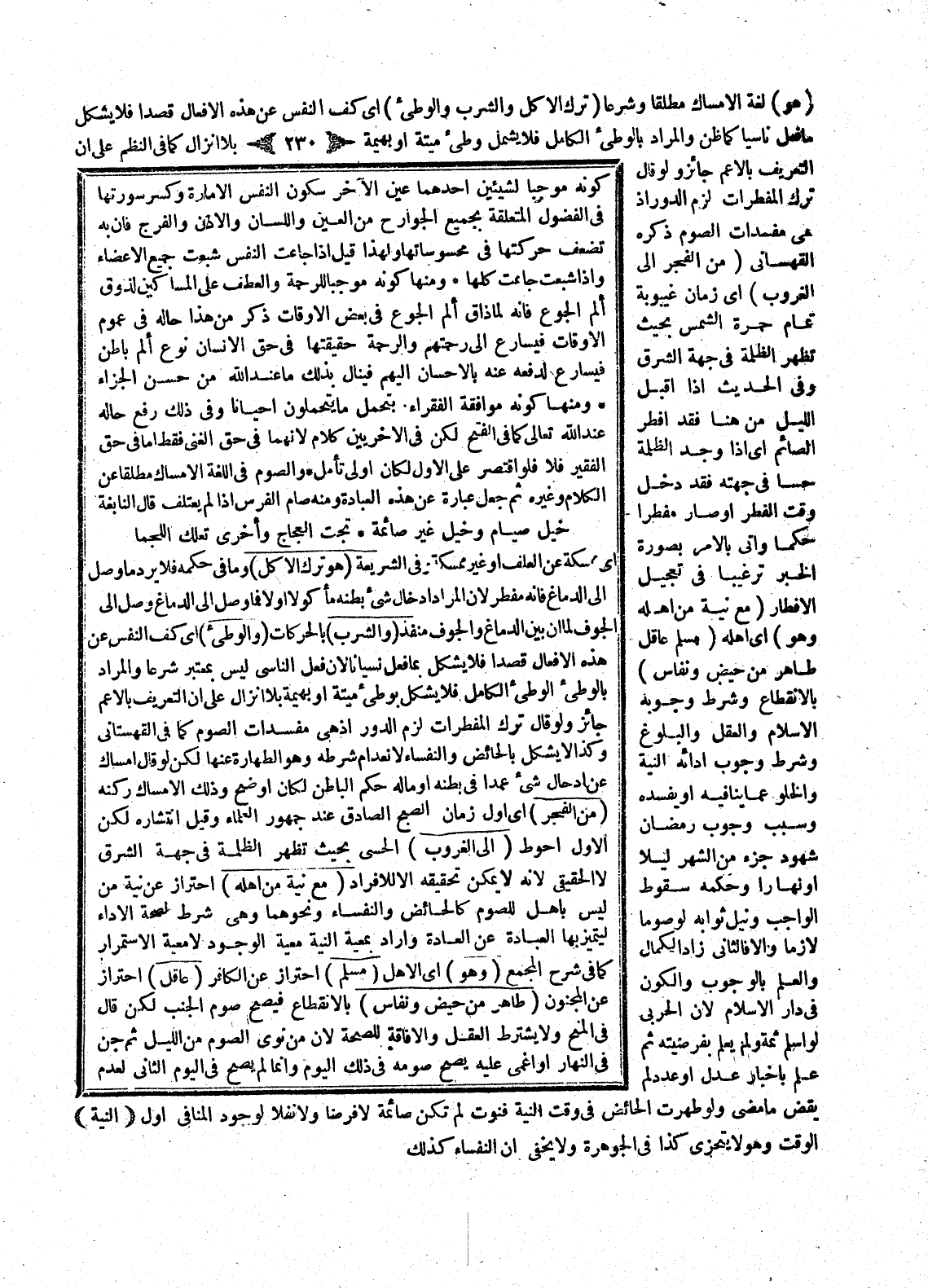 أَيْ مُمْسِكَةٌ عَنْ الْعَلَفِ أَوْ غَيْرُ مُمْسِكَةٍ وَفِي الشَّرِيعَةِ (هُوَ تَرْكُ الْأَكْلِ) وَمَا فِي حُكْمِهِ فَلَا يَرِدُ مَا وَصَلَ إلَى الدِّمَاغِ فَإِنَّهُ مُفْطِرٌ؛ لِأَنَّ الْمُرَادَ إدْخَالُ شَيْءٍ بَطْنَهُ مَأْكُولًا أَوْ لَا فَمَا وَصَلَ إلَى الدِّمَاغِ وَصَلَ إلَى الْجَوْفِ لِمَا أَنَّ بَيْنَ الدِّمَاغِ وَالْجَوْفِ مَنْفَذٌ (وَالشُّرْبِ) بِالْحَرَكَاتِ (وَالْوَطْءِ) أَيْ كَفُّ النَّفْسِ عَنْ هَذِهِ الْأَفْعَالِ قَصْدًا فَلَا يَشْكُلُ بِمَا فُعِلَ نِسْيَانًا؛ لِأَنَّ فِعْلَ النَّاسِي لَيْسَ بِمُعْتَبَرٍ شَرْعًا وَالْمُرَادُ بِالْوَطْءِ الْوَطْءُ الْكَامِلُ فَلَا يُشْكِلُ بِوَاطِئِ مَيْتَةٍ أَوْ بَهِيمَةٍ بِلَا إنْزَالٍ عَلَى أَنَّ التَّعْرِيفَ بِالْأَعَمِّ جَائِزٌ، وَلَوْ قَالَ تَرْكُ الْمُفْطِرَاتِ لَزِمَ الدَّوْرُ إذْ هِيَ مُفْسِدَاتُ الصَّوْمِ كَمَا فِي الْقُهُسْتَانِيِّ وَكَذَا لَا يُشْكِلُ بِالْحَائِضِ وَالنُّفَسَاءِ لِانْعِدَامِ شَرْطِهِ وَهُوَ الطَّهَارَةُ عَنْهَا، لَكِنْ لَوْ قَالَ: إمْسَاكٌ عَنْ إدْخَالِ شَيْءٍ عَمْدًا فِي بَطْنِهِ أَوْ مَا لَهُ حُكْمُ الْبَاطِنِ لَكَانَ أَوْضَحَ وَذَلِكَ الْإِمْسَاكُ رُكْنُهُ (مِنْ الْفَجْرِ) أَيْ أَوَّلِ زَمَانِ الصُّبْحِ الصَّادِقِ عِنْدَ جُمْهُورِ الْعُلَمَاءِ وَقِيلَ انْتِشَارُهُ لَكِنَّ الْأَوَّلَ أَحْوَطُ (إلَى الْغُرُوبِ) الْحِسِّيِّ بِحَيْثُ تَظْهَرُ الظُّلْمَةُ فِي جِهَةِ الشَّرْقِ لَا الْحَقِيقِيِّ؛ لِأَنَّهُ لَا يُمْكِنُ تَحْقِيقُهُ إلَّا لِلْأَفْرَادِ (مَعَ نِيَّةٍ مِنْ أَهْلِهِ) احْتِرَازٌ عَنْ نِيَّةِ مَنْ لَيْسَ بِأَهْلٍ لِلصَّوْمِ كَالْحَائِضِ وَالنُّفَسَاءِ وَنَحْوِهِمَا وَهِيَ شَرْطٌ لِصِحَّةِ الْأَدَاءِ لِيَتَمَيَّزَ بِهَا الْعِبَادَةُ عَنْ الْعَادَةِ، وَأَرَادَ بِمَعِيَّةِ النِّيَّةِ مَعِيَّةَ الْوُجُودِ لَا مَعِيَّةَ الِاسْتِمْرَارِ كَمَا فِي شَرْحِ الْمَجْمَعِ (وَهُوَ) أَيْ الْأَهْلُ (مُسْلِمٌ) احْتِرَازٌ عَنْ الْكَافِرِ (عَاقِلٌ) احْتِرَازٌ عَنْ الْمَجْنُونِ (طَاهِرٌ مِنْ حَيْضٍ وَنِفَاسٍ) بِالِانْقِطَاعِ فَيَصِحُّ صَوْمُ الْجُنُبِ لَكِنْ قَالَ فِي الْمِنَحِ وَلَا يُشْتَرَطُ الْعَقْلُ وَالْإِفَاقَةُ لِلصِّحَّةِ؛ لِأَنَّ مَنْ نَوَى الصَّوْمَ مِنْ اللَّيْلِ ثُمَّ جُنَّ فِي النَّهَارِ أَوْ أُغْمِيَ عَلَيْهِ يَصِحُّ صَوْمُهُ فِي ذَلِكَ الْيَوْمِ وَإِنَّمَا لَمْ يَصِحَّ فِي الْيَوْمِ الثَّانِي لِعَدَمِ