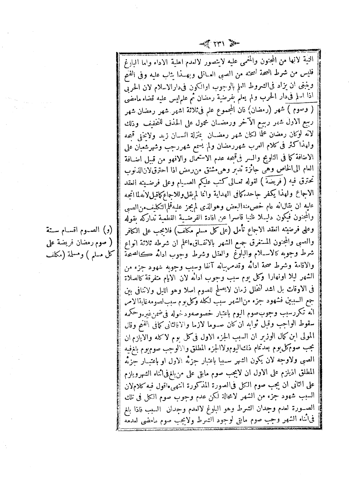 وَقَالَ الْمَوْلَى ابْنُ كَمَالِ الْوَزِيرِ إنَّ السَّبَبَ الْجُزْءُ الْأَوَّلُ فِي كُلِّ يَوْمٍ لَا كُلُّهُ وَإِلَّا يَلْزَمُ أَنْ يَجِبَ صَوْمُ كُلِّ يَوْمٍ بَعْدَ تَمَامِ ذَلِكَ الْيَوْمِ وَلَا الْجُزْءُ الْمُطْلَقُ وَإِلَّا لَوَجَبَ صَوْمُ يَوْمٍ بَلَغَ فِيهِ الصَّبِيُّ، وَلَا وَجْهَ لَأَنْ يَكُونَ الشَّهْرُ سَبَبًا بِاعْتِبَارِ جُزْئِهِ الْأَوَّلِ أَوْ بِاعْتِبَارِ جُزْئِهِ الْمُطْلَقِ إذْ يَلْزَمُ عَلَى الْأَوَّلِ أَنْ لَا يَجِبَ صَوْمُ مَا بَقِيَ عَلَى مَنْ بَلَغَ فِي أَثْنَاءِ الشَّهْرِ وَيَلْزَمُ عَلَى الثَّانِي أَنْ يَجِبَ صَوْمُ الْكُلِّ فِي الصُّورَةِ الْمَذْكُورَةِ انْتَهَى أَقُولُ فِيهِ كَلَامٌ؛ لِأَنَّ السَّبَبَ شُهُودُ جُزْءٍ مِنْ الشَّهْرِ لَا مَحَالَةَ لَكِنَّ عَدَمَ وُجُوبِ صَوْمِ الْكُلِّ فِي تِلْكَ الصُّورَةِ لِعَدَمِ وِجْدَانِ الشَّرْطِ وَهُوَ الْبُلُوغُ لَا لِعَدَمِ وِجْدَانِ السَّبَبِ فَإِذَا بَلَغَ فِي أَثْنَاءِ الشَّهْرِ وَجَبَ صَوْمُ مَا بَقِيَ لِوُجُودِ الشَّرْطِ وَلَا يَجِبُ صَوْمُ مَا مَضَى لِعَدَمِهِ