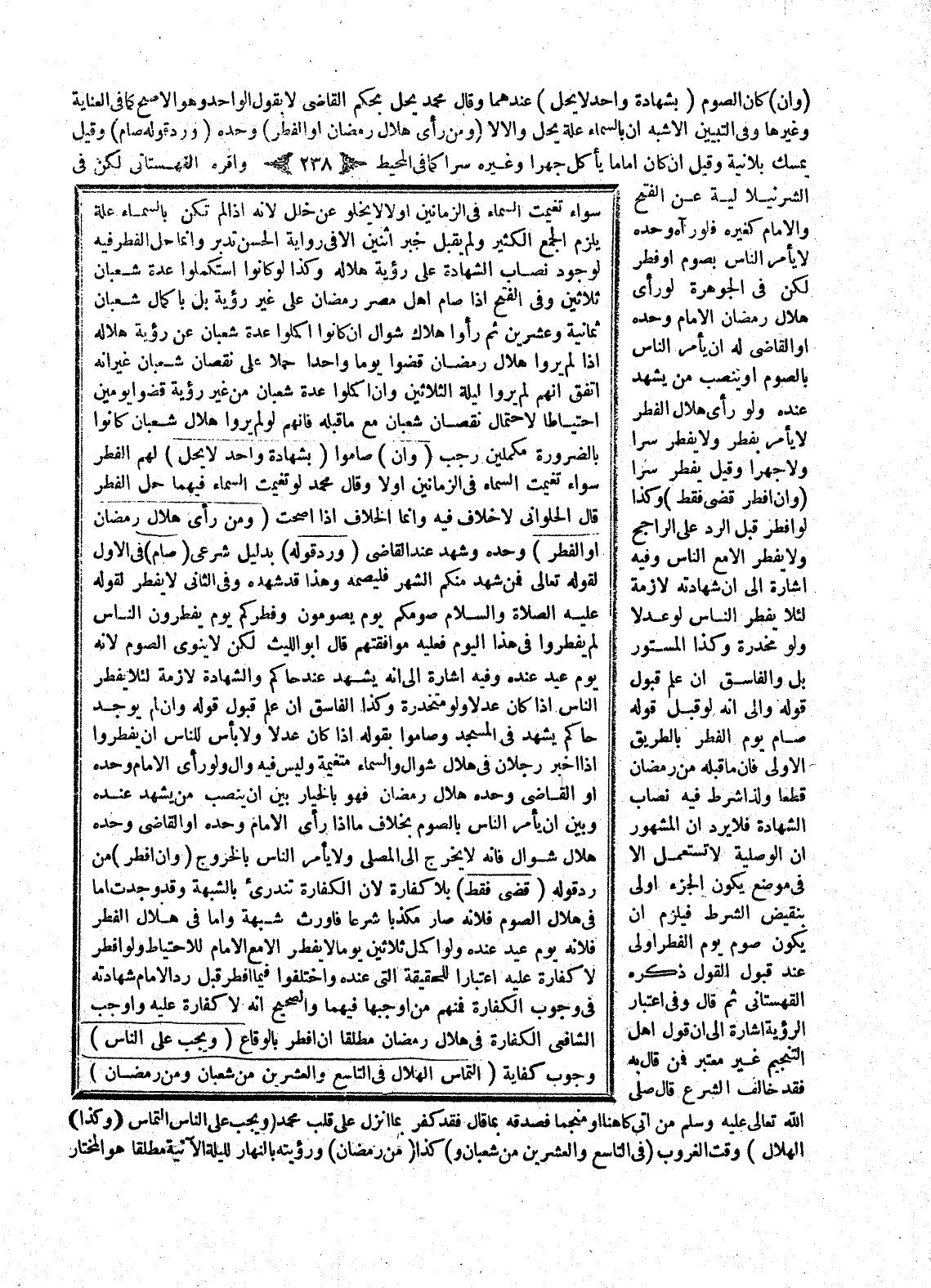 وَإِنَّمَا حَلَّ الْفِطْرُ فِيهِ لِوُجُودِ نِصَابِ الشَّهَادَةِ عَلَى رُؤْيَةِ هِلَالِهِ وَكَذَا لَوْ كَانُوا اسْتَكْمَلُوا عِدَّةَ شَعْبَانَ ثَلَاثِينَ.