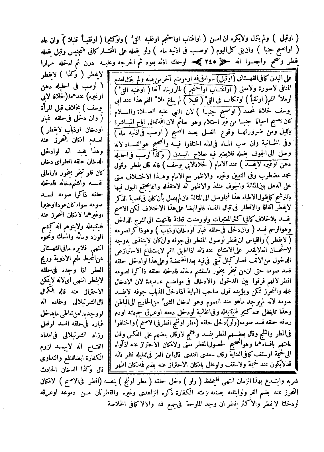 وَفِي التَّبْيِينِ وَغَيْرِهِ وَالْأَظْهَرُ مَعَ الْإِمَامِ وَهَذَا الِاخْتِلَافُ مَبْنِيٌّ عَلَى أَنَّهُ هَلْ بَيْنَ الْمَثَانَةِ وَالْجَوْفِ مَنْفَذٌ وَالْأَظْهَرُ أَنَّهُ لَا مَنْفَذَ لَهُ وَإِنَّمَا يَجْتَمِعُ الْبَوْلُ فِيهَا بِالتَّرْشِيحِ: كَمَا يَقُولُ الْأَطِبَّاءُ هَذَا فِيمَا وَصَلَ إلَى الْمَثَانَةِ فَإِنْ لَمْ يَصِلْ بِأَنْ كَانَ فِي قَصَبَةِ الذَّكَرِ لَا يُفْطِرُ اتِّفَاقًا وَالْإِفْطَارُ فِي أَقْبَالِ النِّسَاءِ قَالُوا أَيْضًا عَلَى هَذَا الِاخْتِلَافِ لَكِنَّ الْأَصَحَّ يَفْسُدُ بِلَا خِلَافٍ كَمَا فِي أَكْثَرِ الْمُعْتَبَرَاتِ،.