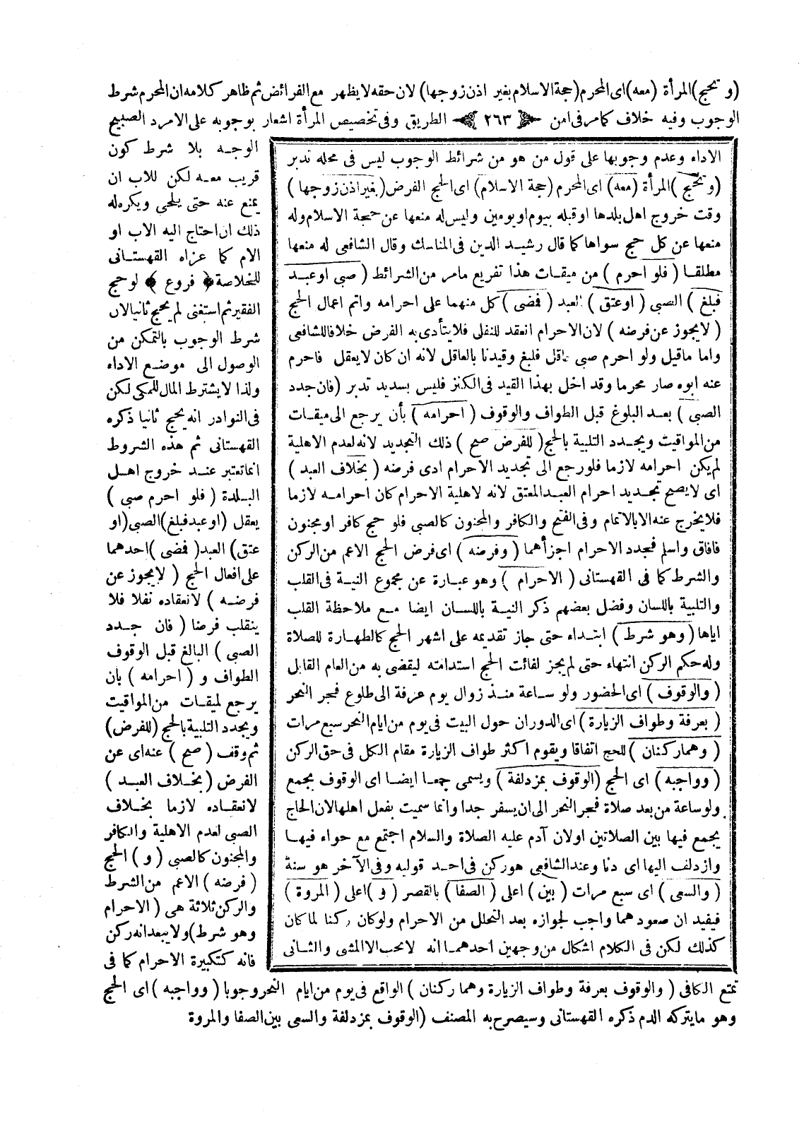 الْأَدَاءِ وَعَدَمُ وُجُوبِهَا عَلَى قَوْلِ مَنْ هُوَ مِنْ شَرَائِطِ الْوُجُوبِ لَيْسَ فِي مَحَلِّهِ. تَدَبَّرْ (وَتَحُجُّ) الْمَرْأَةُ (مَعَهُ) أَيْ الْمَحْرَمِ (حَجَّةَ الْإِسْلَامِ) أَيْ الْحَجَّ الْفَرْضَ (بِغَيْرِ إذْنِ زَوْجِهَا) وَقْتَ خُرُوجِ أَهْلِ بَلَدِهَا أَوْ قَبْلَهُ بِيَوْمٍ أَوْ يَوْمَيْنِ وَلَيْسَ لَهُ مَنْعُهَا عَنْ حَجَّةِ الْإِسْلَامِ وَلَهُ مَنْعُهَا عَنْ كُلِّ حَجٍّ سِوَاهَا كَمَا قَالَ رَشِيدُ الدِّينِ فِي الْمَنَاسِكِ وَقَالَ الشَّافِعِيُّ لَهُ مَنْعُهَا مُطْلَقًا.
