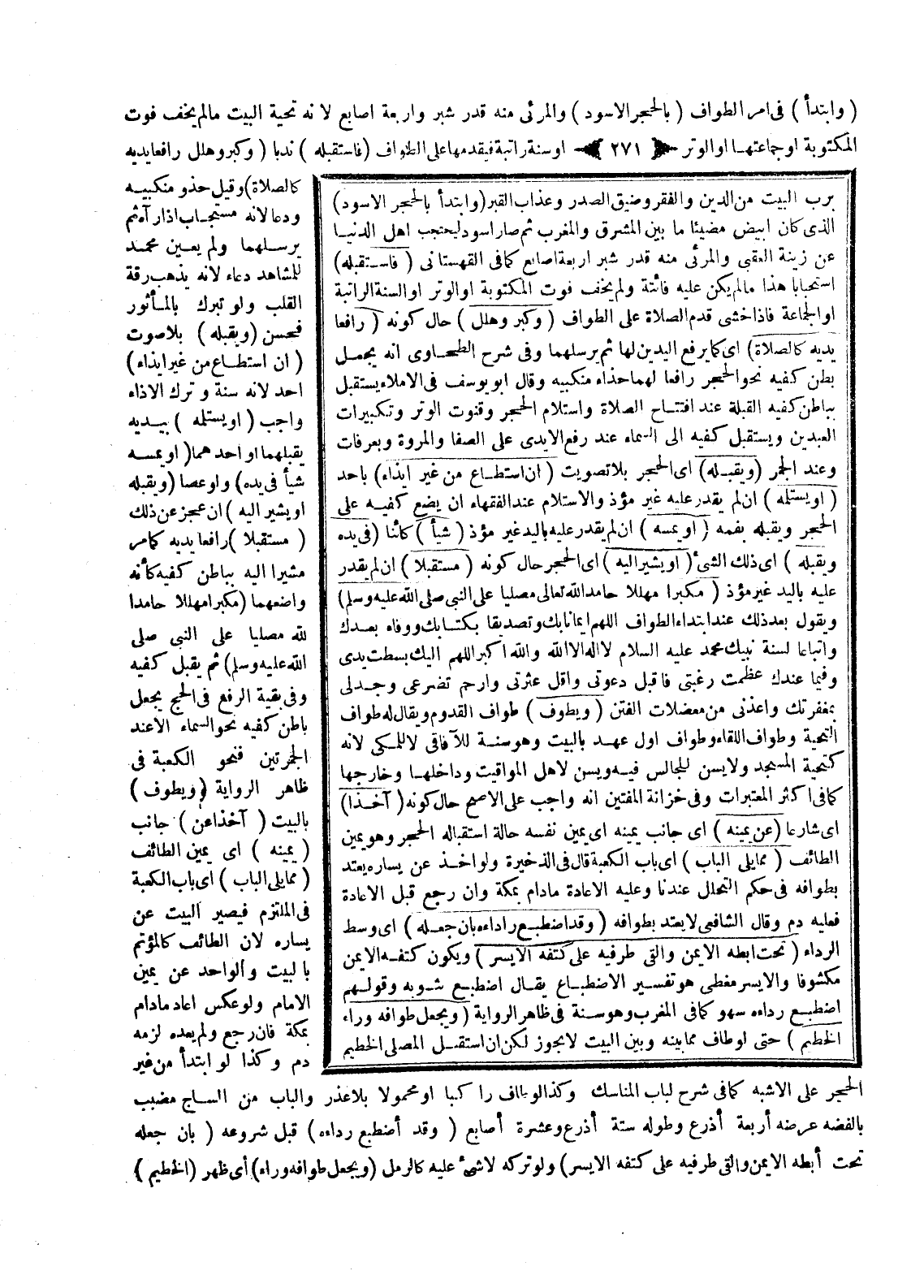 بِرَبِّ الْبَيْتِ مِنْ الدَّيْنِ وَالْفَقْرِ وَضِيقِ الصَّدْرِ وَعَذَابِ الْقَبْرِ» (وَابْتَدَأَ بِالْحَجَرِ الْأَسْوَدِ) الَّذِي كَانَ أَبْيَضَ مُضِيئًا مَا بَيْنَ الْمَشْرِقِ وَالْمَغْرِبِ ثُمَّ صَارَ أَسْوَدَ لِيَحْتَجِبَ أَهْلُ الدُّنْيَا عَنْ زِينَةِ الْعُقْبَى، وَالْمَرْئِيُّ مِنْهُ قَدْرُ شِبْرٍ أَرْبَعَةُ أَصَابِعَ كَمَا فِي الْقُهُسْتَانِيِّ (فَاسْتَقْبَلَهُ) اسْتِحْبَابًا هَذَا مَا لَمْ يَكُنْ عَلَيْهِ فَائِتَةٌ وَلَمْ يَخَفْ فَوْتَ الْمَكْتُوبَةِ أَوْ الْوِتْرِ أَوْ السُّنَّةِ الرَّاتِبَةِ أَوْ الْجَمَاعَةِ فَإِذَا خَشِيَ قَدَّمَ الصَّلَاةَ عَلَى الطَّوَافِ (وَكَبَّرَ وَهَلَّلَ) حَالَ كَوْنِهِ (رَافِعًا يَدَيْهِ كَالصَّلَاةِ) أَيْ كَمَا يَرْفَعُ الْيَدَيْنِ لَهَا ثُمَّ يُرْسِلُهُمَا وَفِي شَرْحِ الطَّحَاوِيِّ أَنَّهُ يَجْعَلُ بَطْنَ كَفَّيْهِ نَحْوَ الْحَجَرِ رَافِعًا لَهُمَا حِذَاءَ مَنْكِبَيْهِ.