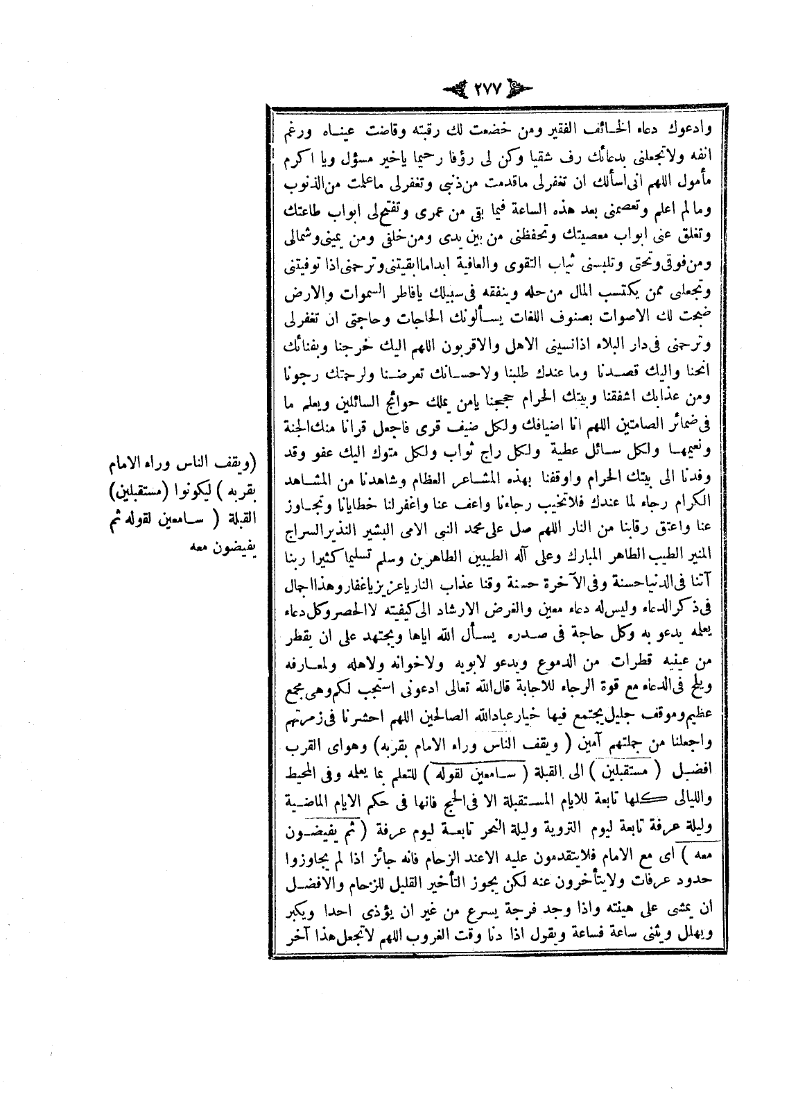 وَأَدْعُوَك دُعَاءَ الْخَائِفِ الْفَقِيرِ وَمَنْ خَضَعَتْ لَكَ رَقَبَتُهُ وَفَاضَتْ عَيْنَاهُ وَرَغِمَ أَنْفُهُ وَلَا تَجْعَلنِي بِدُعَائِك رَبِّي شَقِيًّا وَكُنْ لِي رَءُوفًا رَحِيمًا يَا خَيْرَ مَسْئُولٍ وَيَا أَكْرَمَ مَأْمُولٍ اللَّهُمَّ إنِّي أَسْأَلُكَ أَنْ تَغْفِرَ لِي مَا قَدَّمْتُ مِنْ ذَنْبِي وَتَغْفِرَ لِي مَا عَلِمْتُ مِنْ الذُّنُوبِ وَمَا لَمْ أَعْلَمْ وَتَعْصِمَنِي بَعْدَ هَذِهِ السَّاعَةِ فِيمَا بَقِيَ مِنْ عُمُرِي وَتَفْتَحَ لِي أَبْوَابَ طَاعَتِك وَتُغْلِقَ عَنِّي أَبْوَابَ مَعْصِيَتِك وَتَحْفَظَنِي مِنْ بَيْنَ يَدَيَّ وَمِنْ خَلْفِي وَمِنْ يَمِينِي وَشِمَالِي وَمِنْ فَوْقِي وَتَحْتِي وَتُلْبِسَنِي ثِيَابَ التَّقْوَى وَالْعَافِيَةِ أَبَدًا مَا أَبْقَيْتنِي وَتَرْحَمَنِي إذَا تَوَفَّيْتنِي وَتَجْعَلَنِي مِمَّنْ يَكْتَسِبُ الْمَالَ مِنْ حِلِّهِ وَيُنْفِقُهُ فِي سَبِيلِك يَا فَاطِرَ السَّمَوَاتِ وَالْأَرْضِ ضَجَّتْ لَك الْأَصْوَاتُ بِصُنُوفِ اللُّغَاتِ يَسْأَلُونَك الْحَاجَاتِ وَحَاجَتِي أَنْ تَغْفِرَ لِي وَتَرْحَمَنِي فِي دَارِ الْبَلَاءِ إذَا نَسِيَنِي الْأَهْلُ وَالْأَقْرَبُونَ اللَّهُمَّ إلَيْك خَرَجْنَا وَبِفِنَائِك أَنَخْنَا وَإِلَيْك قَصَدْنَا وَمَا عِنْدَك طَلَبْنَا وَلِإِحْسَانِك تَعَرَّضْنَا وَلِرَحْمَتِك رَجَوْنَا وَمِنْ عَذَابِك أَشْفَقْنَا وَبَيْتَك الْحَرَامَ حَجَجْنَا يَا مِنْ يَمْلِكُ حَوَائِجَ السَّائِلِينَ وَيَعْلَمُ مَا فِي ضَمَائِرِ الصَّامِتِينَ اللَّهُمَّ إنَّا أَضْيَافُك وَلِكُلِّ ضَيْفٍ قِرًى فَاجْعَلْ قِرَانَا مِنْكَ الْجَنَّةَ وَنَعِيمَهَا وَلِكُلِّ سَائِلٍ عَطِيَّةٌ وَلِكُلِّ رَاجٍ ثَوَابٌ وَلِكُلِّ مُتَوَكٍّ إلَيْك عَفْوٌ وَقَدْ وَفَدْنَا إلَى بَيْتِك الْحَرَامِ وَأَوْقَفْنَا بِهَذِهِ الْمَشَاعِرِ الْعِظَامِ وَشَاهَدْنَا مِنْ الْمَشَاهِدِ الْكِرَامِ رَجَاءً لِمَا عِنْدَك فَلَا تُخَيِّبْ رَجَاءَنَا وَاعْفُ عَنَّا وَاغْفِرْ لَنَا خَطَايَانَا وَتَجَاوَزْ عَنَّا وَاعْتِقْ رِقَابَنَا مِنْ النَّارِ اللَّهُمَّ صَلِّ عَلَى مُحَمَّدٍ النَّبِيِّ الْأُمِّيِّ الْبَشِيرِ النَّذِيرِ السِّرَاجِ الْمُنِيرِ الطَّيِّبِ الطَّاهِرِ الْمُبَارَكِ وَعَلَى آلِهِ الطَّيِّبِينَ الطَّاهِرِينَ وَسَلِّمْ تَسْلِيمًا كَثِيرًا رَبَّنَا آتِنَا فِي الدُّنْيَا حَسَنَةً وَفِي الْآخِرَةِ حَسَنَةً وَقِنَا عَذَابَ النَّارِ يَا عَزِيزُ يَا غَفَّارُ وَهَذَا إجْمَالٌ فِي ذِكْرِ الدُّعَاءِ وَلَيْسَ لَهُ دُعَاءٌ مُعَيَّنٌ وَالْغَرَضُ الْإِرْشَادُ إلَى كَيْفِيَّتِهِ لَا الْحَصْرُ وَكُلُّ دُعَاءٍ يَعْلَمُهُ يَدْعُو بِهِ وَكُلُّ حَاجَةٍ فِي صَدْرِهِ يَسْأَلُ اللَّهَ إيَّاهَا وَيَجْتَهِدُ عَلَى أَنْ يَقْطُرَ مِنْ عَيْنَيْهِ قَطَرَاتٍ مِنْ الدُّمُوعِ وَيَدْعُوَ لِأَبَوَيْهِ وَلِإِخْوَانِهِ وَلِأَهْلِهِ وَلِمَعَارِفِهِ وَيُلِحَّ فِي الدُّعَاءِ مَعَ قُوَّةِ الرَّجَاءِ لِلْإِجَابَةِ قَالَ اللَّهُ تَعَالَى: {ادْعُونِي أَسْتَجِبْ لَكُمْ} [غافر: 60] وَهِيَ مَجْمَعٌ عَظِيمٌ وَمَوْقِفٌ جَلِيلٌ يَجْتَمِعُ فِيهَا خِيَارُ عِبَادِ اللَّهِ الصَّالِحِينَ اللَّهُمَّ اُحْشُرْنَا فِي زُمْرَتِهِمْ وَاجْعَلْنَا مِنْ جُمْلَتِهِمْ آمِينَ (وَيَقِفَ النَّاسُ وَرَاءَ الْإِمَامِ بِقُرْبِهِ) وَهُوَ أَيْ الْقُرْبُ أَفْضَلُ (مُسْتَقْبِلِينَ) إلَى الْقِبْلَةِ (سَامِعِينَ لِقَوْلِهِ) لِلتَّعَلُّمِ بِمَا يُعَلِّمُهُ.