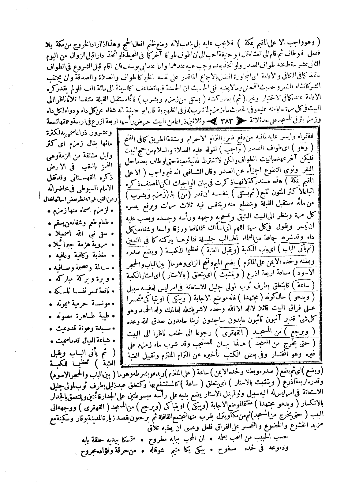 (ثُمَّ يَسْتَقِي) بِنَفْسِهِ إنْ قَدَرَ (مِنْ) بِئْرِ (زَمْزَمَ وَيَشْرَبُ) مِنْ مَائِهِ مُسْتَقْبِلَ الْقِبْلَةِ وَيَتَضَلَّعُ مِنْهُ وَيَتَنَفَّسُ فِيهِ ثَلَاثَ مَرَّاتٍ وَيَرْفَعُ بَصَرَهُ كُلَّ مَرَّةٍ وَيَنْظُرُ إلَى الْبَيْتِ الْعَتِيقِ وَيَمْسَحُ بِهِ وَجْهَهُ وَرَأْسَهُ وَجَسَدَهُ وَيَصُبُّ عَلَيْهِ إنْ تَيَسَّرَ وَيَقُولُ فِي كُلِّ مَرَّةٍ: اللَّهُمَّ إنِّي أَسْأَلُكَ عِلْمًا نَافِعًا وَرِزْقًا وَاسِعًا وَشِفَاءً مِنْ كُلِّ دَاءٍ وَقَدْ شَرِبَهُ جَمَاعَةٌ مِنْ الْعُلَمَاءِ لِمَطَالِبَ جَلِيلَةٍ فَنَالُوهَا بِبَرَكَتِهِ كَمَا فِي التَّبْيِينِ (ثُمَّ يَأْتِي الْبَابَ) أَيْ بَابَ الْكَعْبَةِ (وَيُقَبِّلُ الْعَتَبَةَ) تَعْظِيمًا لِلْكَعْبَةِ (وَيَضَعُ صَدْرَهُ وَبَطْنَهُ وَخَدَّهُ الْأَيْمَنَ عَلَى الْمُلْتَزَمِ) بِضَمِّ الْمِيمِ وَفَتْحِ الزَّايِ وَهُوَ مَا (بَيْنَ الْبَابِ وَالْحَجَرِ الْأَسْوَدِ) مَسَافَةُ أَرْبَعَةِ أَذْرُعٍ (وَيَتَشَبَّثُ) أَيْ يَتَعَلَّقُ (بِالْأَسْتَارِ) أَيْ أَسْتَارِ الْكَعْبَةِ (سَاعَةً) كَالْمُتَعَلِّقِ بِطَرَفِ ثَوْبٍ لِمَوْلًى جَلِيلٍ لِلِاسْتِعَانَةِ فِي أَمْرٍ لَيْسَ لَهُ فِيهِ سَبِيلٌ (وَيَدْعُو) حَالَ كَوْنِهِ (مُجْتَهِدًا) فَإِنَّهُ مَوْضِعُ الْإِجَابَةِ (وَيَبْكِي) أَوْ يَتَبَاكَى مُتَحَسِّرًا عَلَى فِرَاقِ الْبَيْتِ قَائِلًا: لَا إلَهَ إلَّا اللَّهُ وَحْدَهُ لَا شَرِيكَ لَهُ لَهُ الْمُلْكُ وَلَهُ الْحَمْدُ وَهُوَ عَلَى كُلِّ شَيْءٍ قَدِيرٌ آيِبُونَ تَائِبُونَ عَابِدُونَ سَاجِدُونَ لِرَبِّنَا حَامِدُونَ صَدَقَ اللَّهُ وَعْدَهُ (وَيَرْجِعُ) مِنْ الْمَسْجِدِ (الْقَهْقَرَى) رُجُوعًا إلَى خَلْفٍ نَاظِرًا إلَى الْبَيْتِ (حَتَّى يَخْرُجَ مِنْ الْمَسْجِدِ) هَذَا بَيَانٌ لِلْمُسْتَحَبِّ وَقَدْ شَرِبَ مَاءَ زَمْزَمَ عَلَى غَيْرِهِ وَهُوَ الْمُخْتَارُ.