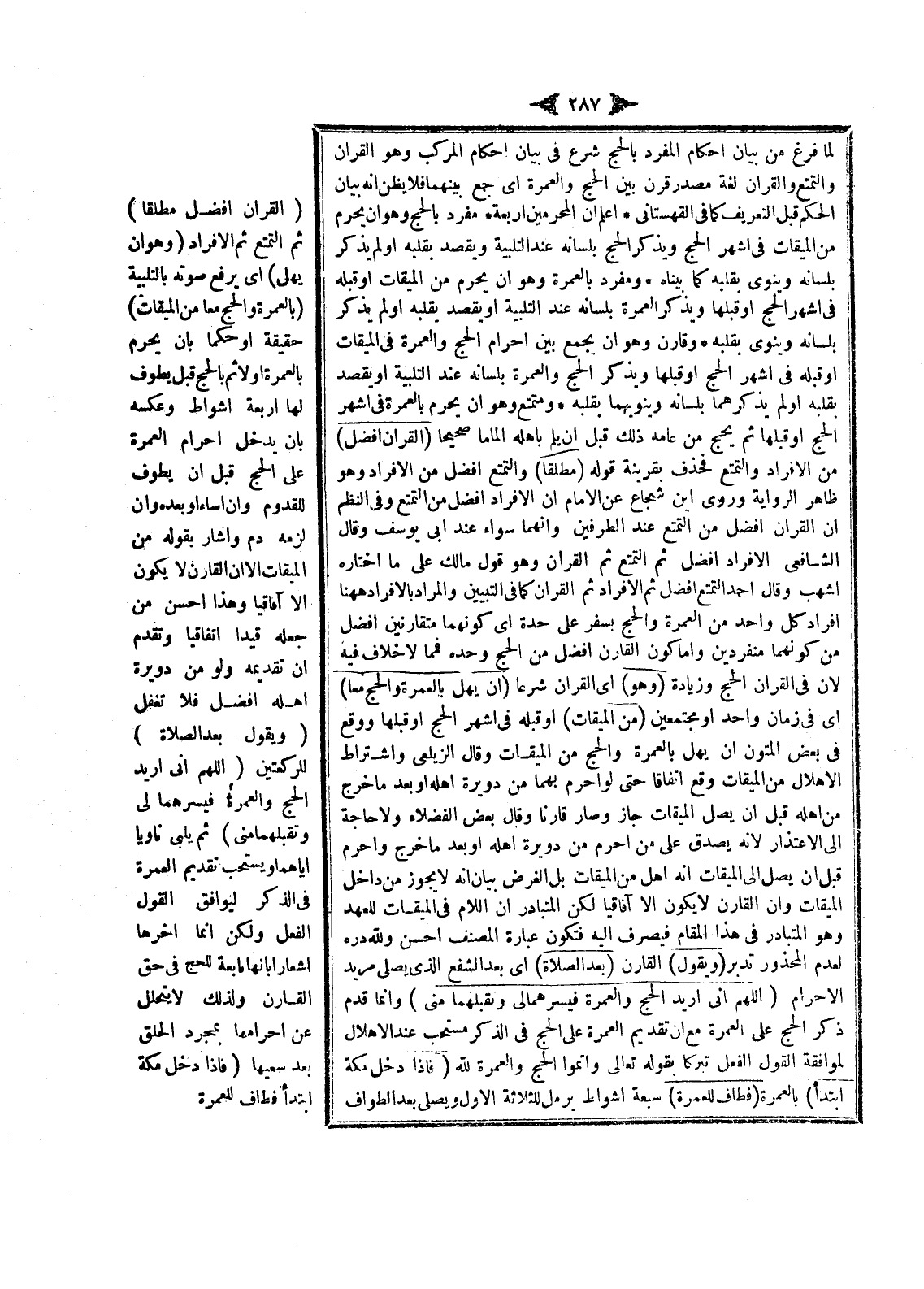 لَمَّا فَرَغَ مِنْ بَيَانِ أَحْكَامِ الْمُفْرَدِ بِالْحَجِّ شَرَعَ فِي بَيَانِ أَحْكَامِ الْمُرَكَّبِ وَهُوَ الْقِرَانُ وَالتَّمَتُّعُ وَالْقِرَانُ لُغَةً مَصْدَرُ قَرَنَ بَيْنَ الْحَجِّ وَالْعُمْرَةِ أَيْ جَمَعَ بَيْنَهُمَا فَلَا يُظَنُّ أَنَّهُ بَيَانُ الْحُكْمِ قَبْلَ التَّعْرِيفِ كَمَا فِي الْقُهُسْتَانِيِّ اعْلَمْ أَنَّ الْمُحْرِمِينَ أَرْبَعَةٌ مُفْرِدٌ بِالْحَجِّ وَهُوَ: أَنْ يُحْرِمَ مِنْ الْمِيقَاتِ فِي أَشْهُرِ الْحَجِّ وَيَذْكُرَ الْحَجَّ بِلِسَانِهِ عِنْدَ التَّلْبِيَةِ وَيَقْصِدَ بِقَلْبِهِ أَوْ لَمْ يَذْكُرْ بِلِسَانِهِ وَيَنْوِيَ بِقَلْبِهِ كَمَا بَيَّنَّاهُ وَمُفْرِدٌ بِالْعُمْرَةِ وَهُوَ أَنْ يُحْرِمَ مِنْ الْمِيقَاتِ أَوْ قَبْلَهُ فِي أَشْهُرِ الْحَجِّ أَوْ قَبْلَهَا وَيَذْكُرَ الْعُمْرَةَ بِلِسَانِهِ عِنْدَ التَّلْبِيَةِ أَوْ يَقْصِدَ بِقَلْبِهِ أَوْ لَمْ يَذْكُرْ بِلِسَانِهِ وَيَنْوِيَ بِقَلْبِهِ وَقَارِنٌ وَهُوَ أَنْ يَجْمَعَ بَيْنَ إحْرَامِ الْحَجِّ وَالْعُمْرَةِ فِي الْمِيقَاتِ أَوْ قَبْلَهُ فِي أَشْهُرِ الْحَجِّ أَوْ قَبْلَهَا وَيَذْكُرَ الْحَجَّ وَالْعُمْرَةَ بِلِسَانِهِ عِنْدَ التَّلْبِيَةِ أَوْ يَقْصِدَ بِقَلْبِهِ أَوْ لَمْ يَذْكُرْهُمَا بِلِسَانِهِ وَيَنْوِيَهُمَا بِقَلْبِهِ وَمُتَمَتِّعٌ وَهُوَ أَنْ يُحْرِمَ بِالْعُمْرَةِ فِي أَشْهُرِ الْحَجِّ أَوْ قَبْلَهَا ثُمَّ يَحُجَّ مِنْ عَامِهِ ذَلِكَ قَبْلَ أَنْ يُلِمَّ بِأَهْلِهِ إلْمَامًا صَحِيحًا (الْقِرَانُ أَفْضَلُ) مِنْ الْإِفْرَادِ وَالتَّمَتُّعِ فَحُذِفَ بِقَرِينَةِ قَوْلِهِ (مُطْلَقًا) وَالتَّمَتُّعُ أَفْضَلُ مِنْ الْإِفْرَادِ وَهُوَ ظَاهِرُ الرِّوَايَةِ وَرَوَى ابْنُ شُجَاعٍ عَنْ الْإِمَامِ أَنَّ الْإِفْرَادَ أَفْضَلُ مِنْ التَّمَتُّعِ.