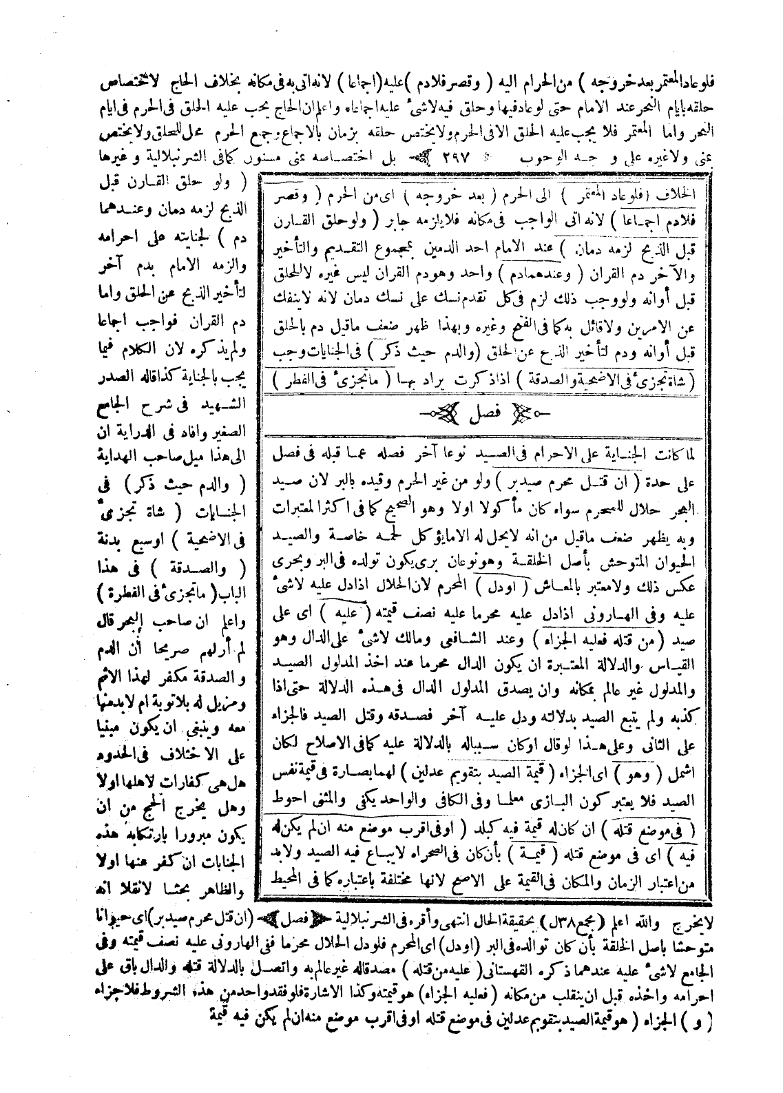 فَصْلٌ لَمَّا كَانَتْ الْجِنَايَةُ عَلَى الْإِحْرَامِ فِي الصَّيْدِ نَوْعًا آخَرَ فَصَلَهُ عَمَّا قَبْلَهُ فِي فَصْلٍ عَلَى حِدَةٍ (إنْ قَتَلَ مُحْرِمٌ صَيْدَ بَرٍّ) وَلَوْ مِنْ غَيْرِ الْحَرَمِ وَقَيَّدَهُ بِالْبَرِّ؛ لِأَنَّ صَيْدَ الْبَحْرِ حَلَالٌ لِلْمُحْرِمِ سَوَاءٌ كَانَ مَأْكُولًا أَوْ لَا وَهُوَ الصَّحِيحُ كَمَا فِي أَكْثَرِ الْمُعْتَبَرَاتِ وَبِهِ يَظْهَرُ ضَعْفُ مَا قِيلَ مِنْ أَنَّهُ لَا يَحِلُّ لَهُ إلَّا مَا يُؤْكَلُ لَحْمُهُ خَاصَّةً، وَالصَّيْدُ الْحَيَوَانُ الْمُتَوَحِّشُ بِأَصْلِ الْخِلْقَةِ وَهُوَ نَوْعَانِ بَرِّيٌّ يَكُونُ تَوَلُّدُهُ فِي الْبَرِّ وَبَحْرِيٌّ عَكْسُ ذَلِكَ وَلَا مُعْتَبَرَ بِالْمَعَاشِ (أَوْ دَلَّ) الْمُحْرِمُ؛ لِأَنَّ الْحَلَالَ إذَا دَلَّ عَلَيْهِ لَا شَيْءَ عَلَيْهِ.