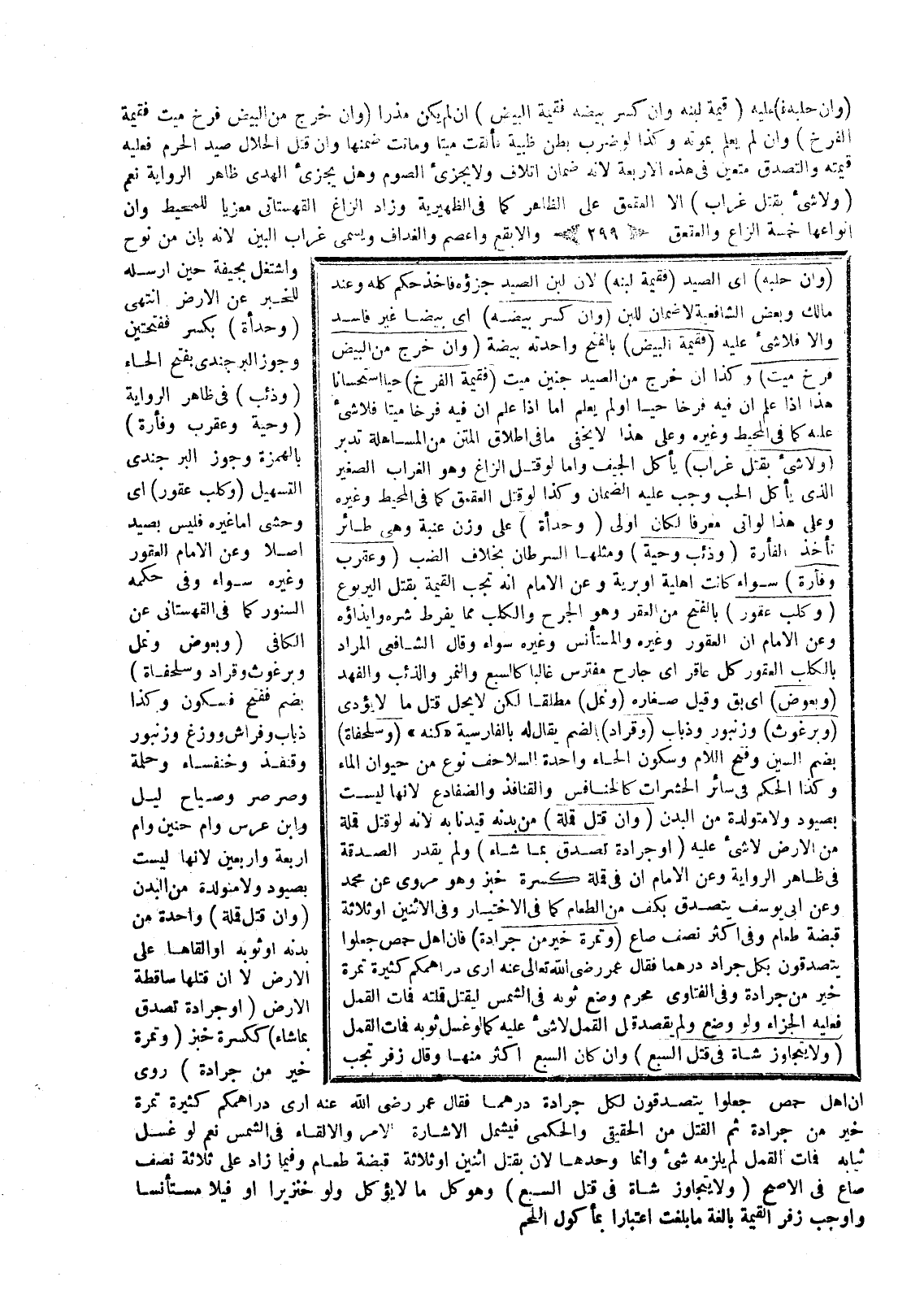 (وَإِنْ كَسَرَ بَيْضَهُ) أَيْ بَيْضًا غَيْرَ فَاسِدٍ وَإِلَّا فَلَا شَيْءَ عَلَيْهِ (فَقِيمَةُ الْبَيْضِ) بِالْفَتْحِ وَاحِدَتُهُ بَيْضَةٌ (وَإِنْ خَرَجَ مِنْ الْبَيْضِ فَرْخٌ مَيِّتٌ) وَكَذَا إنْ خَرَجَ مِنْ الصَّيْدِ جَنِينٌ مَيِّتٌ (فَقِيمَةُ الْفَرْخِ) حَيًّا اسْتِحْسَانًا هَذَا إذَا عَلِمَ أَنَّ فِيهِ فَرْخًا حَيًّا أَوْ لَمْ يَعْلَمْ، أَمَّا إذَا عَلِمَ أَنَّ فِيهِ فَرْخًا مَيِّتًا فَلَا شَيْءَ عَلَيْهِ كَمَا فِي الْمُحِيطِ وَغَيْرِهِ وَعَلَى هَذَا لَا يَخْفَى مَا فِي إطْلَاقِ الْمَتْنِ مِنْ الْمُسَاهَلَةِ تَدَبَّرْ (وَلَا شَيْءَ بِقَتْلِ غُرَابٍ) يَأْكُلُ الْجِيَفَ وَأَمَّا لَوْ قَتَلَ الزَّاغَ وَهُوَ الْغُرَابُ الصَّغِيرُ الَّذِي يَأْكُلُ الْحَبَّ وَجَبَ عَلَيْهِ الضَّمَانُ وَكَذَا لَوْ قَتَلَ الْعَقْعَقَ كَمَا فِي الْمُحِيطِ وَغَيْرِهِ وَعَلَى هَذَا لَوْ أَتَى مُعَرَّفًا لَكَانَ أَوْلَى (وَحِدَأَةٍ) عَلَى وَزْنِ عِنَبَةٍ وَهِيَ طَائِرٌ تَأْخُذُ الْفَأْرَةَ (وَذِئْبٍ وَحَيَّةٍ) وَمِثْلُهَا السَّرَطَانُ بِخِلَافِ الضَّبِّ (وَعَقْرَبٍ وَفَأْرَةٍ) سَوَاءٌ كَانَتْ أَهْلِيَّةً أَوْ بَرِّيَّةً وَعَنْ الْإِمَامِ أَنَّهُ تَجِبُ الْقِيمَةُ بِقَتْلِ الْيَرْبُوعِ (وَكَلْبٍ عَقُورٍ) بِالْفَتْحِ مِنْ الْعَقْرِ وَهُوَ الْجَرْحُ وَالْكَلْبُ مِمَّا يَفْرُطُ شَرُّهُ وَإِيذَاؤُهُ وَعَنْ الْإِمَامِ أَنَّ الْعَقُورَ وَغَيْرَهُ وَالْمُسْتَأْنَسَ وَغَيْرَهُ سَوَاءٌ.