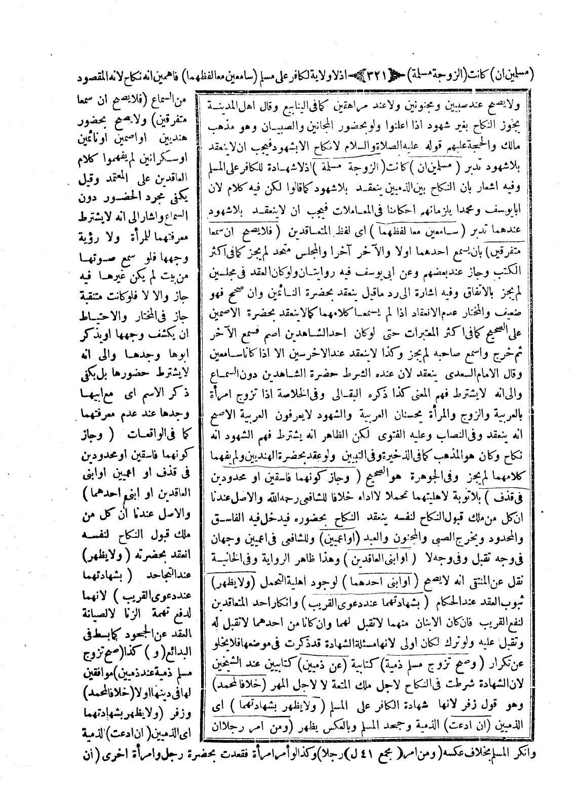 (مُسْلِمَيْنِ إنْ) كَانَتْ (الزَّوْجَةُ مُسْلِمَةً) إذْ لَا شَهَادَةَ لِلْكَافِرِ عَلَى الْمُسْلِمِ وَفِيهِ إشْعَارٌ بِأَنَّ النِّكَاحَ بَيْنَ الذِّمِّيَّيْنِ يَنْعَقِدُ بِلَا شُهُودٍ كَمَا قَالُوا لَكِنْ فِيهِ كَلَامٌ؛ لِأَنَّ أَبَا يُوسُفَ وَمُحَمَّدًا يُلْزِمَانِهِمْ أَحْكَامَنَا فِي الْمُعَامَلَاتِ فَيَجِبُ أَنْ لَا يَنْعَقِدَ بِلَا شُهُودٍ عِنْدَهُمَا، تَدَبَّرْ.