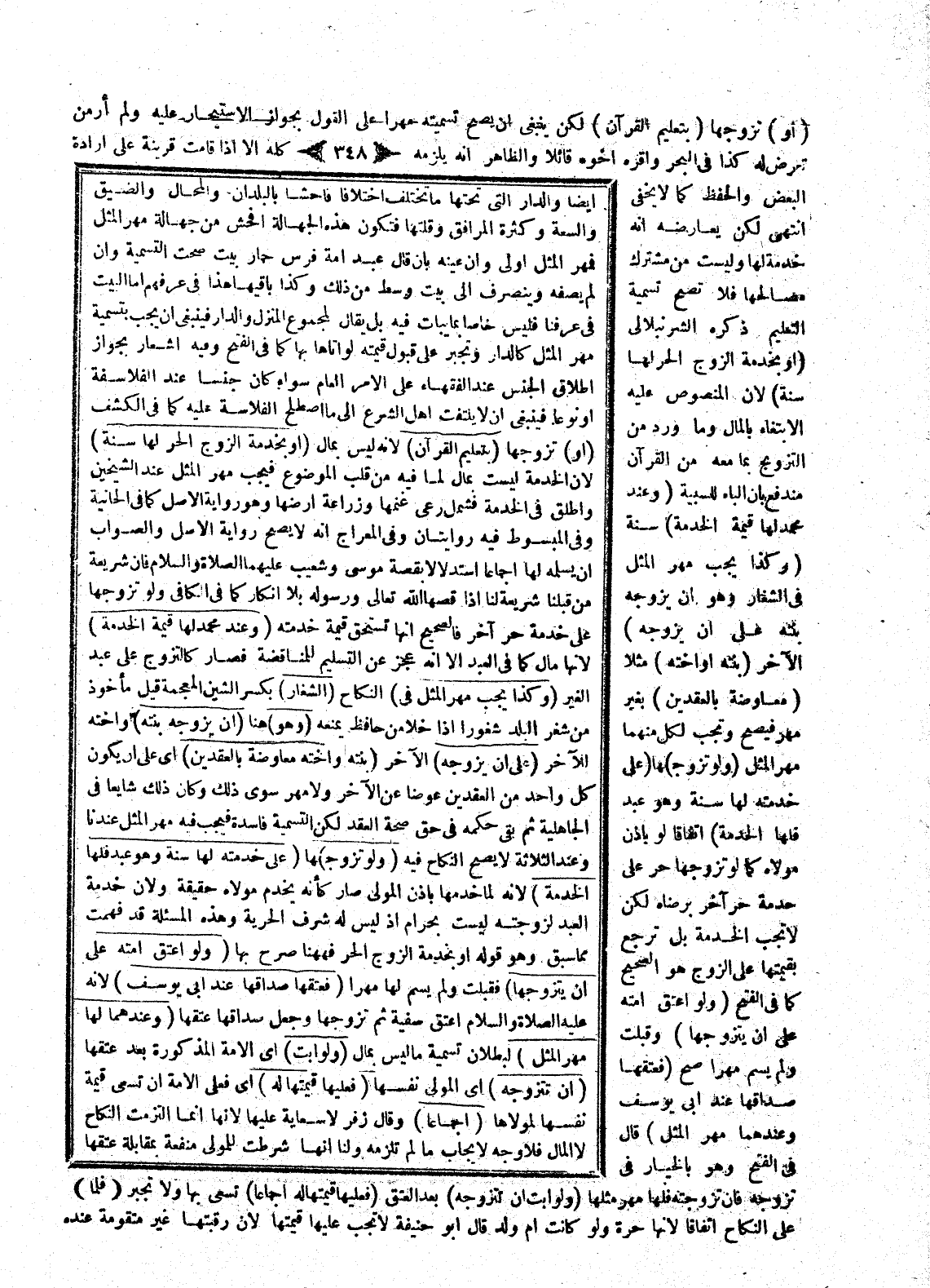 (أَوْ) تَزَوَّجَهَا (بِتَعْلِيمِ الْقُرْآنِ) ؛ لِأَنَّهُ لَيْسَ بِمَالٍ (أَوْ بِخِدْمَةِ الزَّوْجِ الْحُرِّ لَهَا سَنَةً) ؛ لِأَنَّ الْخِدْمَةَ لَيْسَتْ بِمَالٍ لِمَا فِيهِ مِنْ قَلْبِ الْمَوْضُوعِ فَيَجِبُ مَهْرُ الْمِثْلِ عِنْدَ الشَّيْخَيْنِ وَأُطْلِقَ فِي الْخِدْمَةِ فَشَمِلَ رَعْيَ غَنَمِهَا وَزِرَاعَةَ أَرْضِهَا وَهُوَ رِوَايَةُ الْأَصْلِ كَمَا فِي الْخَانِيَّةِ.