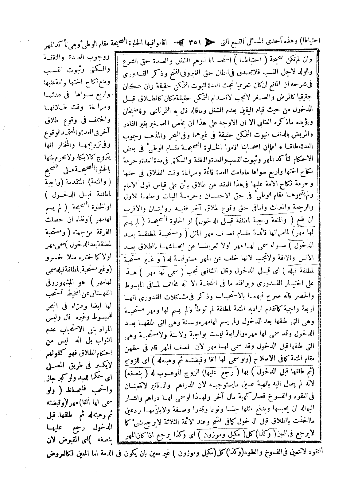 وَفِي الْبَحْرِ وَالْمُذْهَبِ وُجُوبُ الْعِدَّةِ مُطْلَقًا اعْلَمْ أَنَّ أَصْحَابَنَا أَقَامُوا الْخَلْوَةَ الصَّحِيحَةَ مَقَامَ الْوَطْءِ فِي بَعْضِ الْأَحْكَامِ لِتَأَكُّدِ الْمَهْرِ وَثُبُوتِ النَّسَبِ وَالْعِدَّةِ وَالنَّفَقَةِ وَالسُّكْنَى فِي مُدَّةِ الْعِدَّةِ وَحُرْمَةِ نِكَاحِ أُخْتِهَا وَأَرْبَعٍ سِوَاهَا مَا دَامَتْ الْعِدَّةُ قَائِمَةً وَمُرَاعَاةِ وَقْتِ الطَّلَاقِ فِي حَقِّهَا وَحُرْمَةِ نِكَاحِ الْأَمَةِ عَلَيْهَا فِي هَذَا الْعَقْدِ عَنْ طَلَاقٍ بَائِنٍ عَلَى قِيَاسِ قَوْلِ الْإِمَامِ وَلَمْ يُقِيمُوهَا مَقَامَ الْوَطْءِ فِي حَقِّ الْإِحْصَانِ وَحُرْمَةِ الْبَنَاتِ وَحِلِّهَا لِلْأَوَّلِ وَالرَّجْعَةِ وَالْمِيرَاثِ، وَأَمَّا فِي حَقِّ وُقُوعِ طَلَاقٍ آخَرَ فَفِيهِ رِوَايَتَانِ وَالْأَقْرَبُ أَنْ يَقَعَ.