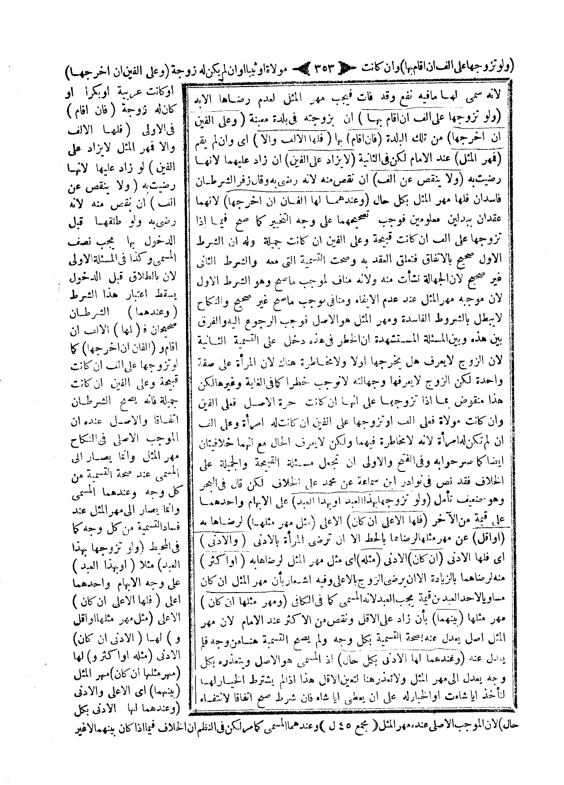 (وَلَوْ تَزَوَّجَهَا عَلَى أَلْفٍ إنْ أَقَامَ بِهَا) أَيْ بِزَوْجَتِهِ فِي بَلْدَةٍ مُعَيَّنَةٍ (وَعَلَى أَلْفَيْنِ إنْ أَخْرَجَهَا) مِنْ تِلْكَ الْبَلْدَةِ (فَإِنْ أَقَامَ) بِهَا (فَلَهَا الْأَلْفُ وَإِلَّا) أَيْ وَإِنْ لَمْ يَقُمْ (فَمَهْرُ الْمِثْلِ) عِنْدَ الْإِمَامِ لَكِنْ فِي الثَّانِيَةِ (لَا يُزَادُ عَلَى أَلْفَيْنِ) إنْ زَادَ عَلَيْهِمَا؛؛ لِأَنَّهَا رَضِيَتْ بِهِ (وَلَا يَنْقُصُ عَنْ أَلْفٍ) إنْ نَقَصَ مِنْهُ لِأَنَّهُ رَضِيَ بِهِ.