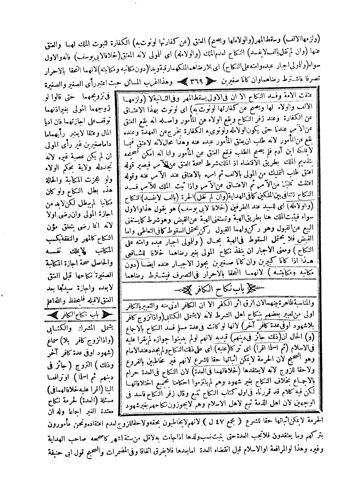 ِ وَالْمُنَاسَبَةُ ظَاهِرَةٌ بَيْنَهُمَا؛ لِأَنَّ الرِّقَّ أَثَرُ الْكُفْرِ إلَّا أَنَّ الْكَافِرَ أَدْنَى مِنْهُ وَالتَّعْبِيرُ بِالْكَافِرِ أَوْلَى مِنْ تَعْبِيرِ بَعْضِهِمْ بِنِكَاحِ أَهْلِ الشَّرْطِ؛ لِأَنَّهُ لَا يَشْمَلُ الْكِتَابِيَّ (وَإِذَا) (تَزَوَّجَ كَافِرٌ بِلَا شُهُودٍ، أَوْ فِي عِدَّةِ كَافِرٍ آخَرَ) ؛ لِأَنَّهَا لَوْ كَانَتْ فِي عِدَّةِ مُسْلِمٍ فَسَدَ النِّكَاحُ بِالْإِجْمَاعِ.