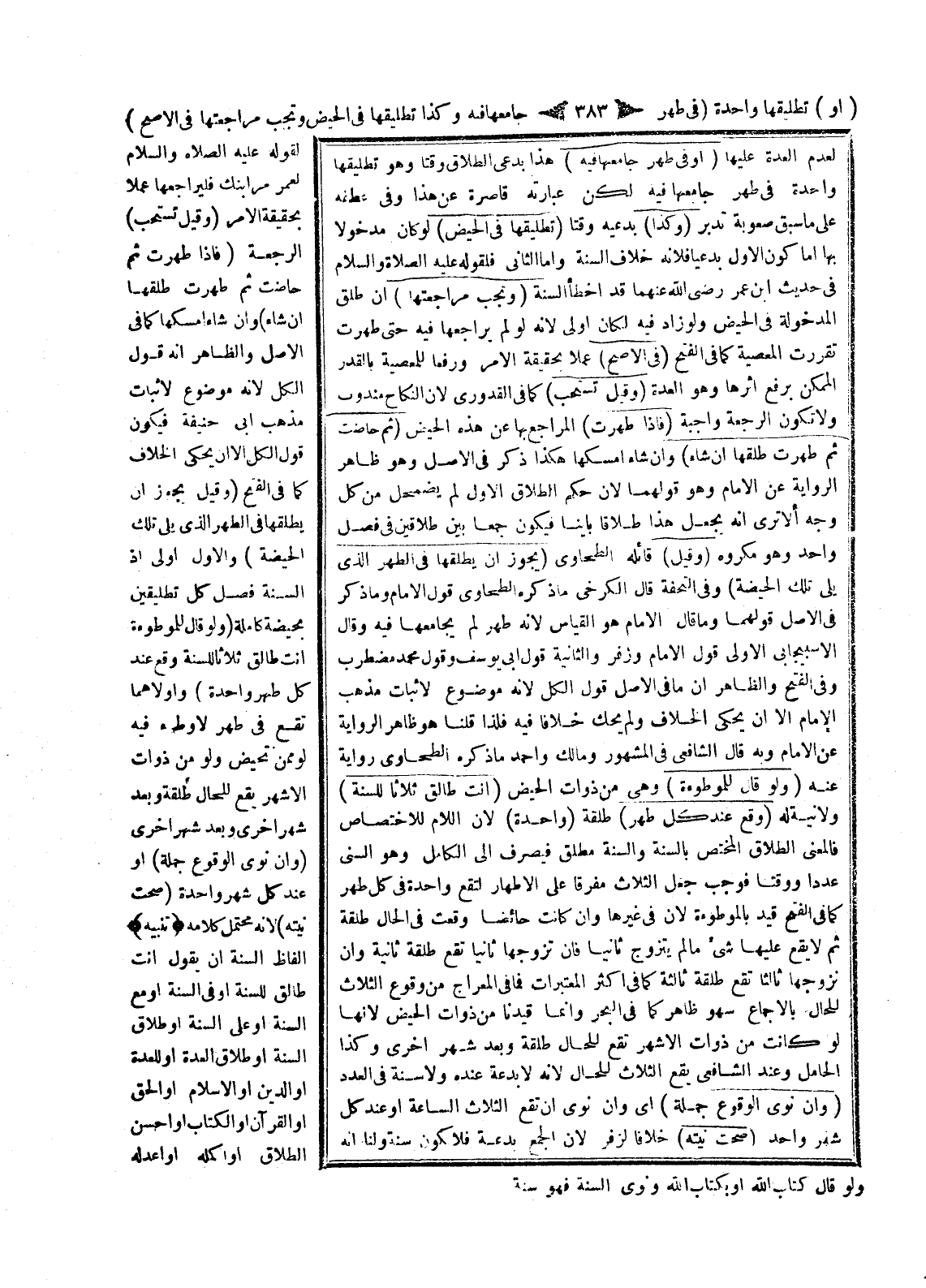 (وَكَذَا) بِدْعِيُّهُ وَقْتًا (تَطْلِيقُهَا فِي الْحَيْضِ) لَوْ كَانَ مَدْخُولًا بِهَا أَمَّا كَوْنُ الْأَوَّلِ بِدْعِيًّا فَلِأَنَّهُ خِلَافُ السُّنَّةِ وَأَمَّا الثَّانِي «فَلِقَوْلِهِ - عَلَيْهِ الصَّلَاةُ وَالسَّلَامُ - فِي حَدِيثِ ابْنِ عُمَرَ - رَضِيَ اللَّهُ عَنْهُمَا - قَدْ أَخْطَأَ السُّنَّةَ» (وَتَجِبُ مُرَاجَعَتُهَا) إنْ طَلَّقَ الْمَدْخُولَةَ فِي الْحَيْضِ، وَلَوْ زَادَ فِيهِ لَكَانَ أَوْلَى لِأَنَّهُ لَوْ لَمْ يُرَاجِعْهَا فِيهِ حَتَّى طَهُرَتْ تَقَرَّرَتْ الْمَعْصِيَةُ كَمَا فِي الْفَتْحِ (فِي الْأَصَحِّ) عَمَلًا بِحَقِيقَةِ الْأَمْرِ وَرَفْعًا لِلْمَعْصِيَةِ بِالْقَدْرِ الْمُمْكِنِ بِرَفْعِ أَثَرِهَا وَهُوَ الْعِدَّةُ (وَقِيلَ تُسْتَحَبُّ) كَمَا فِي الْقُدُورِيِّ؛ لِأَنَّ النِّكَاحَ مَنْدُوبٌ وَلَا تَكُونُ الرَّجْعَةُ وَاجِبَةً (فَإِذَا طَهُرَتْ) الْمُرَاجَعُ بِهَا عَنْ هَذِهِ الْحَيْضِ (ثُمَّ حَاضَتْ، ثُمَّ طَهُرَتْ طَلَّقَهَا إنْ شَاءَ) ، وَإِنْ شَاءَ أَمْسَكَهَا هَكَذَا ذَكَرَ فِي الْأَصْلِ وَهُوَ ظَاهِرُ الرِّوَايَةِ عَنْ الْإِمَامِ وَهُوَ قَوْلُهُمَا؛ لِأَنَّ حُكْمَ الطَّلَاقِ الْأَوَّلِ لَمْ يَضْمَحِلَّ مِنْ كُلِّ وَجْهٍ أَلَا تَرَى أَنَّهُ يَجْعَلُ هَذَا طَلَاقًا بَايَنَا فَيَكُونُ جَمْعًا بَيْنَ طَلَاقَيْنِ فِي فَصْلٍ وَاحِدٍ وَهُوَ مَكْرُوهٌ (وَقِيلَ) قَائِلُهُ الطَّحَاوِيُّ (يَجُوزُ أَنْ يُطَلِّقَهَا فِي الطُّهْرِ الَّذِي يَلِي تِلْكَ الْحَيْضَةِ) .