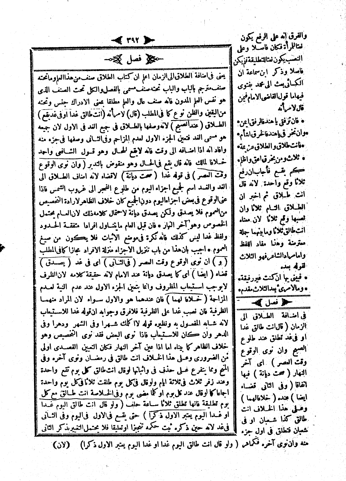 فَصْلٌ يَعْنِي فِي إضَافَةِ الطَّلَاقِ إلَى الزَّمَانِ اعْلَمْ أَنَّ كِتَابَ الطَّلَاقِ صِنْفٌ مِنْ هَذَا الْعِلْمِ وَمَا تَحْتَهُ صِنْفٌ مُتَرْجَمٌ بِالْبَابِ وَالْبَابُ تَحْتَهُ صِنْفٌ مُسَمًّى بِالْفَصْلِ وَالْكُلُّ تَحْتَ الصِّنْفِ الَّذِي هُوَ نَفْسُ الْعِلْمِ الْمُدَوَّنِ فَإِنَّهُ صِنْفٌ عَالٍ وَالْعِلْمُ مُطْلَقًا بِمَعْنَى الْإِدْرَاكِ جِنْسٌ وَتَحْتَهُ مِنْ الْيَقِينِ وَالظَّنِّ نَوْعٌ كَمَا فِي الْمَطْلَبِ (قَالَ) لِامْرَأَتِهِ (أَنْتِ طَالِقٌ غَدًا، أَوْ فِي غَدٍ يَقَعُ) الطَّلَاقُ (عِنْدَ الصُّبْحِ) لِأَنَّهُ وَصَفَهَا بِالطَّلَاقِ فِي جَمِيعِ الْغَدِ فِي الْأَوَّلِ؛ لِأَنَّ جَمِيعَهُ هُوَ مُسَمًّى الْغَدِ فَتَعَيَّنَ الْجُزْءُ الْأَوَّلُ لِعَدَمِ الْمُزَاحِمِ وَفِي الثَّانِي وَصَفَهَا فِي جُزْءٍ مِنْهُ وَأَفَادَ أَنَّهُ إذَا أَضَافَهُ إلَى وَقْتٍ فَإِنَّهُ لَا يَقَعُ لِلْحَالِ وَهُوَ قَوْلُ الشَّافِعِيِّ وَأَحْمَدَ خِلَافًا لِمَالِكٍ فَإِنَّهُ قَالَ يَقَعُ فِي الْحَالِ وَهُوَ مَنْقُوضٌ بِالتَّدَبُّرِ.