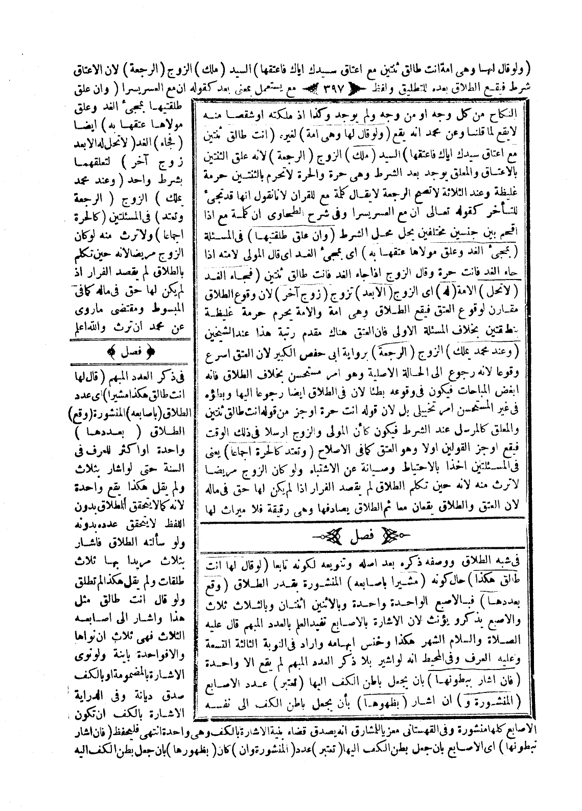 فَصْلٌ فِي شِبْهِ الطَّلَاقِ وَوَصْفِهِ، ذَكَرَهُ بَعْدَ أَصْلِهِ وَتَنْوِيعِهِ؛ لِكَوْنِهِ تَابِعًا، (لَوْ قَالَ لَهَا أَنْتِ طَالِقٌ هَكَذَا) حَالَ كَوْنِهِ (مُشِيرًا بِأَصَابِعِهِ) الْمَنْشُورَةِ بِقَدْرِ الطَّلَاقِ (وَقَعَ بِعَدَدِهَا) فَبِالْأُصْبُعِ الْوَاحِدَةِ وَاحِدَةٌ وَبِالِاثْنَيْنِ اثْنَتَانِ وَبِالثَّلَاثِ ثَلَاثٌ وَالْأُصْبُعُ يُذَكَّرُ وَيُؤَنَّثُ؛ لِأَنَّ الْإِشَارَةَ بِالْأَصَابِعِ تُفِيدُ الْعِلْمَ بِالْعَدَدِ الْمُبْهَمِ «قَالَ - عَلَيْهِ الصَّلَاةُ وَالسَّلَامُ - الشَّهْرُ هَكَذَا وَخَنَسَ إبْهَامَهُ» وَأَرَادَ فِي النَّوْبَةِ الثَّالِثَةِ التِّسْعَةَ وَعَلَيْهِ الْعُرْفُ.