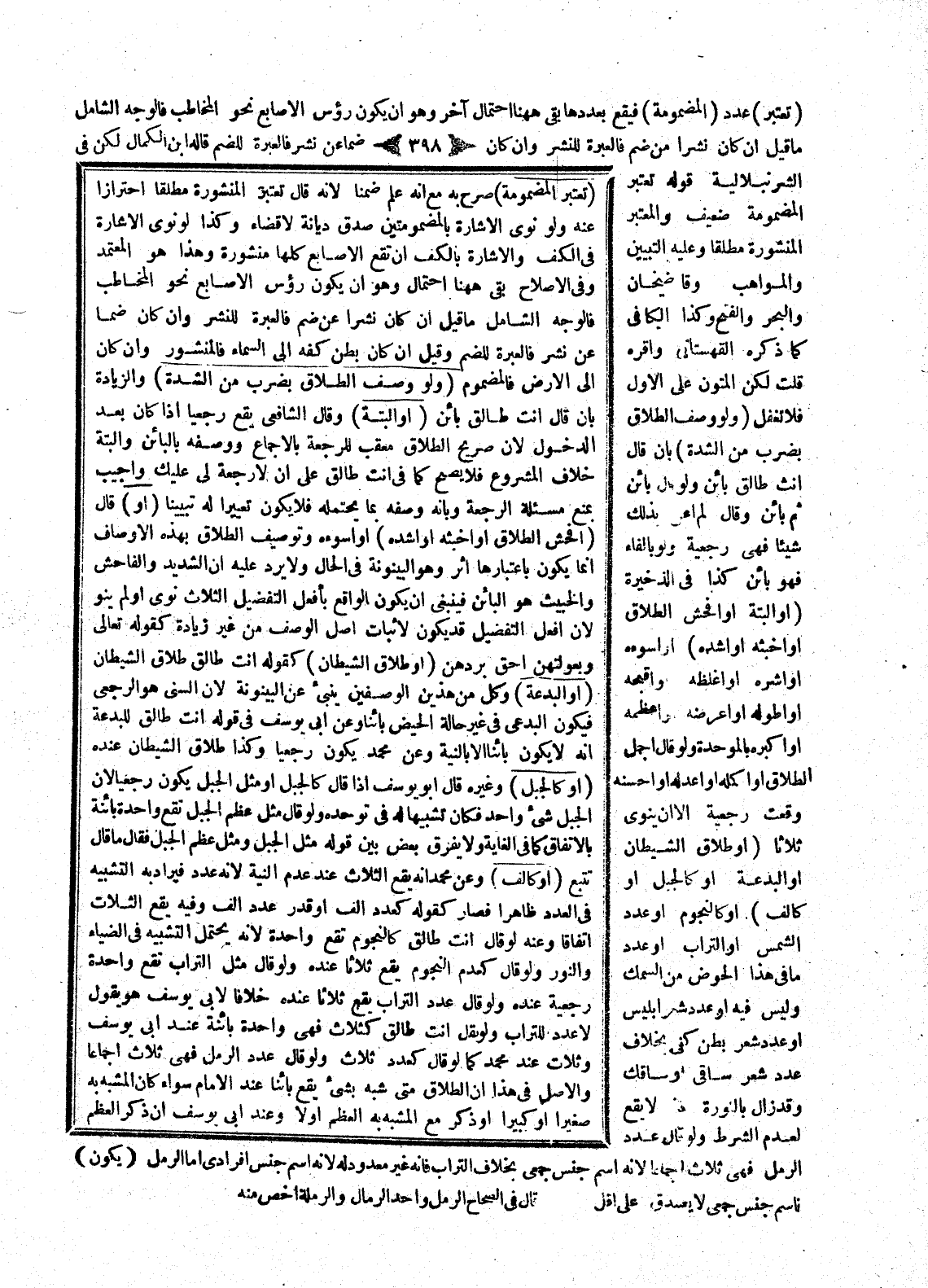 وَعَنْ مُحَمَّدٍ أَنَّهُ يَقَعُ الثَّلَاثُ عِنْدَ عَدَمِ النِّيَّةِ؛ لِأَنَّهُ عَدَدٌ فَيُرَادُ بِهِ التَّشْبِيهُ فِي الْعَدَدِ ظَاهِرًا فَصَارَ كَقَوْلِهِ كَعَدَدِ أَلْفٍ أَوْ قَدْرَ عَدَدِ أَلْفٍ وَفِيهِ يَقَعُ الثَّلَاثُ اتِّفَاقًا وَعَنْهُ لَوْ قَالَ أَنْتِ طَالِقٌ كَالنُّجُومِ تَقَعُ وَاحِدَةً؛ لِأَنَّهُ يَحْتَمِلُ التَّشْبِيهَ فِي الضِّيَاءِ وَالنُّورِ، وَلَوْ قَالَ: كَعَدَدِ النُّجُومِ يَقَعُ ثَلَاثًا عِنْدَهُ، وَلَوْ قَالَ: مِثْلَ التُّرَابِ تَقَعُ وَاحِدَةً رَجْعِيَّةً عِنْدَهُ، وَلَوْ قَالَ: عَدَدَ التُّرَابِ يَقَعُ ثَلَاثًا عِنْدَهُ خِلَافًا لِأَبِي يُوسُفَ هُوَ يَقُولُ لَا عَدَدَ لِلتُّرَابِ، وَلَوْ قَالَ أَنْتِ طَالِقٌ كَثَلَاثٍ فَهِيَ وَاحِدَةٌ بَائِنَةٌ عِنْدَ أَبِي يُوسُفَ وَثَلَاثٌ عِنْدَ مُحَمَّدٍ كَمَا لَوْ قَالَ: كَعَدَدِ ثَلَاثٍ وَلَوْ قَالَ: عَدَدَ الرَّمَلِ فَهِيَ ثَلَاثٌ إجْمَاعًا وَالْأَصْلُ فِي هَذَا أَنَّ الطَّلَاقَ مَتَى شُبِّهَ بِشَيْءٍ يَقَعُ بَائِنًا عِنْدَ الْإِمَامِ سَوَاءٌ كَانَ الْمُشَبَّهُ بِهِ صَغِيرًا، أَوْ كَبِيرًا، أَوْ ذَكَرَ مَعَ الْمُشَبَّهِ بِهِ الْعِظَمَ، أَوْ لَا وَعِنْدَ أَبِي يُوسُفَ إنْ ذَكَرَ الْعِظَمَ