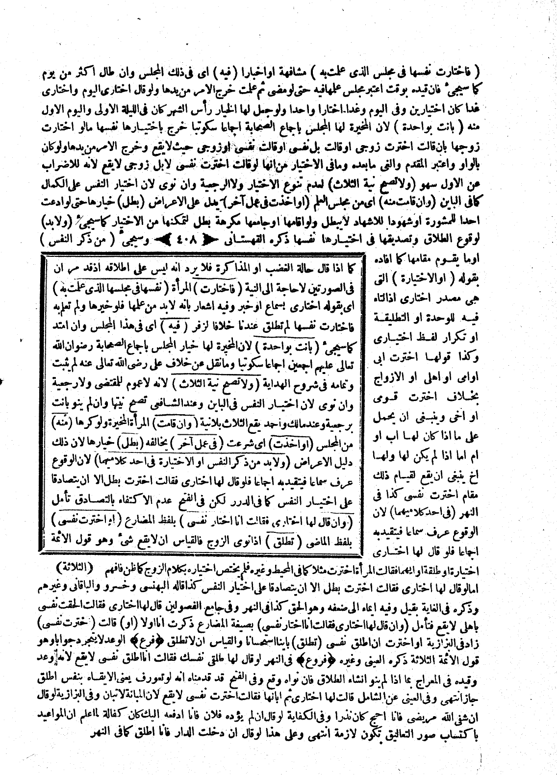 كَمَا إذَا قَالَ حَالَةَ الْغَضَبِ أَوْ الْمُذَاكَرَةِ فَلَا يُرَدُّ أَنَّهُ لَيْسَ عَلَى إطْلَاقِهِ إذْ قَدْ مَرَّ أَنَّ فِي الصُّورَتَيْنِ لَا حَاجَةَ إلَى النِّيَّةِ (فَاخْتَارَتْ) الْمَرْأَةُ (نَفْسَهَا فِي مَجْلِسِهَا الَّذِي عَلِمَتْ بِهِ) أَيْ بِقَوْلِهِ اخْتَارِي بِسَمَاعٍ أَوْ خَبَرٍ، وَفِيهِ إشْعَارٌ بِأَنَّهُ لَا بُدَّ مِنْ عَمَلِهَا فَلَوْ خَيَّرَهَا وَلَمْ تَعْلَمْ بِهِ فَاخْتَارَتْ نَفْسَهَا لَمْ تَطْلُقْ عِنْدَنَا خِلَافًا لِزُفَرَ (فِيهِ) أَيْ فِي هَذَا الْمَجْلِسِ وَإِنْ امْتَدَّ كَمَا سَيَجِيءُ (بَانَتْ بِوَاحِدَةٍ) ؛ لِأَنَّ الْمُخَيَّرَةَ لَهَا خِيَارُ الْمَجْلِسِ بِإِجْمَاعِ الصَّحَابَةِ - رِضْوَانُ اللَّهِ تَعَالَى عَلَيْهِمْ أَجْمَعِينَ - إجْمَاعًا سُكُوتِيًّا، وَمَا نُقِلَ عَنْ خِلَافِ عَلِيٍّ - رَضِيَ اللَّهُ تَعَالَى عَنْهُ - لَمْ يَثْبُتْ وَتَمَامُهُ فِي شُرُوحِ الْهِدَايَةِ. (وَلَا تَصِحُّ نِيَّةُ الثَّلَاثِ) لِأَنَّهُ لَا عُمُومَ لِلْمُقْتَضِي وَلَا رَجْعِيَّةَ وَإِنْ نَوَى لِأَنَّ اخْتِيَارَ النَّفْسِ فِي الْبَائِنِ وَعِنْدَ الشَّافِعِيِّ تَصِحُّ نِيَّتُهَا وَإِنْ لَمْ يَنْوِ بَانَتْ بِرَجْعِيَّةٍ وَعِنْدَ مَالِكٍ وَأَحْمَدَ يَقَعُ الثَّلَاثُ بِلَا نِيَّةٍ.
