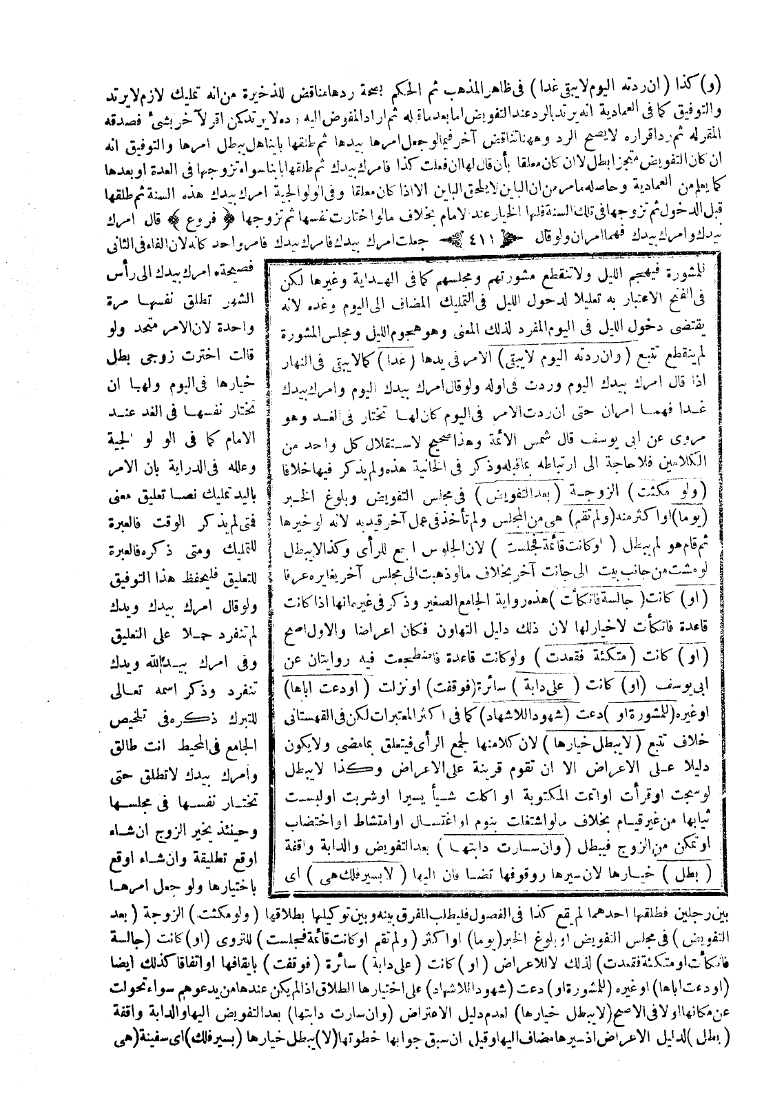 (وَلَوْ مَكَثَتْ) الزَّوْجَةُ (بَعْدَ التَّفْوِيضِ) فِي مَجْلِسِ التَّفْوِيضِ وَبُلُوغِ الْخَبَرِ (يَوْمًا) أَوْ أَكْثَرَ مِنْهُ (وَلَمْ تَقُمْ) هِيَ مِنْ الْمَجْلِسِ وَلَمْ تَأْخُذْ فِي عَمَلٍ آخَرَ قَيَّدَ بِهِ؛ لِأَنَّهُ لَوْ خَيَّرَهَا ثُمَّ قَامَ هُوَ لَمْ يَبْطُلْ (لَوْ كَانَتْ قَائِمَةً فَجَلَسَتْ) ؛ لِأَنَّ الْجُلُوسَ أَجْمَعُ لِلرَّأْيِ وَكَذَا لَا يَبْطُلُ لَوْ مَشَتْ مِنْ جَانِبِ بَيْتٍ إلَى جَانِبِ آخَرَ بِخِلَافِ مَا لَوْ ذَهَبَتْ إلَى مَجْلِسٍ آخَرَ يُغَايِرُهُ عُرْفًا (أَوْ) كَانَتْ (جَالِسَةً فَاتَّكَأَتْ) هَذِهِ رِوَايَةُ الْجَامِعِ الصَّغِيرِ وَذُكِرَ فِي غَيْرِهِ أَنَّهَا إذَا كَانَتْ قَاعِدَةً فَاتَّكَأَتْ لَا خِيَارَ لَهَا؛ لِأَنَّ ذَلِكَ دَلِيلُ التَّهَاوُنِ فَكَانَ إعْرَاضًا وَالْأَوَّلُ أَصَحُّ (أَوْ) كَانَتْ (مُتَّكِئَةً فَقَعَدَتْ) وَلَوْ كَانَتْ قَاعِدَةً فَاضْطَجَعَتْ فِيهِ رِوَايَتَانِ عَنْ أَبِي يُوسُفَ (أَوْ) كَانَتْ (عَلَى دَابَّةٍ) سَائِرَةٍ (فَوَقَفَتْ) أَوْ نَزَلَتْ (أَوْ دَعَتْ أَبَاهَا) أَوْ غَيْرَهُ (لِلْمَشُورَةِ أَوْ) دَعَتْ (شُهُودًا لِلْإِشْهَادِ) كَمَا فِي أَكْثَرِ الْمُعْتَبَرَاتِ. لَكِنْ فِي الْقُهُسْتَانِيِّ خِلَافٌ تَتَبَّعْ (لَا يَبْطُلُ خِيَارُهَا) ؛ لِأَنَّ كُلًّا مِنْهَا لِجَمْعِ الرَّأْيِ فَيَتَعَلَّقُ بِمَا مَضَى وَلَا يَكُونُ دَلِيلًا عَلَى الْإِعْرَاضِ إلَّا أَنْ تَقُومَ قَرِينَةٌ عَلَى الْإِعْرَاضِ وَكَذَا لَا يَبْطُلُ لَوْ سَبَّحَتْ أَوْ قَرَأَتْ أَوْ أَتَمَّتْ الْمَكْتُوبَةَ أَوْ أَكَلَتْ شَيْئًا يَسِيرًا أَوْ شَرِبَتْ أَوْ لَبِسَتْ ثِيَابَهَا مِنْ غَيْرِ قِيَامٍ بِخِلَافِ مَا لَوْ اشْتَغَلَتْ بِنَوْمٍ أَوْ اغْتِسَالٍ أَوْ امْتِشَاطٍ أَوْ اخْتِضَابٍ أَوْ تَمَكُّنٍ مِنْ الزَّوْجِ فَيَبْطُلُ.