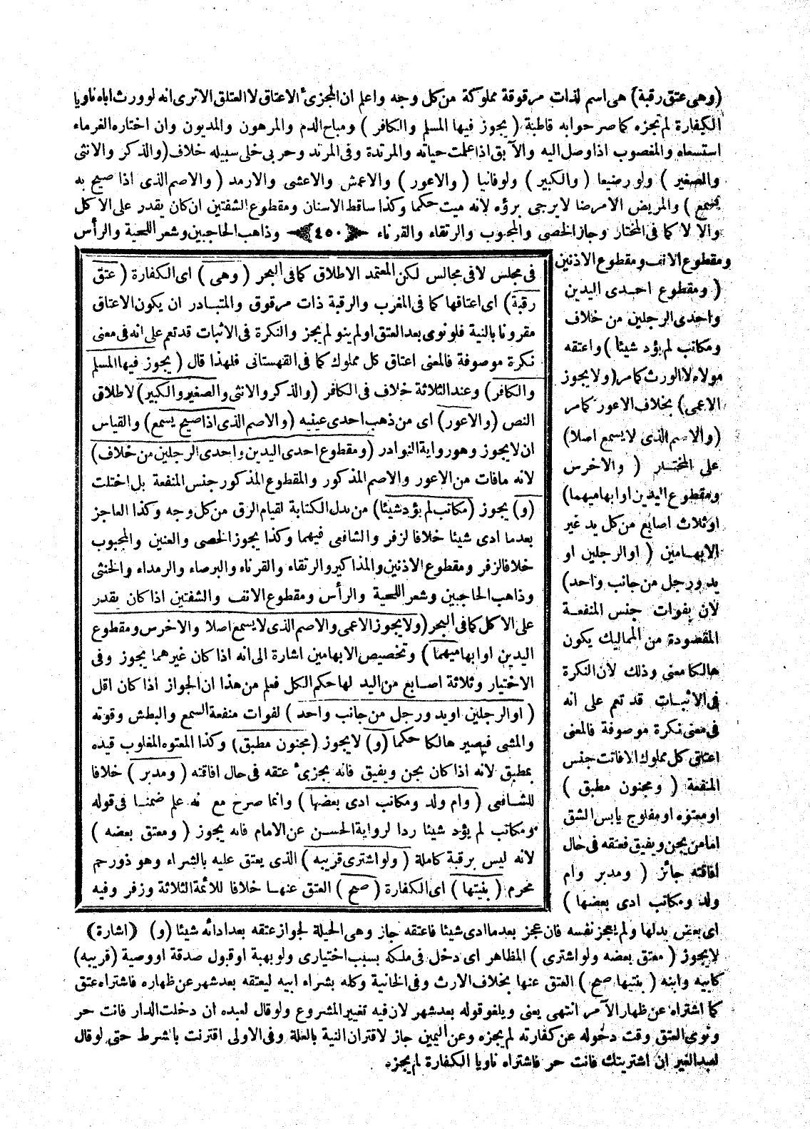 فِي مَجْلِسٍ لَا فِي مَجَالِسَ لَكِنَّ الْمُعْتَمَدَ الْإِطْلَاقُ كَمَا فِي الْبَحْرِ (وَهِيَ) أَيْ الْكَفَّارَةُ (عِتْقُ رَقَبَةٍ) أَيْ إعْتَاقُهَا كَمَا فِي الْمُغْرِبِ، وَالرَّقَبَةُ ذَاتُ مَرْقُوقٍ وَالْمُتَبَادَرُ أَنْ يَكُونَ الْإِعْتَاقُ مَقْرُونًا بِالنِّيَّةِ فَلَوْ نَوَى بَعْدَ الْعِتْقِ أَوْ لَمْ يَنْوِ لَمْ يَجُزْ وَالنَّكِرَةُ فِي الْإِثْبَاتِ قَدْ تَعُمُّ عَلَى أَنَّهُ فِي مَعْنَى نَكِرَةٍ مَوْصُوفَةٍ فَالْمَعْنَى إعْتَاقُ كُلِّ مَمْلُوكٍ كَمَا فِي الْقُهُسْتَانِيِّ فَلِهَذَا قَالَ (يَجُوزُ فِيهَا الْمُسْلِمُ وَالْكَافِرُ) وَعِنْدَ الثَّلَاثَةِ خِلَافٌ فِي الْكَافِرِ (وَالذَّكَرُ وَالْأُنْثَى وَالصَّغِيرُ وَالْكَبِيرُ) لِإِطْلَاقِ النَّصِّ (وَالْأَعْوَرُ) أَيْ مَنْ ذَهَبَ إحْدَى عَيْنَيْهِ (وَالْأَصَمُّ الَّذِي إذَا صِيحَ يَسْمَعُ) وَالْقِيَاسُ أَنْ لَا يَجُوزَ وَهُوَ رِوَايَةُ النَّوَادِرِ (وَمَقْطُوعُ إحْدَى الْيَدَيْنِ وَإِحْدَى الرِّجْلَيْنِ مِنْ خِلَافٍ) ؛ لِأَنَّهُ مَا فَاتَ مِنْ الْأَعْوَرِ وَالْأَصَمِّ الْمَذْكُورِ وَالْمَقْطُوعِ الْمَذْكُورِ جِنْسُ الْمَنْفَعَةِ بَلْ اخْتَلَّتْ.