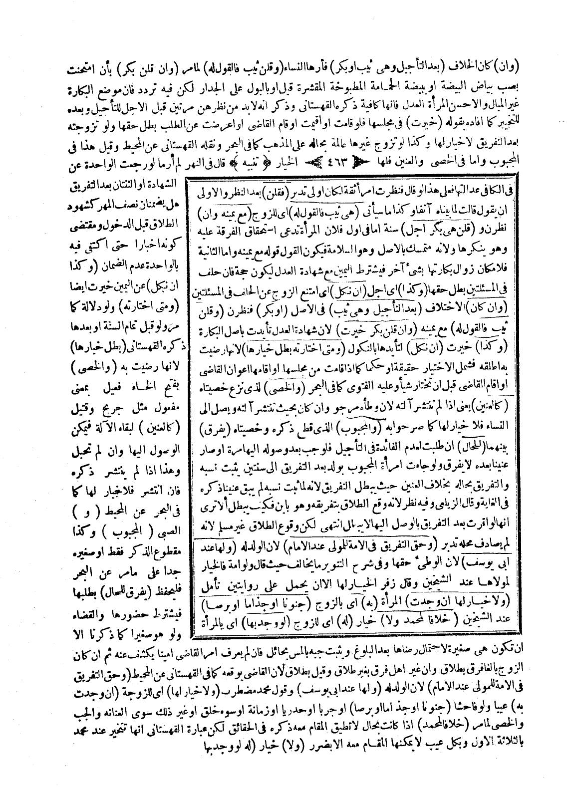 (وَلَا خِيَارَ لَهَا إنْ وَجَدَتْ) الْمَرْأَةُ (بِهِ) أَيْ بِالزَّوْجِ (جُنُونًا أَوْ جُذَامًا أَوْ بَرَصًا) عِنْدَ الشَّيْخَيْنِ (خِلَافًا لِمُحَمَّدٍ وَلَا) خِيَارَ (لَهُ) أَيْ لِلزَّوْجِ (لَوْ وَجَدَ بِهَا) أَيْ بِالْمَرْأَةِ