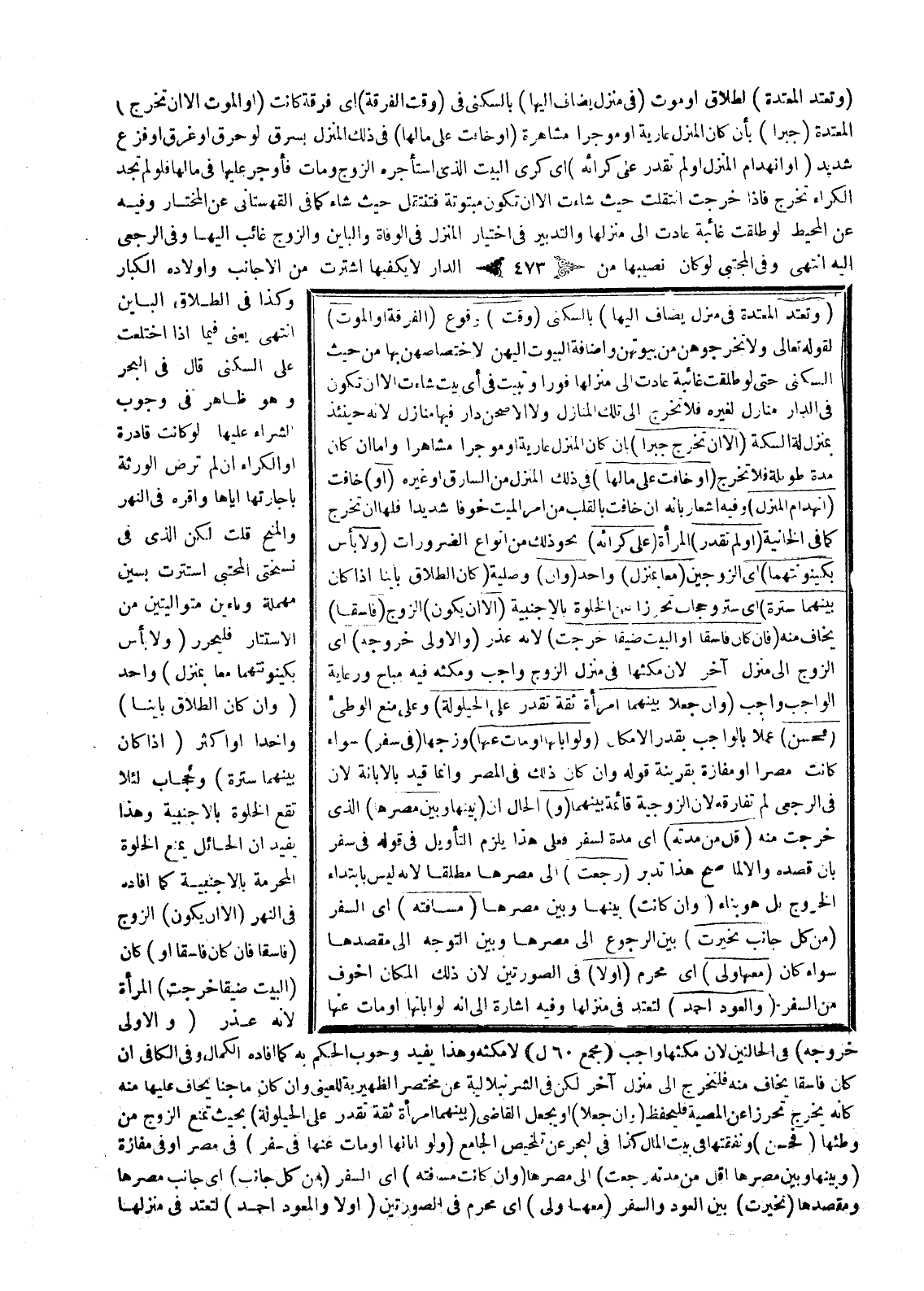 (وَتَعْتَدُّ الْمُعْتَدَّةُ فِي مَنْزِلٍ يُضَافُ إلَيْهَا) بِالسُّكْنَى (وَقْتَ) وُقُوعِ (الْفُرْقَةِ وَالْمَوْتِ) لِقَوْلِهِ تَعَالَى {لا تُخْرِجُوهُنَّ مِنْ بُيُوتِهِنَّ} [الطلاق: 1] وَإِضَافَةُ الْبُيُوتِ إلَيْهِنَّ لِاخْتِصَاصِهِنَّ بِهَا مِنْ حَيْثُ السُّكْنَى حَتَّى لَوْ طَلُقَتْ غَائِبَةً عَادَتْ إلَى مَنْزِلِهَا فَوْرًا وَتَبِيتُ فِي أَيِّ بَيْتٍ شَاءَتْ إلَّا أَنْ تَكُونَ فِي الدَّارِ مَنَازِلُ لِغَيْرِهِ فَلَا تَخْرُجُ إلَى تِلْكَ الْمَنَازِلِ وَلَا إلَّا صَحْنَ دَارٍ فِيهَا مَنَازِلُ؛ لِأَنَّهُ حِينَئِذٍ بِمَنْزِلٍ لَهُ السِّكَّةُ (إلَّا أَنْ تَخْرُجَ جَبْرًا) بِأَنْ كَانَ الْمَنْزِلُ عَارِيَّةً أَوْ مُؤَجَّرًا مُشَاهَرًا وَأَمَّا إنْ كَانَ مُدَّةً طَوِيلَةً فَلَا تَخْرُجُ (أَوْ خَافَتْ عَلَى مَالِهَا) فِي ذَلِكَ الْمَنْزِلِ مِنْ السَّارِقِ أَوْ غَيْرِهِ (أَوْ) خَافَتْ (انْهِدَامَ الْمَنْزِلِ) وَفِيهِ إشْعَارٌ بِأَنَّهُ إنْ خَافَتْ بِالْقَلْبِ مِنْ أَمْرِ الْمَبِيتِ خَوْفًا شَدِيدًا فَلَهَا أَنْ تَخْرُجَ كَمَا فِي الْخَانِيَّةِ (أَوْ لَمْ تَقْدِرْ) الْمَرْأَةُ (عَلَى كِرَائِهِ) نَحْوُ ذَلِكَ مِنْ أَنْوَاعِ الضَّرُورَاتِ (وَلَا بَأْسَ بِكَيْنُونَتِهِمَا) أَيْ الزَّوْجَيْنِ (مَعًا بِمَنْزِلٍ) وَاحِدٍ.