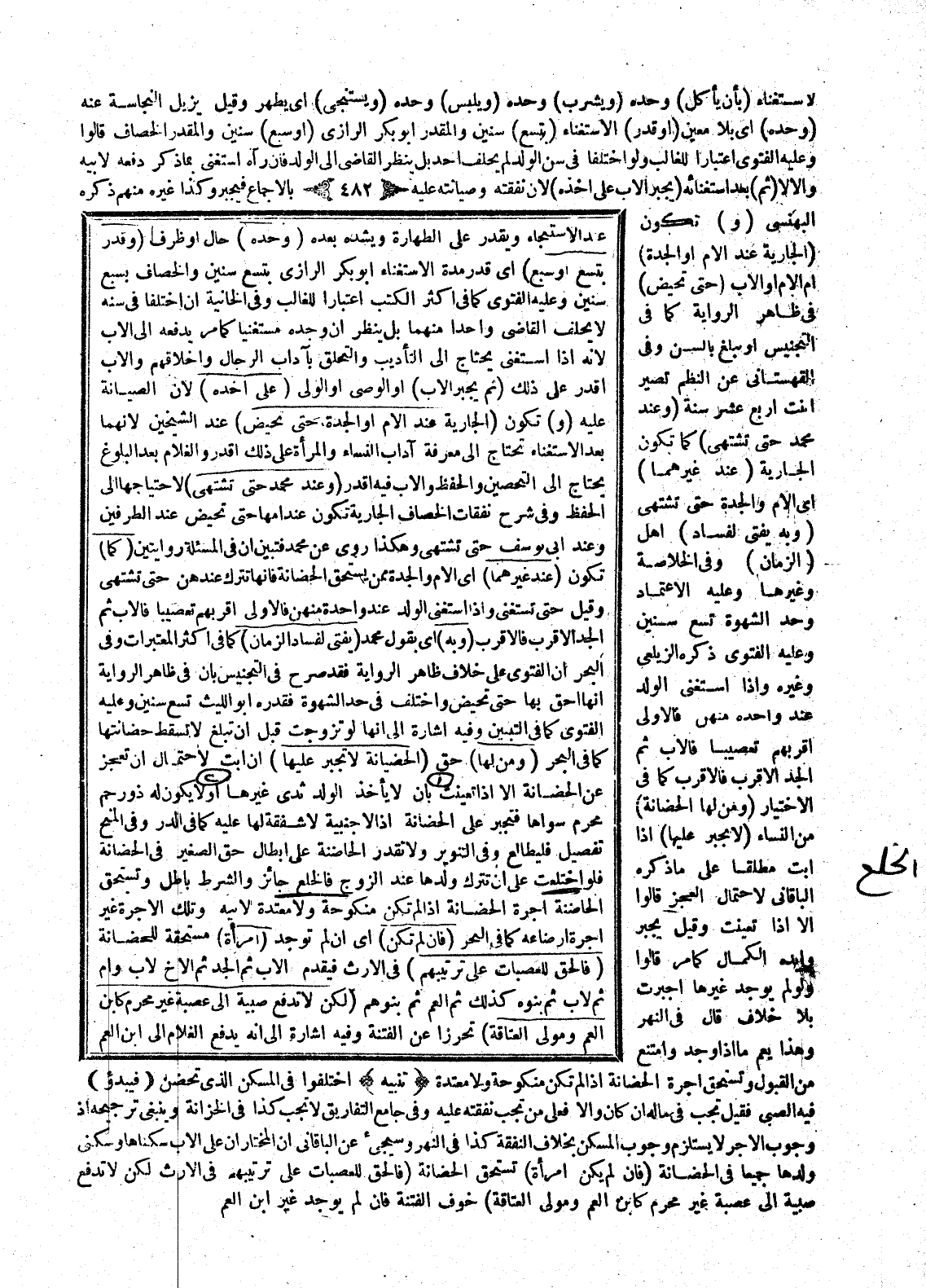 وَفِي شَرْحِ نَفَقَاتِ الْخَصَّافِ الْجَارِيَةُ تَكُونُ عِنْدَ أُمِّهَا حَتَّى تَحِيضَ عِنْدَ الطَّرَفَيْنِ وَعِنْدَ أَبِي يُوسُفَ حَتَّى تُشْتَهَى وَهَكَذَا رُوِيَ عَنْ مُحَمَّدٍ فَتَبَيَّنَ أَنَّ فِي الْمَسْأَلَةِ رِوَايَتَيْنِ (كَمَا) تَكُونُ (عِنْدَ غَيْرِهِمَا) أَيْ الْأُمِّ وَالْجَدَّةِ مِمَّنْ يَسْتَحِقُّ الْحَضَانَةَ، فَإِنَّهَا تُتْرَكُ عِنْدَهُنَّ حَتَّى تُشْتَهَى، وَقِيلَ حَتَّى تَسْتَغْنِيَ وَإِذَا اسْتَغْنَى الْوَلَدُ عِنْدَ وَاحِدَةٍ مِنْهُنَّ فَالْأَوْلَى أَقْرَبُهُمْ تَعْصِيبًا فَالْأَبُ ثُمَّ الْجَدُّ الْأَقْرَبُ فَالْأَقْرَبُ (وَبِهِ) أَيْ بِقَوْلِ مُحَمَّدٍ (يُفْتَى لِفَسَادِ الزَّمَانِ) كَمَا فِي أَكْثَرِ الْمُعْتَبَرَاتِ.