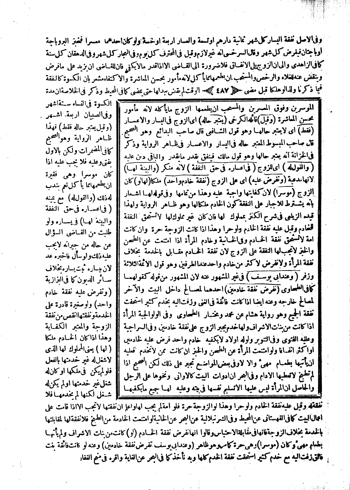 الْمُوسِرِينَ وَفَوْقَ الْمُعْسِرِينَ وَالْمُسْتَحَبُّ أَنْ يُطْعِمَهَا الزَّوْجُ مَا يَأْكُلُهُ؛ لِأَنَّهُ مَأْمُورٌ بِحُسْنِ الْمُعَاشَرَةِ (وَقِيلَ) قَائِلُهُ الْكَرْخِيُّ (يُعْتَبَرُ حَالُهُ) أَيْ الزَّوْجِ فِي الْيَسَارِ وَالْإِعْسَارِ (فَقَطْ) أَيْ لَا يُعْتَبَرُ حَالُهَا، وَهُوَ قَوْلُ الشَّافِعِيِّ قَالَ صَاحِبُ الْبَدَائِعِ وَهُوَ الصَّحِيحُ قَالَ صَاحِبُ الْمَبْسُوطِ الْمُعْتَبَرُ حَالُهُ فِي الْيَسَارِ وَالْإِعْسَارِ فِي ظَاهِرِ الرِّوَايَةِ، وَذُكِرَ فِي الْخِزَانَةِ أَنَّهُ يُعْتَبَرُ حَالُهَا، وَهُوَ قَوْلُ مَالِكٍ فَيُنْفِقُ بِقَدْرِ مَا يَقْدِرُ وَالْبَاقِي دَيْنٌ عَلَيْهِ (وَالْقَوْلُ لَهُ) أَيْ لِلزَّوْجِ (فِي إعْسَارِهِ فِي حَقِّ النَّفَقَةِ) ؛ لِأَنَّهُ مُنْكِرٌ (وَالْبَيِّنَةُ لَهَا) ؛ لِأَنَّهَا مُدَّعِيَةٌ (وَتُفْرَضُ عَلَيْهِ) أَيْ عَلَى الزَّوْجِ (نَفَقَةُ خَادِمٍ وَاحِدٍ) مِلْكًا (لَهَا لَوْ) كَانَ الزَّوْجُ (مُوسِرًا) ؛ لِأَنَّ كِفَايَتَهَا وَاجِبَةٌ عَلَيْهِ، وَهَذَا مِنْ تَمَامِهَا وَفِي قَوْلِهِ لَهَا إشْعَارٌ بِأَنَّهُ يُشْتَرَطُ لِلْإِجْبَارِ عَلَى النَّفَقَةِ كَوْنُ الْخَادِمِ مِلْكًا لَهَا، وَهُوَ ظَاهِرُ الرِّوَايَةِ وَلِهَذَا قَيَّدَهُ الزَّيْلَعِيُّ فِي شَرْحِ الْكَنْزِ بِمَمْلُوكٍ لَهَا فَإِنْ كَانَ غَيْرَ مَمْلُوكٍ لَهَا لَا تَسْتَحِقُّ النَّفَقَةَ لِلْخَادِمِ وَقِيلَ عَلَيْهِ نَفَقَةُ الْخَادِمِ وَلَوْ حُرًّا، وَهَذَا إذَا كَانَتْ الزَّوْجَةُ حُرَّةً، وَإِنْ كَانَتْ أَمَةً لَا تَسْتَحِقُّ نَفَقَةَ الْخَادِمِ.