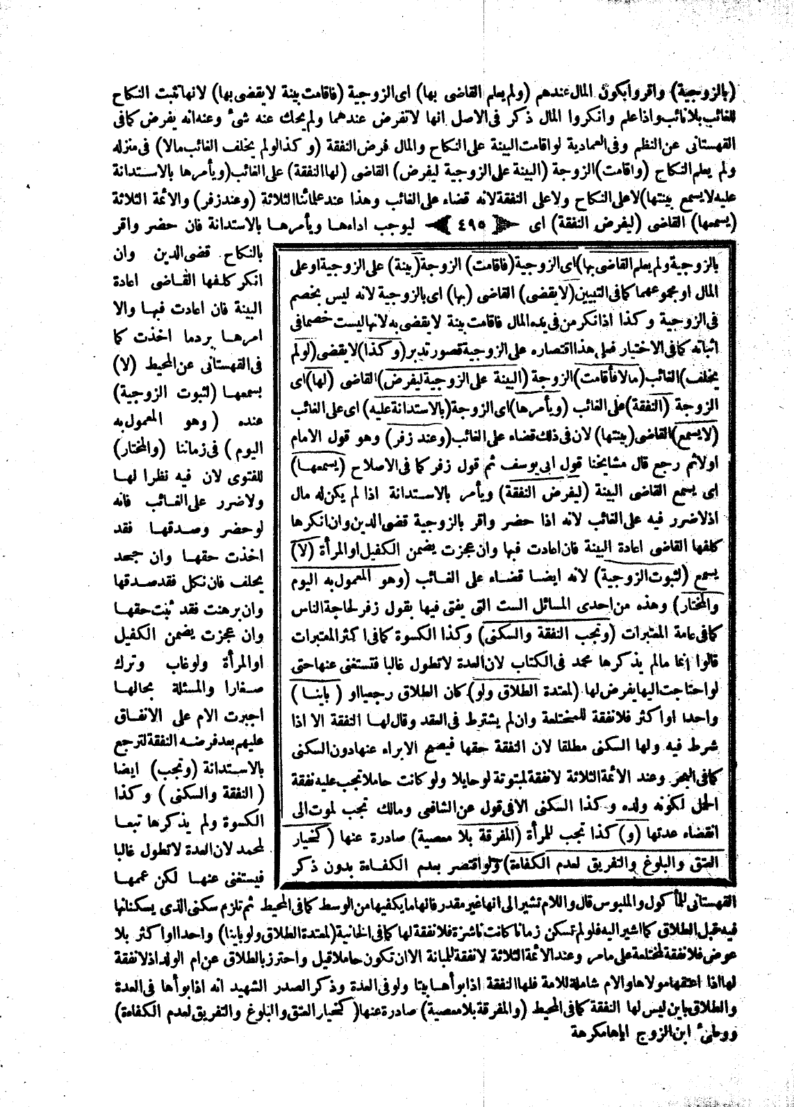 (وَكَذَا) لَا يَقْضِي (لَوْ لَمْ يُخْلِفْ) الْغَائِبُ (مَالًا فَأَقَامَتْ) الزَّوْجَةُ (الْبَيِّنَةَ عَلَى الزَّوْجِيَّةِ لِيَفْرِضَ) الْقَاضِي (لَهَا) أَيْ الزَّوْجَةِ (النَّفَقَةَ) عَلَى الْغَائِبِ (وَيَأْمُرَهَا) أَيْ الزَّوْجَةَ (بِالِاسْتِدَانَةِ عَلَيْهِ) أَيْ عَلَى الْغَائِبِ (لَا يَسْمَعُ) الْقَاضِي (بَيِّنَتَهَا) ؛ لِأَنَّ فِي ذَلِكَ قَضَاءً عَلَى الْغَائِبِ (وَعِنْدَ زُفَرَ) وَهُوَ قَوْلُ الْإِمَامِ أَوَّلًا ثُمَّ رَجَعَ قَالَ مَشَايِخُنَا قَوْلُ أَبِي يُوسُفَ ثُمَّ قَوْلُ زُفَرَ كَمَا فِي الْإِصْلَاحِ (يَسْمَعُهَا) أَيْ يَسْمَعُ الْقَاضِي الْبَيِّنَةَ (لِيَفْرِضَ النَّفَقَةَ) وَيَأْمُرَ بِالِاسْتِدَانَةِ إذَا لَمْ يَكُنْ لَهُ مَالٌ إذْ لَا ضَرَرَ فِيهِ عَلَى الْغَائِبِ؛ لِأَنَّهُ إذَا حَضَرَ وَأَقَرَّ بِالزَّوْجِيَّةِ قَضَى الدَّيْنَ وَإِنْ أَنْكَرَهَا كَلَّفَهَا الْقَاضِي إعَادَةَ الْبَيِّنَةِ فَإِنْ أَعَادَتْ فَبِهَا، وَإِنْ عَجَزَتْ يَضْمَنُ الْكَفِيلُ أَوْ الْمَرْأَةُ (لَا) يَسْمَعُ (لِثُبُوتِ الزَّوْجِيَّةِ) ؛ لِأَنَّهُ أَيْضًا قَضَاءٌ عَلَى الْغَائِبِ (وَهُوَ الْمَعْمُولُ بِهِ الْيَوْمَ وَالْمُخْتَارُ) وَهَذِهِ مِنْ إحْدَى الْمَسَائِلِ السِّتِّ الَّتِي يُفْتَى فِيهَا بِقَوْلِ زُفَرَ لِحَاجَةِ النَّاسِ كَمَا فِي عَامَّةِ الْمُعْتَبَرَاتِ (وَتَجِبُ النَّفَقَةُ وَالسُّكْنَى) وَكَذَا الْكِسْوَةُ كَمَا فِي أَكْثَرِ الْمُعْتَبَرَاتِ قَالُوا إنَّمَا مَا لَمْ يَذْكُرْهَا مُحَمَّدٌ فِي الْكِتَابِ؛ لِأَنَّ الْعِدَّةَ لَا تَطُولُ غَالِبًا فَتَسْتَغْنِي عَنْهَا حَتَّى لَوْ احْتَاجَتْ إلَيْهَا يُفْرَضُ لَهَا (لِمُعْتَدَّةِ الطَّلَاقِ، وَلَوْ) كَانَ الطَّلَاقُ رَجْعِيًّا أَوْ (بَائِنًا) وَاحِدًا أَوْ أَكْثَرَ فَلَا نَفَقَةَ لِلْمُخْتَلِعَةِ وَإِنْ لَمْ يُشْتَرَطْ فِي الْعَقْدِ، وَقَالَ لَهَا النَّفَقَةُ إلَّا إذَا شُرِطَ فِيهِ، وَلَهَا السُّكْنَى مُطْلَقًا؛ لِأَنَّ النَّفَقَةَ حَقُّهَا فَيَصِحُّ الْإِبْرَاءُ عَنْهَا دُونَ السُّكْنَى كَمَا فِي الْبَحْرِ وَعِنْدَ الْأَئِمَّةِ الثَّلَاثَةِ لَا نَفَقَةَ لِمَبْتُوتَةٍ لَوْ حَائِلًا وَلَوْ كَانَتْ حَامِلًا تَجِبُ عَلَيْهِ نَفَقَةُ الْحَمْلِ لِكَوْنِهِ وَلَدَهُ وَكَذَا السُّكْنَى إلَّا فِي قَوْلٍ عَنْ الشَّافِعِيِّ وَمَالِكٍ تَجِبُ لِمَوْتٍ إلَى انْقِضَاءِ عِدَّتِهَا (وَ) كَذَا تَجِبُ لِلْمَرْأَةِ (الْمُفَرَّقَةِ بِلَا مَعْصِيَةٍ) صَادِرَةٍ عَنْهَا (كَخِيَارِ الْعِتْقِ وَالْبُلُوغِ وَالتَّفْرِيقِ لِعَدَمِ الْكَفَاءَةِ) وَلَوْ اقْتَصَرَ بِعَدَمِ الْكَفَاءَةِ بِدُونِ ذِكْرِ
