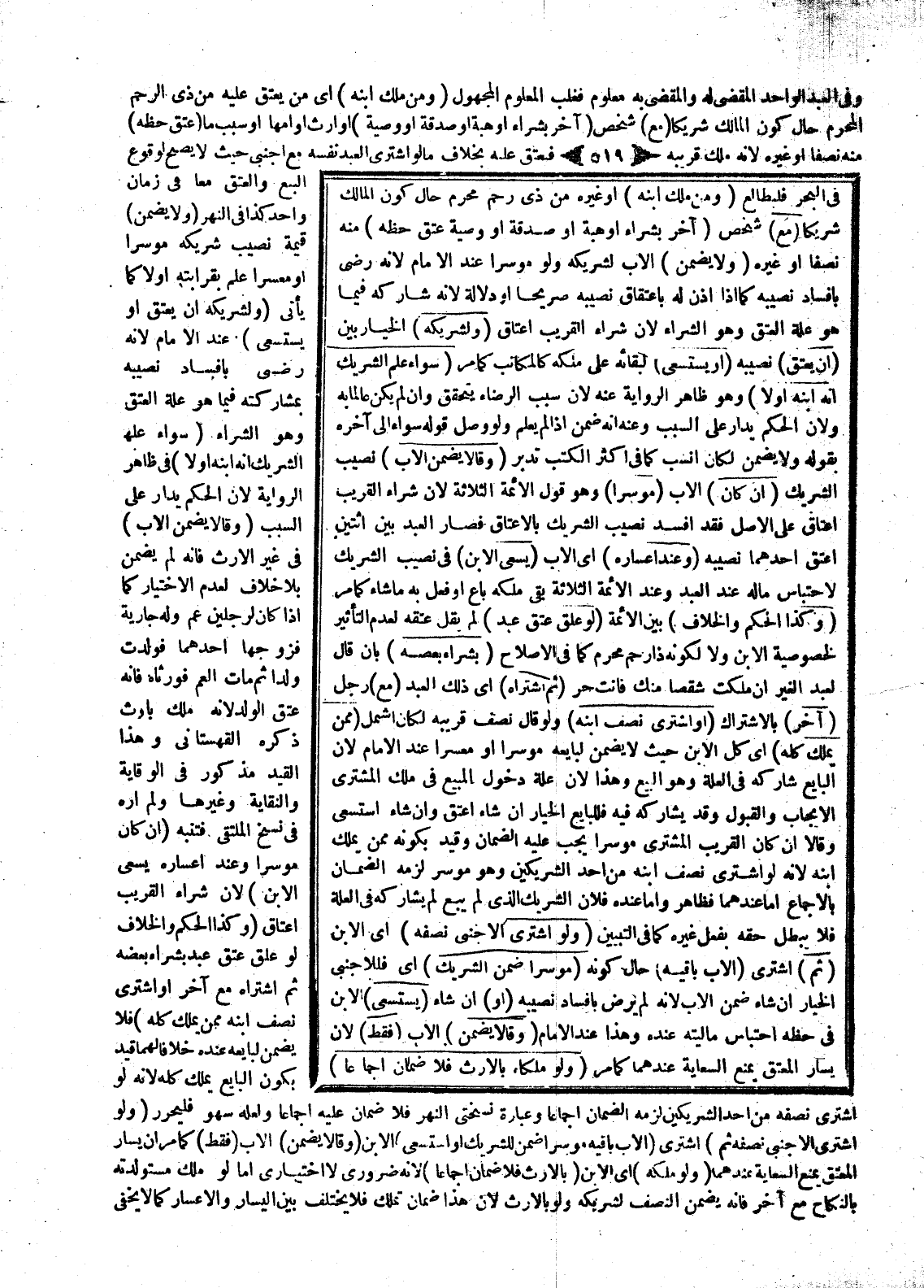 (وَمَنْ مَلَكَ ابْنَهُ) أَوْ غَيْرَهُ مِنْ ذِي رَحِمٍ مَحْرَمٍ حَالَ كَوْنِ الْمَالِكِ شَرِيكًا (مَعَ) شَخْصٍ (آخَرَ بِشِرَاءٍ أَوْ هِبَةٍ أَوْ صَدَقَةٍ أَوْ وَصِيَّةٍ عَتَقَ حَظُّهُ) مِنْهُ نِصْفًا أَوْ غَيْرَهُ (وَلَا يَضْمَنُ) الْأَبُ لِشَرِيكِهِ وَلَوْ مُوسِرًا عِنْدَ الْإِمَامِ؛ لِأَنَّهُ رَضِيَ بِإِفْسَادِ نَصِيبِهِ كَمَا إذَا أَذِنَ لَهُ بِإِعْتَاقِ نَصِيبِهِ صَرِيحًا أَوْ دَلَالَةً؛ لِأَنَّهُ شَارَكَهُ فِيمَا هُوَ عِلَّةُ الْعِتْقِ وَهُوَ الشِّرَاءُ؛ لِأَنَّ شِرَاءَ الْقَرِيبِ إعْتَاقٌ (وَلِشَرِيكِهِ) الْخِيَارُ بَيْنَ (أَنْ يُعْتِقَ) نَصِيبَهُ (أَوْ يَسْتَسْعِيَ) لِبَقَائِهِ عَلَى مِلْكِهِ كَالْمُكَاتَبِ كَمَا مَرَّ (سَوَاءٌ عَلِمَ الشَّرِيكُ أَنَّهُ ابْنُهُ أَوْ لَا) وَهُوَ ظَاهِرُ الرِّوَايَةِ عَنْهُ؛ لِأَنَّ سَبَبَ الرِّضَاءِ يَتَحَقَّقُ وَإِنْ لَمْ يَكُنْ عَالِمًا بِهِ وَلِأَنَّ الْحُكْمَ يُدَارُ عَلَى السَّبَبِ، وَعَنْهُ أَنَّهُ ضَمِنَ إذَا لَمْ يَعْلَمْ وَلَوْ وَصَلَ قَوْلُهُ سَوَاءٌ إلَى آخِرِهِ بِقَوْلِهِ وَلَا يَضْمَنُ لَكَانَ أَنْسَبَ كَمَا فِي أَكْثَرِ الْكُتُبِ تَدَبَّرْ (وَقَالَا يَضْمَنُ الْأَبُ) نَصِيبَ الشَّرِيكِ (إنْ كَانَ) الْأَبُ (مُوسِرًا) وَهُوَ قَوْلُ الْأَئِمَّةِ الثَّلَاثَةِ؛ لِأَنَّ شِرَاءَ الْقَرِيبِ إعْتَاقٌ عَلَى الْأَصْلِ فَقَدْ أَفْسَدَ نَصِيبَ الشَّرِيكِ بِالْإِعْتَاقِ فَصَارَ الْعَبْدُ بَيْنَ اثْنَيْنِ أَعْتَقَ أَحَدُهُمَا نَصِيبَهُ (وَعِنْدَ إعْسَارِهِ) أَيْ الْأَبِ (يَسْعَى الِابْنُ) فِي نَصِيبِ الشَّرِيكِ لِاحْتِبَاسِ مَالِهِ عِنْدَ الْعَبْدِ وَعِنْدَ الْأَئِمَّةِ الثَّلَاثَةِ بَقِيَ مِلْكُهُ بَاعَ أَوْ فَعَلَ بِهِ مَا شَاءَ كَمَا مَرَّ.