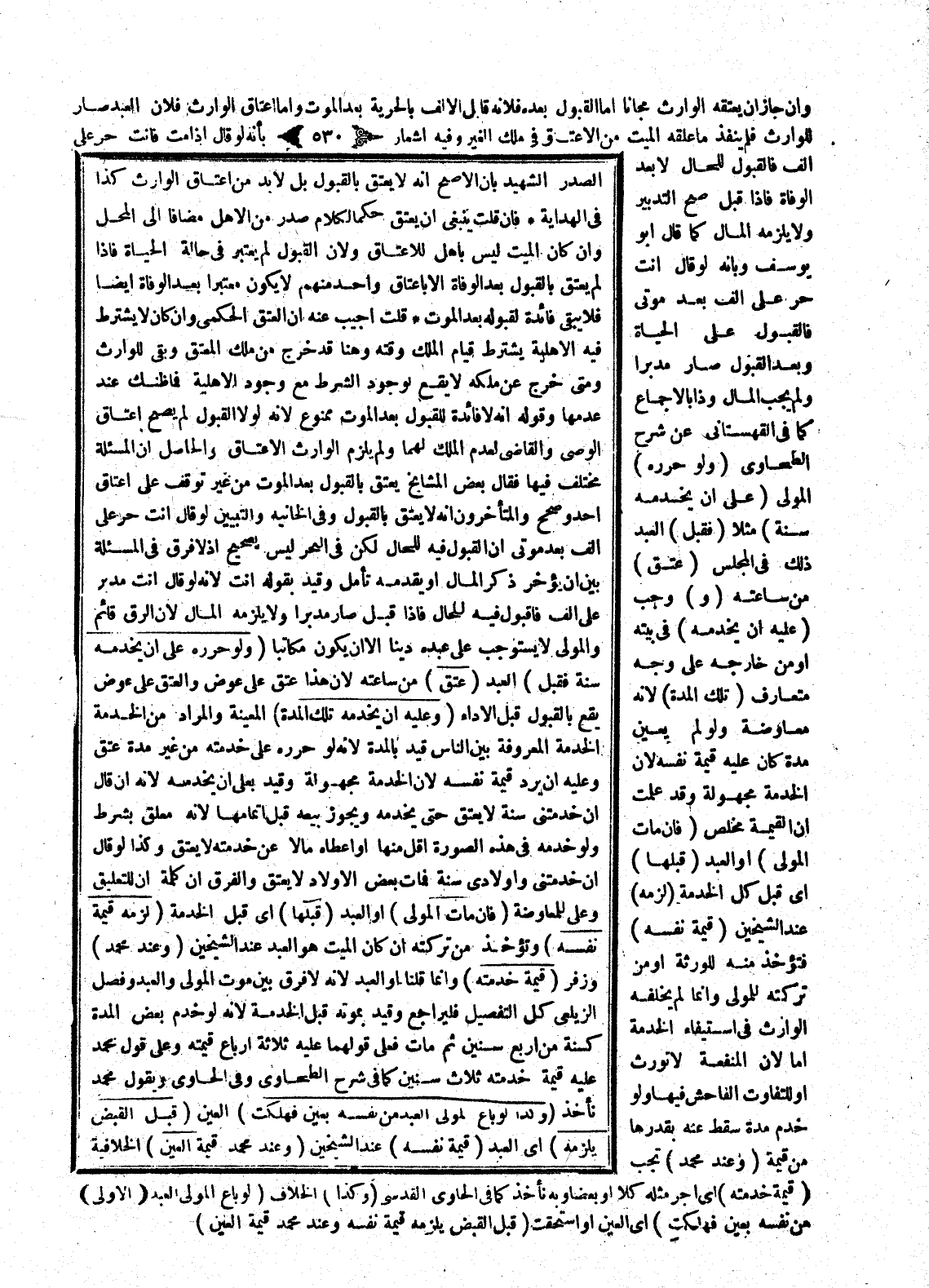 (وَلَوْ حَرَّرَهُ عَلَى أَنْ يَخْدُمَهُ سَنَةً فَقَبِلَ) الْعَبْدُ (عَتَقَ) مِنْ سَاعَتِهِ؛ لِأَنَّ هَذَا عِتْقٌ عَلَى عِوَضٍ وَالْعِتْقُ عَلَى عِوَضٍ يَقَعُ بِالْقَبُولِ قَبْلَ الْأَدَاءِ (وَعَلَيْهِ أَنْ يَخْدُمَهُ تِلْكَ الْمُدَّةِ) الْمُعَيَّنَةِ، وَالْمُرَادُ مِنْ الْخِدْمَةِ الْخِدْمَةُ الْمَعْرُوفَةُ بَيْنَ النَّاسِ، قُيِّدَ بِالْمُدَّةِ؛ لِأَنَّهُ لَوْ حَرَّرَهُ عَلَى خِدْمَتِهِ مِنْ غَيْرِ مُدَّةٍ عَتَقَ وَعَلَيْهِ أَنْ يَرُدَّ قِيمَةَ نَفْسِهِ؛ لِأَنَّ الْخِدْمَةَ مَجْهُولَةٌ، وَقُيِّدَ بِعَلَى أَنْ يَخْدُمَهُ؛ لِأَنَّهُ إنْ قَالَ إنْ خَدَمْتنِي سَنَةً لَا يُعْتَقُ حَتَّى يَخْدُمَهُ، وَيَجُوزُ بَيْعُهُ قَبْلَ إتْمَامِهَا؛ لِأَنَّهُ مُعَلَّقٌ بِشَرْطٍ وَلَوْ خَدَمَهُ فِي هَذِهِ الصُّورَةِ أَقَلَّ مِنْهَا أَوْ أَعْطَاهُ مَالًا عَنْ خِدْمَتِهِ لَا يُعْتَقُ، وَكَذَا لَوْ قَالَ إنْ خَدَمْتنِي وَأَوْلَادِي سَنَةً فَمَاتَ بَعْضُ الْأَوْلَادِ لَا يُعْتَقُ، وَالْفَرْقُ أَنَّ كَلِمَةَ إنْ لِلتَّعْلِيقِ وَعَلَى لِلْمُعَاوَضَةِ (فَإِنْ مَاتَ الْمَوْلَى) أَوْ الْعَبْدُ، (قَبْلَهَا) أَيْ قَبْلَ الْخِدْمَةِ (لَزِمَهُ قِيمَةُ نَفْسِهِ) وَتُؤْخَذُ مِنْ تَرِكَتِهِ إنْ كَانَ الْمَيِّتُ هُوَ الْعَبْدُ عِنْدَ الشَّيْخَيْنِ (وَعِنْدَ مُحَمَّدٍ) وَزُفَرَ (قِيمَةُ خِدْمَتِهِ) وَإِنَّمَا قُلْنَا أَوْ الْعَبْدُ؛ لِأَنَّهُ لَا فَرْقَ بَيْنَ مَوْتِ الْمَوْلَى وَالْعَبْدِ، وَفَصَّلَ الزَّيْلَعِيُّ كُلَّ التَّفْصِيلِ فَلْيُرَاجَعْ. وَقُيِّدَ بِمَوْتِهِ قَبْلَ الْخِدْمَةِ؛ لِأَنَّهُ لَوْ خَدَمَ بَعْضَ الْمُدَّةِ كَسَنَةٍ مِنْ أَرْبَعِ سِنِينَ ثُمَّ مَاتَ فَعَلَى قَوْلِهِمَا عَلَيْهِ ثَلَاثَةُ أَرْبَاعِ قِيمَتِهِ وَعَلَى قَوْلِ مُحَمَّدٍ عَلَيْهِ قِيمَةُ خِدْمَتِهِ ثَلَاثَ سِنِينَ كَمَا فِي شَرْحِ الطَّحَاوِيِّ.