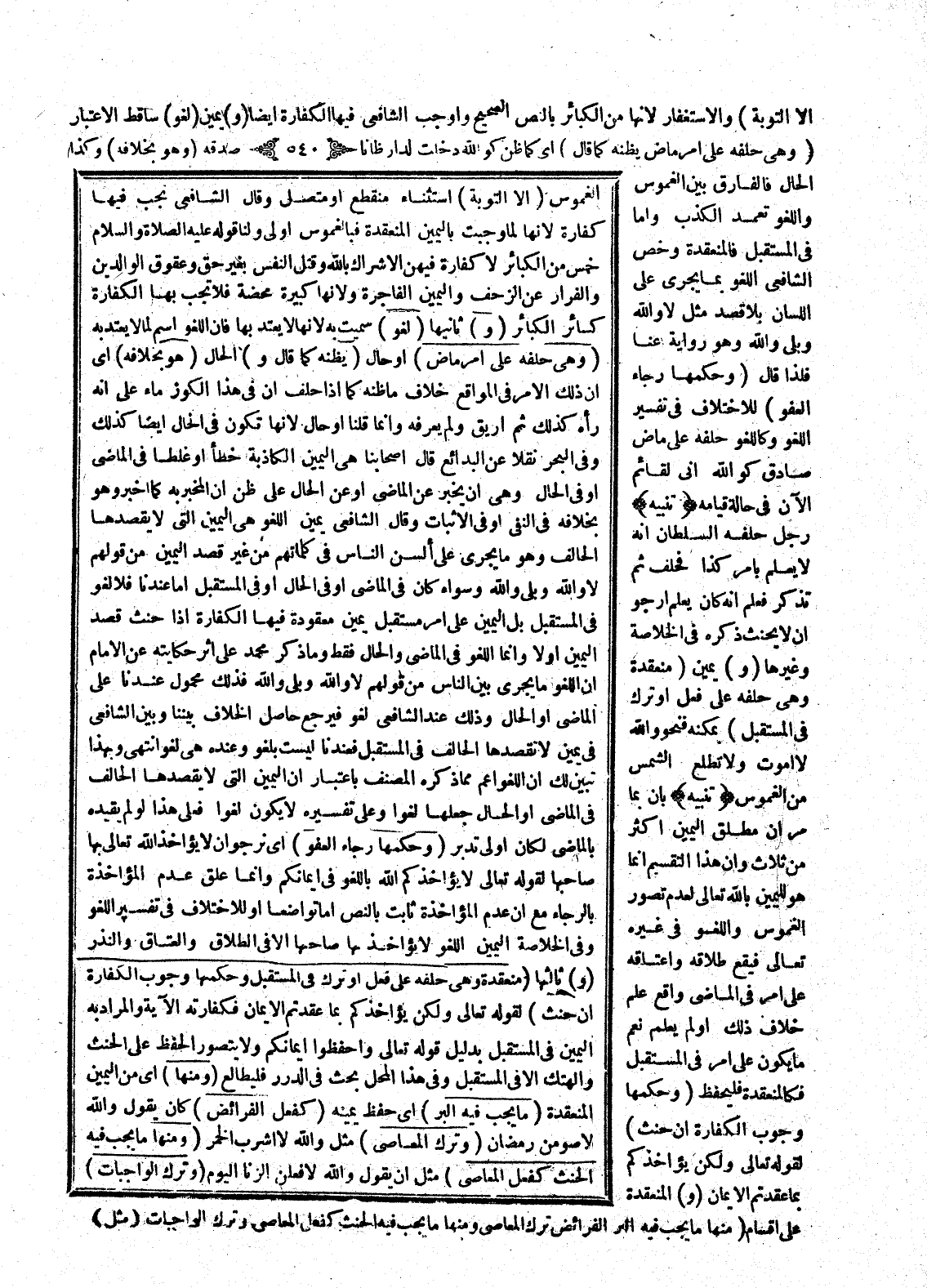 (وَ) ثَالِثُهَا (مُنْعَقِدَةٌ وَهِيَ حَلِفُهُ عَلَى فِعْلٍ أَوْ تَرْكٍ فِي الْمُسْتَقْبَلِ وَحُكْمُهَا وُجُوبُ الْكَفَّارَةِ إنْ حَنِثَ) لِقَوْلِهِ تَعَالَى {وَلَكِنْ يُؤَاخِذُكُمْ بِمَا عَقَّدْتُمُ الأَيْمَانَ فَكَفَّارَتُهُ} [المائدة: 89] الْآيَةَ وَالْمُرَادُ بِهِ الْيَمِينُ فِي الْمُسْتَقْبَلِ بِدَلِيلِ قَوْله تَعَالَى {وَاحْفَظُوا أَيْمَانَكُمْ} [المائدة: 89] وَلَا يُتَصَوَّرُ الْحِفْظُ عَلَى الْحِنْثِ وَالْهَتْكِ إلَّا فِي الْمُسْتَقْبَلِ وَفِي هَذَا الْمَحَلِّ بَحْثٌ فِي الدُّرَرِ فَلْيُطَالَعْ، (وَمِنْهَا) أَيْ مِنْ الْيَمِينِ الْمُنْعَقِدَةِ (مَا يَجِبُ فِيهِ الْبِرُّ) أَيْ حِفْظُ يَمِينِهِ (كَفِعْلِ الْفَرَائِضِ) كَأَنْ يَقُولَ وَاَللَّهِ لَأَصُومَنَّ رَمَضَانَ (وَتَرْكِ الْمَعَاصِي) مِثْلُ وَاَللَّهِ لَا أَشْرَبُ الْخَمْرَ (وَمِنْهَا مَا يَجِبُ فِيهِ الْحِنْثُ كَفِعْلِ الْمَعَاصِي) مِثْلُ أَنْ يَقُولَ وَاَللَّهِ لَأَفْعَلَنَّ الزِّنَا الْيَوْمَ (وَتَرْكُ الْوَاجِبَاتِ)