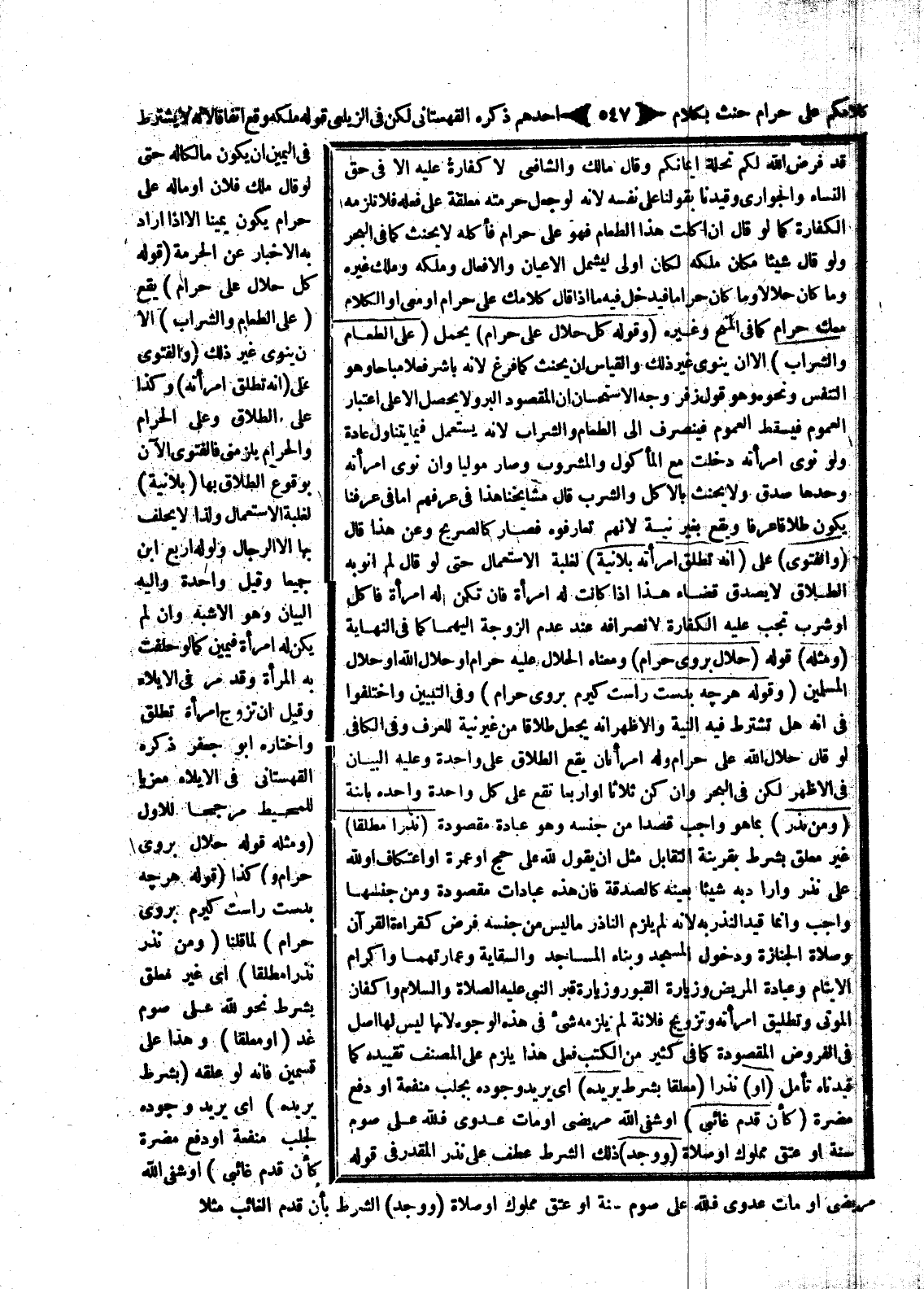 {قَدْ فَرَضَ اللَّهُ لَكُمْ تَحِلَّةَ أَيْمَانِكُمْ} [التحريم: 2] وَقَالَ مَالِكٌ وَالشَّافِعِيُّ لَا كَفَّارَةَ عَلَيْهِ إلَّا فِي حَقِّ النِّسَاءِ وَالْجَوَارِي، وَقَيَّدْنَا بِقَوْلِنَا عَلَى نَفْسِهِ؛ لِأَنَّهُ لَوْ جَعَلَ حُرْمَتَهُ مُعَلَّقَةً عَلَى فِعْلِهِ فَلَا تَلْزَمُهُ الْكَفَّارَةُ، كَمَا لَوْ قَالَ إنْ أَكَلْت هَذَا الطَّعَامَ فَهُوَ عَلَيَّ حَرَامٌ فَأَكَلَهُ لَا يَحْنَثُ كَمَا فِي الْبَحْرِ، وَلَوْ قَالَ شَيْئًا مَكَانَ مِلْكِهِ لَكَانَ أَوْلَى لِيَشْمَلَ الْأَعْيَانَ وَالْأَفْعَالَ وَمِلْكَهُ وَمِلْكَ غَيْرِهِ، وَمَا كَانَ حَلَالًا وَمَا كَانَ حَرَامًا فَيَدْخُلُ فِيهِ مَا إذَا قَالَ كَلَامُك عَلَيَّ حَرَامٌ أَوْ مَعِي أَوْ الْكَلَامُ مَعَك حَرَامٌ كَمَا فِي الْمِنَحِ وَغَيْرِهِ (وَقَوْلُهُ كُلُّ حَلَالٍ عَلَيَّ حَرَامٌ) يُحْمَلُ (عَلَى الطَّعَامِ وَالشَّرَابِ) إلَّا أَنْ يَنْوِيَ غَيْرَ ذَلِكَ وَالْقِيَاسُ أَنْ يَحْنَثَ كَمَا فَرَغَ؛ لِأَنَّهُ بَاشَرَ فِعْلًا مُبَاحًا وَهُوَ التَّنَفُّسُ وَنَحْوُهُ وَهُوَ قَوْلُ زُفَرَ، وَجْهُ الِاسْتِحْسَانِ أَنَّ الْمَقْصُودَ الْبِرُّ وَلَا يَحْصُلُ إلَّا عَلَى اعْتِبَارِ الْعُمُومِ فَيَسْقُطُ الْعُمُومُ فَيَنْصَرِفُ إلَى الطَّعَامِ وَالشَّرَابِ؛ لِأَنَّهُ يُسْتَعْمَلُ فِيمَا يُتَنَاوَلُ عَادَةً، وَلَوْ نَوَى امْرَأَتَهُ دَخَلَتْ مَعَ الْمَأْكُولِ وَالْمَشْرُوبِ وَصَارَ مُولِيًا وَإِنْ نَوَى امْرَأَتَهُ وَحْدَهَا صُدِّقَ وَلَا يَحْنَثُ بِالْأَكْلِ وَالشُّرْبِ قَالَ مَشَايِخُنَا هَذَا فِي عُرْفِهِمْ أَمَّا فِي عُرْفِنَا يَكُونُ طَلَاقًا عُرْفًا وَيَقَعُ بِغَيْرِ نِيَّةٍ؛ لِأَنَّهُمْ تَعَارَفُوهُ فَصَارَ كَالصَّرِيحِ وَعَنْ هَذَا قَالَ (وَالْفَتْوَى) عَلَى (أَنَّهُ تَطْلُقُ امْرَأَتُهُ بِلَا نِيَّةٍ) لِغَلَبَةِ الِاسْتِعْمَالِ حَتَّى لَوْ قَالَ لَمْ أَنْوِ بِهِ الطَّلَاقَ لَا يُصَدَّقُ قَضَاءً هَذَا إذَا كَانَتْ لَهُ امْرَأَةٌ فَإِنْ تَكُنْ لَهُ امْرَأَةٌ فَأَكَلَ أَوْ شَرِبَ تَجِبُ عَلَيْهِ الْكَفَّارَةُ لِانْصِرَافِهِ عِنْدَ عَدَمِ الزَّوْجَةِ إلَيْهِمَا كَمَا فِي النِّهَايَةِ (وَمِثْلُهُ) قَوْلُهُ (حَلَال بروى حرام) وَمَعْنَاهُ الْحَلَالُ عَلَيْهِ حَرَامُ أَوْ حَلَالُ اللَّهِ أَوْ حَلَالُ الْمُسْلِمِينَ (وَقَوْلُهُ هرجه بدست راست كيرم بروي حَرَامٌ) .