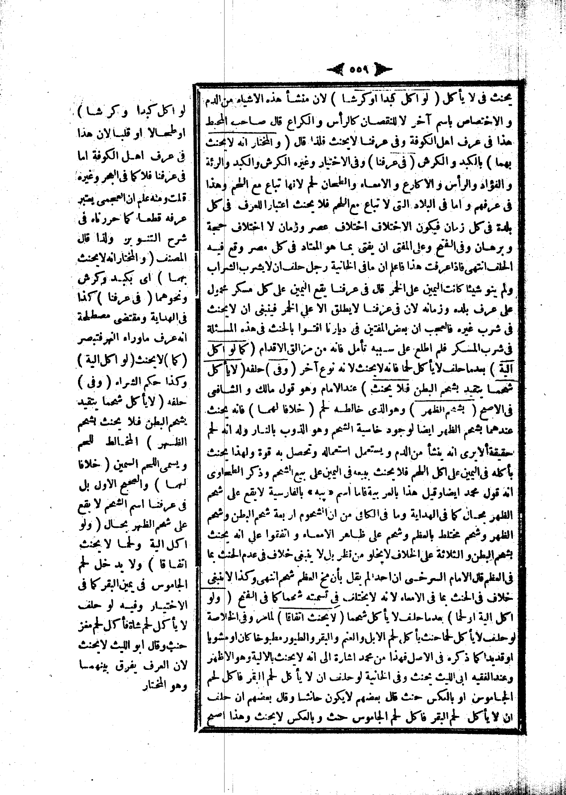 يَحْنَثُ فِي لَا يَأْكُلُ (لَوْ أَكَلَ كَبِدًا أَوْ كَرِشًا) ؛ لِأَنَّ مَنْشَأَ هَذِهِ الْأَشْيَاءِ مِنْ الدَّمِ، وَالِاخْتِصَاصُ بِاسْمِ آخَرَ لَا لِلنُّقْصَانِ كَالرَّأْسِ، وَالْكُرَاعِ قَالَ صَاحِبُ الْمُحِيطِ هَذَا فِي عُرْفِ أَهْلِ الْكُوفَةِ وَفِي عُرْفِنَا لَا يَحْنَثُ فَلِذَا قَالَ (، وَالْمُخْتَارُ أَنَّهُ لَا يَحْنَثُ بِهِمَا) بِالْكَبِدِ، وَالْكَرِشِ (فِي عُرْفِنَا) وَفِي الِاخْتِيَارِ وَغَيْرِهِ الْكَرِشُ، وَالْكَبِدُ، وَالرِّئَةُ، وَالْفُؤَادُ، وَالرَّأْسُ، وَالْأَكَارِعُ، وَالْأَمْعَاءُ، وَالطِّحَالُ لَحْمٌ؛ لِأَنَّهَا تُبَاعُ مَعَ اللَّحْمِ، وَهَذَا فِي عُرْفِهِمْ وَأَمَّا فِي الْبِلَادِ الَّتِي لَا تُبَاعُ مَعَ اللَّحْمِ فَلَا يَحْنَثُ اعْتِبَارًا لِلْعُرْفِ فِي كُلِّ بَلْدَةٍ فِي كُلِّ زَمَانٍ فَيَكُونُ الِاخْتِلَافُ اخْتِلَافَ عَصْرٍ وَزَمَانٍ لَا اخْتِلَافَ حُجَّةٍ وَبُرْهَانٍ.