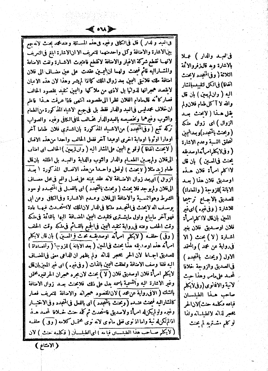 فِي الْعَبْدِ، وَالدَّارِ) قَالَ فِي الْكَافِي وَغَيْرِهِ فِي هَذِهِ الْمَسْأَلَةِ وَعِنْدَ مُحَمَّدٍ يَحْنَثُ؛ لِأَنَّهُ جَمَعَ بَيْنَ الْإِشَارَةِ، وَالْإِضَافَةِ وَكُلُّ وَاحِدٍ مِنْهُمَا لِلتَّعْرِيفِ إلَّا أَنَّ الْإِشَارَةَ أَبْلَغُ فِي التَّعْرِيفِ؛ لِأَنَّهَا تَقْطَعُ شَرِكَةَ الْأَغْيَارِ، وَالْإِضَافَةُ لَا تَقْطَعُ فَاعْتُبِرَتْ الْإِشَارَةُ وَلَغَتْ الْإِضَافَةُ، وَالْمُشَارُ إلَيْهِ قَائِمٌ فَيَحْنَثُ وَلَهُمَا أَنَّ الْيَمِينَ عُقِدَتْ عَلَى عَيْنٍ مُضَافٍ إلَى فُلَانٍ إضَافَةَ مِلْكٍ فَلَا تَبْقَى الْيَمِينُ بَعْدَ زَوَالِ الْمِلْكِ كَمَا إذَا لَمْ يُشِرْ، وَهَذَا؛ لِأَنَّ هَذِهِ الْأَعْيَانَ لَا يُقْصَدُ هِجْرَانُهَا لِذَوَاتِهَا، بَلْ لِأَذًى مِنْ مِلَاكهَا، وَالْيَمِينُ تَتَقَيَّدُ بِمَقْصُودِ الْحَالِفِ فَصَارَ كَأَنَّهُ قَالَ مَا دَامَ لِفُلَانٍ نَظَرًا إلَى مَقْصُودِهِ انْتَهَى فَإِذَا عَرَفْت هَذَا فَاعْلَمْ أَنَّ خِلَافَ مُحَمَّدٍ لَيْسَ فِي الْعَبْدِ، وَالدَّارِ فَقَطْ، بَلْ فِي جَمِيعِ الْأَشْيَاءِ الْمَذْكُورَةِ مِنْ الطَّعَامِ، وَالثَّوْبِ وَغَيْرِهِمَا وَتَخْصِيصُهُ بِالْعَبْدِ، وَالدَّارِ مُخَالِفٌ لِمَا فِي الْكَافِي وَغَيْرِهِ، وَالصَّوَابُ تَرْكُهُ تَتَبَّعْ (وَفِي الْمُتَجَدِّدِ) مِنْ الْأَشْيَاءِ الْمَذْكُورَةِ بِأَنْ اشْتَرَى فُلَانٌ طَعَامًا آخَرَ أَوْ دَارًا أَوْ ثَوْبًا أَوْ دَابَّةً أُخْرَى أَوْ عَبْدًا آخَرَ فَفَعَلَ الْحَالِفُ وَاحِدًا مِنْ هَذِهِ الْأَفْعَالِ (لَا يَحْنَثُ اتِّفَاقًا) لِوُقُوعِ الْيَمِينِ عَلَى الْمُشَارِ إلَيْهِ.