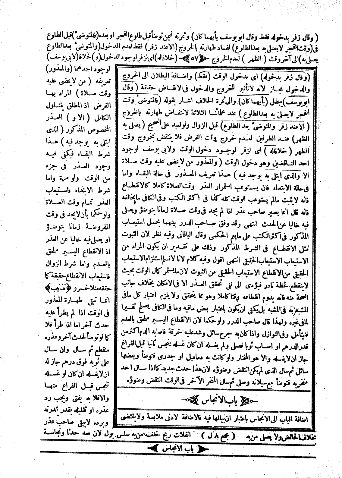 وَقَدْ وَفَّقَ صَاحِبُ الدُّرَرِ بَيْنَهُمَا بِحَمْلِ اسْتِيعَابِ الْمَذْكُورِ فِي أَكْثَرِ الْكُتُبِ عَلَى مَا يَعُمُّ الْحُكْمِيَّ، وَقَالَ الْبَاقَانِيُّ: وَفِيهِ نَظَرٌ؛ لِأَنَّ الثُّبُوتَ مِثْلُ الِانْقِطَاعِ فِي الشَّرْطِ الْمَذْكُورِ، وَذَلِكَ عَلَى تَقْدِيرِ أَنْ يَكُونَ الْمُرَادُ مِنْ الِاسْتِيعَابِ الِاسْتِيعَابَ الْحَقِيقِيَّ انْتَهَى أَقُولُ: وَفِيهِ كَلَامٌ؛ لِأَنَّا لَا نُسَلِّمُ اسْتِلْزَامَ الِاسْتِيعَابِ الْحَقِيقِيِّ مِنْ الِانْقِطَاعِ لِلِاسْتِيعَابِ الْحَقِيقِيِّ مِنْ الثُّبُوتِ؛ لِأَنَّ مَا يَسْتَمِرُّ كَمَالَ الْوَقْتِ بِحَيْثُ لَا يَنْقَطِعُ لَحْظَةً نَادِرٌ فَيُؤَدِّي إلَى نَفْيِ تَحَقُّقِ الْعُذْرِ إلَّا فِي الْإِمْكَانِ بِخِلَافِ جَانِبِ الصِّحَّةِ مِنْهُ فَإِنَّهُ يَدُومُ انْقِطَاعُهُ وَقْتًا كَامِلًا، وَهُوَ مَا يَتَحَقَّقُ وَلَا يَلْزَمُ اعْتِبَارُ كُلِّ مَا فِي الْمُشَبَّهِ بِهِ فِي الْمُشَبَّهِ بَلْ يَكْفِي أَنْ يَكُونَ بِاعْتِبَارِ بَعْضِ مَا فِيهِ، وَمَا فِي الْكَافِي يَصْلُحُ تَفْسِيرًا لِمَا فِي غَيْرِهِ؛ وَلِهَذَا قَالَ صَاحِبُ الدُّرَرِ: وَلَوْ حُكْمًا؛ لِأَنَّ الِانْقِطَاعَ الْيَسِيرَ مُلْحَقٌ بِالْعَدَمِ فَلْيُتَأَمَّلْ.