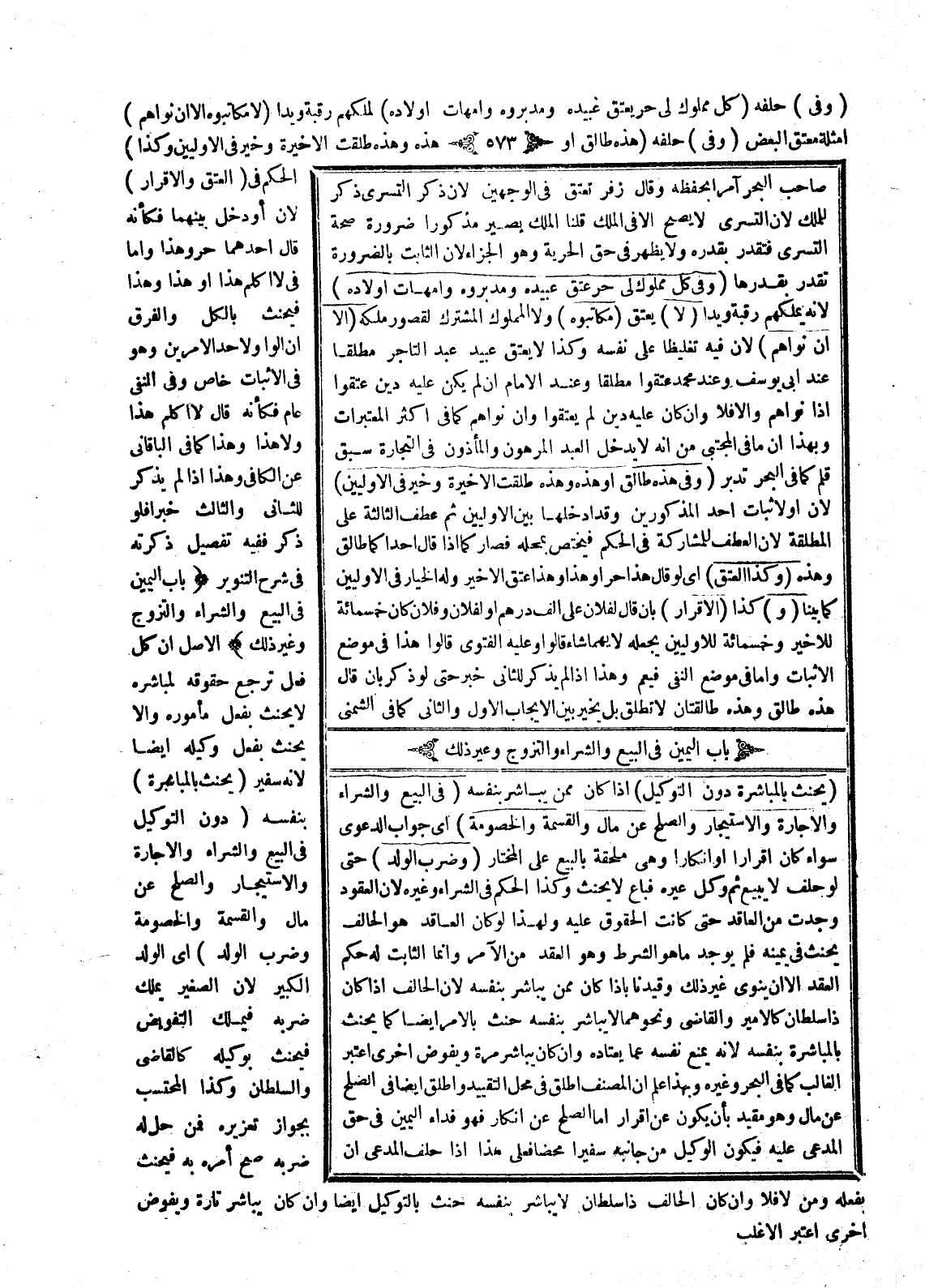 َ (يَحْنَثُ بِالْمُبَاشَرَةِ دُونَ التَّوْكِيلِ) إذَا كَانَ مِمَّنْ يُبَاشِرُ بِنَفْسِهِ (فِي الْبَيْعِ، وَالشِّرَاءِ، وَالْإِجَارَةِ، وَالِاسْتِئْجَارِ، وَالصُّلْحِ عَنْ مَالٍ، وَالْقِسْمَةِ، وَالْخُصُومَةِ) أَيْ جَوَابُ الدَّعْوَى سَوَاءٌ كَانَ إقْرَارًا أَوْ إنْكَارًا وَهِيَ مُلْحَقَةٌ بِالْبَيْعِ عَلَى الْمُخْتَارِ (وَضَرْبُ الْوَلَدِ) حَتَّى لَوْ حَلَفَ لَا يَبِيعُ، ثُمَّ وَكَّلَ غَيْرَهُ فَبَاعَ لَا يَحْنَثُ وَكَذَا الْحُكْمُ فِي الشِّرَاءِ وَغَيْرِهِ؛ لِأَنَّ الْعُقُودَ وُجِدَتْ مِنْ الْعَاقِدِ حَتَّى كَانَتْ الْحُقُوقُ عَلَيْهِ وَلِهَذَا لَوْ كَانَ الْعَاقِدُ هُوَ الْحَالِفُ يَحْنَثُ فِي يَمِينِهِ فَلَمْ يُوجَدْ مَا هُوَ الشَّرْطُ، وَهُوَ الْعَقْدُ مِنْ الْآمِرِ وَإِنَّمَا الثَّابِتُ لَهُ حُكْمُ الْعَقْدِ إلَّا أَنْ يَنْوِيَ غَيْرَ ذَلِكَ وَقَيَّدْنَا بِإِذَا كَانَ مِمَّنْ يُبَاشِرُ بِنَفْسِهِ؛ لِأَنَّ الْحَالِفَ إذَا كَانَ ذَا سُلْطَانٍ كَالْأَمِيرِ، وَالْقَاضِي وَنَحْوِهِمَا لَا يُبَاشِرُ بِنَفْسِهِ حَنِثَ بِالْأَمْرِ أَيْضًا كَمَا يَحْنَثُ بِالْمُبَاشَرَةِ بِنَفْسِهِ؛ لِأَنَّهُ يَمْنَعُ نَفْسَهُ عَمَّا يَعْتَادُهُ وَإِنْ كَانَ يُبَاشِرُ مَرَّةً وَيُفَوِّضُ أُخْرَى اُعْتُبِرَ الْغَالِبُ كَمَا فِي الْبَحْرِ وَغَيْرِهِ وَبِهَذَا عُلِمَ أَنَّ الْمُصَنِّفَ أَطْلَقَ فِي مَحَلِّ التَّقْيِيدِ وَأَطْلَقَ أَيْضًا فِي الصُّلْحِ عَنْ مَالٍ، وَهُوَ مُقَيَّدٌ بِأَنْ يَكُونَ عَنْ إقْرَارٍ أَمَّا الصُّلْحُ عَنْ إنْكَارٍ فَهُوَ فِدَاءُ الْيَمِينِ فِي حَقِّ الْمُدَّعَى عَلَيْهِ فَيَكُونُ الْوَكِيلُ مِنْ جَانِبِهِ سَفِيرًا مَحْضًا فَعَلَى هَذَا إذَا حَلَفَ الْمُدَّعِي أَنْ