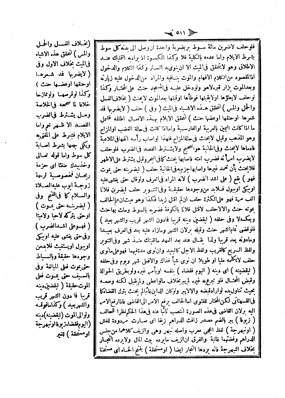 فَلَوْ حَلَفَ لَأَضْرِبَنَّ مِائَةَ سَوْطٍ بَرَّ بِضَرْبَةٍ وَاحِدَةٍ إنْ وَصَلَ إلَى بَدَنِهِ كُلُّ سَوْطٍ بِشَرْطِ الْإِيلَامِ وَأَمَّا عَدَمُهُ بِالْكُلِّيَّةِ فَلَا وَكَذَا الْكِسْوَةُ إذْ يُرَادُ بِهِ التَّمْلِيكُ عِنْدَ الْإِطْلَاقِ، وَهُوَ لَا يَتَحَقَّقُ فِي الْمَيِّتِ إلَّا أَنْ يَنْوِيَ بِهِ السَّتْرَ وَكَذَا الْكَلَامُ، وَالدُّخُولُ إذْ الْمَقْصُودُ مِنْ الْكَلَامِ الْإِفْهَامُ، وَالْمَوْتُ يُنَافِيهِ، وَالْمُرَادُ مِنْ الدُّخُولِ عَلَيْهِ زِيَارَتُهُ وَبَعْدَ الْمَوْتِ يُزَارُ قَبْرُهُ لَا هُوَ وَلَوْ دَخَلَ عَلَيْهِ فِي الْمَسْجِدِ حَنِثَ عَلَى الْمُخْتَارِ وَكَذَا لَوْ حَلَفَ لَا يَطَؤُهَا أَوْ لَا يُقَبِّلُهَا فَوَطْأَهَا أَوْ قَبَّلَهَا بَعْدَ الْمَوْتِ لَا يَحْنَثُ (بِخِلَافِ الْغُسْلِ، وَالْحَمْلِ، وَالْمَسِّ) لِتَحَقُّقِ هَذِهِ الْأَشْيَاءِ فِي الْمَيِّتِ (وَفِي) حَلَفَ (لَا يَضْرِبُهَا فَمَدَّ شَعْرَهَا أَوْ خَنَقَهَا أَوْ عَضَّهَا حَنِثَ) لِتَحَقُّقِ الْإِيلَامِ بِهَذِهِ الْأَفْعَالِ أَطْلَقَهُ فَشَمِلَ مَا إذَا كَانَتْ الْيَمِينُ بِالْعَرَبِيَّةِ أَوْ الْفَارِسِيَّةِ وَأَمَّا إذَا كَانَتْ فِي حَالَةِ الْغَصْبِ أَوْ الْمُزَاحِ، وَهُوَ الْمَذْهَبُ وَقِيلَ لَا يَحْنَثُ فِي حَالَةِ الْمُزَاحِ فَلِهَذَا لَوْ أَصَابَ رَأْسُهُ أَنْفَهَا فِي الْمُلَاعَبَةِ فَأَدْمَاهَا لَا يَحْنَثُ.