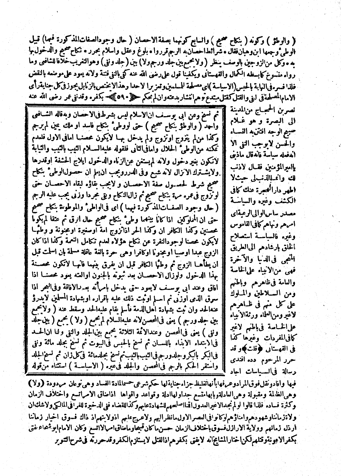 وَفِي الدُّرَرِ وَيَجِبُ أَنْ يَعْلَمَ أَنَّ حُصُولَ الْوَطْءِ بِنِكَاحٍ صَحِيحٍ شَرْطٌ لِحُصُولِ صِفَةِ الْإِحْصَانِ وَلَا يَجِبُ بَقَاؤُهُ لِبَقَاءِ الْإِحْصَانِ حَتَّى لَوْ تَزَوَّجَ فِي عُمْرِهِ مَرَّةً بِنِكَاحٍ صَحِيحٍ، ثُمَّ زَالَ النِّكَاحُ وَبَقِيَ مُجَرَّدًا وَزَنَى يَجِبُ عَلَيْهِ الرَّجْمُ (حَالَ وُجُودِ الصِّفَاتِ الْمَذْكُورَةِ فِيهِمَا) أَيْ فِي الْوَطِيءِ، وَالْمَوْطُوءَةِ بِنِكَاحٍ صَحِيحٍ حَتَّى إنَّ الْمَمْلُوكَيْنِ إذَا كَانَا بَيْنَهُمَا وَطْءٌ بِنِكَاحٍ صَحِيحٍ حَالَ الرِّقِّ، ثُمَّ عَتَقَا لَمْ يَكُونَا مُحْصَنَيْنِ وَكَذَا الْكَافِرَانِ وَكَذَا الْحُرُّ إذَا تَزَوَّجَ أَمَةً أَوْ صَغِيرَةً أَوْ مَجْنُونَةً وَوَطِئَهَا لَا يَكُونُ مُحْصَنًا لِوُجُودِ النُّفْرَةِ عَنْ نِكَاحِ هَؤُلَاءِ لِعَدَمِ تَكَامُلِ النِّعْمَةِ وَكَذَا إذَا كَانَ الزَّوْجُ عَبْدًا أَوْ صَبِيًّا أَوْ مَجْنُونًا أَوْ كَافِرًا وَهِيَ حُرَّةٌ بَالِغَةٌ عَاقِلَةٌ مُسْلِمَةٌ بِأَنْ أَسْلَمَتْ قَبْلَ أَنْ يَطَأَهَا الزَّوْجُ، ثُمَّ وَطِئَهَا الْكَافِرُ قَبْلَ أَنْ يُفَرَّقَ بَيْنَهُمَا فَإِنَّهَا لَا تَكُونُ مُحْصَنَةً بِهَذَا الدُّخُولِ وَلَوْ زَالَ الْإِحْصَانُ بَعْدَ ثُبُوتِهِ بِالْجُنُونِ أَوْ الْعَتَهِ يَعُودُ مُحْصَنًا إذَا أَفَاقَ وَعِنْدَ أَبِي يُوسُفَ لَا يَعُودُ حَتَّى يَدْخُلَ بِامْرَأَتِهِ بَعْدَ الْإِفَاقَةِ.
