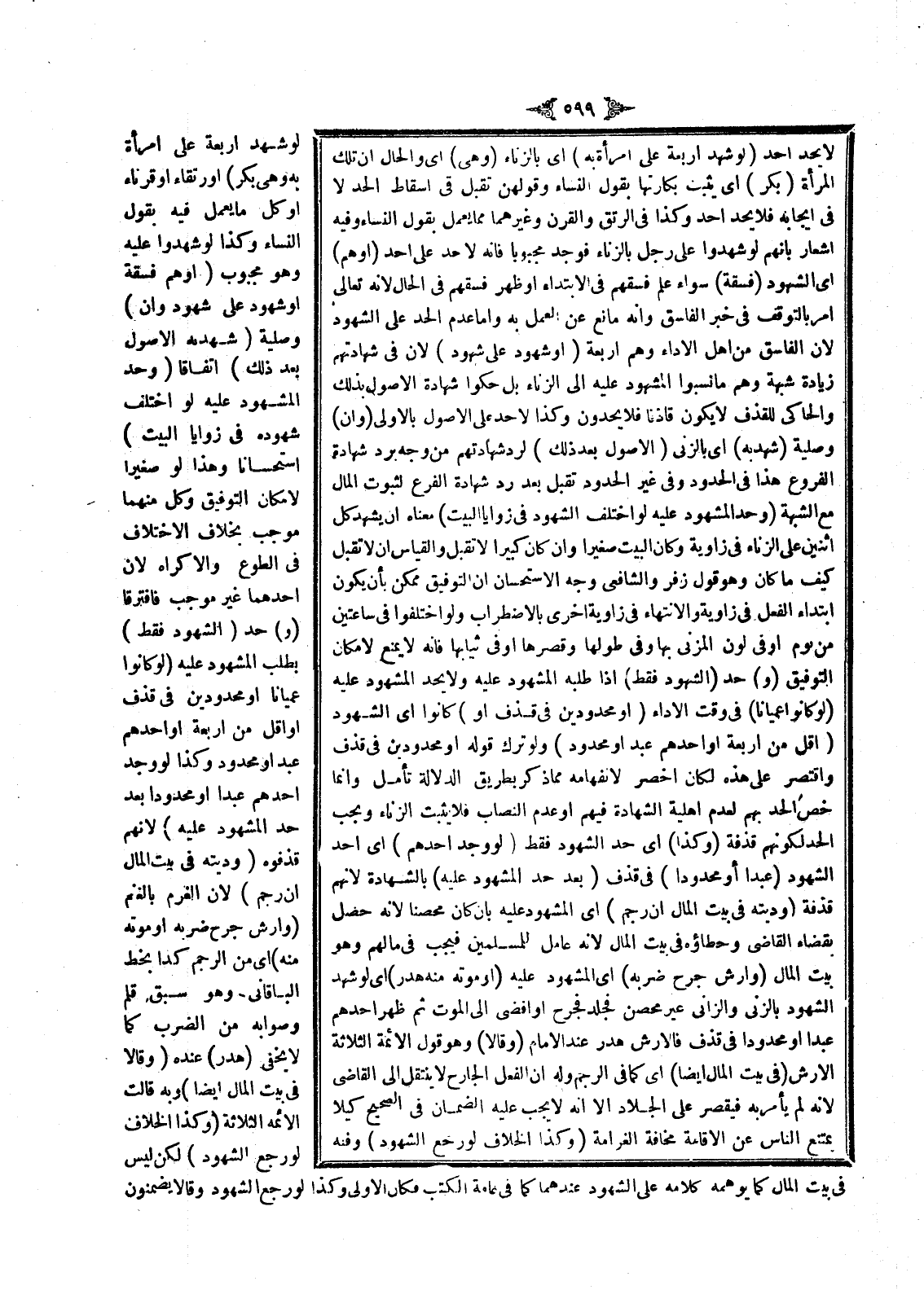 (وَحَدُّ الْمَشْهُودِ عَلَيْهِ لَوْ اخْتَلَفَ الشُّهُودُ فِي زَوَايَا الْبَيْتِ) مَعْنَاهُ أَنْ يَشْهَدَ كُلُّ اثْنَيْنِ عَلَى الزِّنَاءِ فِي زَاوِيَةٍ وَكَانَ الْبَيْتُ صَغِيرًا وَإِنْ كَانَ كَبِيرًا لَا تُقْبَلُ، وَالْقِيَاسُ أَنْ لَا تُقْبَلَ كَيْفَ مَا كَانَ، وَهُوَ قَوْلُ زُفَرَ وَالشَّافِعِيِّ وَجْهُ الِاسْتِحْسَانِ أَنَّ التَّوْفِيقَ مُمْكِنٌ بِأَنْ يَكُونَ ابْتِدَاءُ الْفِعْلِ فِي زَاوِيَةٍ، وَالِانْتِهَاءُ فِي زَاوِيَةٍ أُخْرَى بِالِاضْطِرَابِ وَلَوْ اخْتَلَفُوا فِي سَاعَتَيْنِ مِنْ يَوْمٍ أَوْ فِي لَوْنِ الْمَزْنِيِّ بِهَا وَفِي طُولِهَا وَقِصَرِهَا أَوْ فِي ثِيَابِهَا فَإِنَّهُ لَا يَمْنَعُ لِإِمْكَانِ التَّوْفِيقِ.