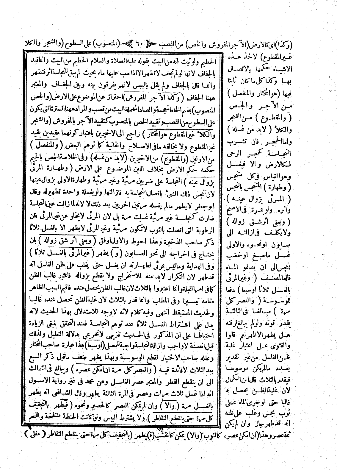 وَفِي الْمَطْلَبِ: وَإِنَّمَا قُدِّرَ بِالثَّلَاثِ؛ لِأَنَّ غَلَبَةَ الظَّنِّ تَحْصُلُ عِنْدَهُ غَالِبًا وَلِحَدِيثِ الْمُسْتَيْقِظِ انْتَهَى وَفِيهِ كَلَامٌ؛ لِأَنَّهُ لَا وَجْهَ لِلِاسْتِدْلَالِ بِهَذَا الْحَدِيثِ؛ لِأَنَّهُ يَدُلُّ عَلَى اشْتِرَاطِ الْغَسْلِ ثَلَاثًا عِنْدَ تَوَهُّمِ النَّجَاسَةِ فَعِنْدَ التَّحَقُّقِ يَنْبَغِي الزِّيَادَةُ احْتِيَاطًا عَلَى أَنَّ الْمَذْكُورَ فِي الْحَدِيثِ تَنْزِيهِيٌّ لَا تَحْرِيمِيٌّ بِدَلَالَةِ التَّعْلِيلِ وَلِذَلِكَ قِيلَ: إنَّهُ سُنَّةٌ لَا وَاجِبٌ، وَإِزَالَةُ النَّجَاسَةِ وَاجِبَةٌ لِلْمُصَلِّي (أَوْ سَبْعًا) هَذَا عِبَارَةُ صَاحِبِ الْمُخْتَارِ وَعَلَّلَهُ صَاحِبُ الِاخْتِيَارِ لِقَطْعِ الْوَسْوَسَةِ، وَبِهَذَا يَظْهَرُ ضَعْفُ مَا قِيلَ: ذِكْرُ السَّبْعِ بَعْدَ الثَّلَاثِ لَا فَائِدَةَ فِيهِ (وَالْعَصْرُ كُلُّ مَرَّةٍ إنْ أَمْكَنَ عَصْرُهُ) وَيُبَالِغُ فِي الثَّالِثِ إلَى أَنْ يَنْقَطِعَ الْقَطْرُ وَالْمُعْتَبَرُ عَصْرُ الْغَاسِلِ وَعَنْ مُحَمَّدٍ فِي غَيْرِ رِوَايَةِ الْأُصُولِ أَنَّهُ إذَا غَسَلَ ثَلَاثَ مَرَّاتٍ وَعَصَرَ فِي الْمَرَّةِ الثَّالِثَةِ يَطْهُرُ.