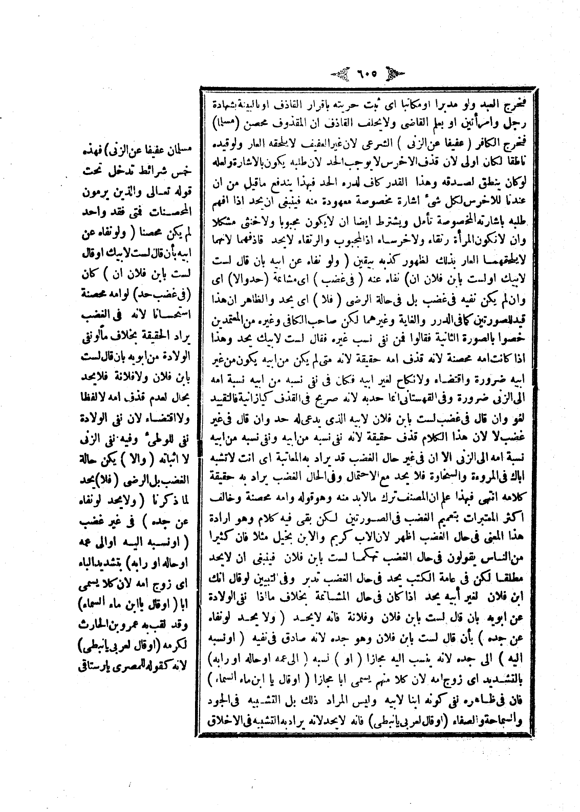 فَبِهَذَا عُلِمَ أَنَّ الْمُصَنِّفَ تَرَكَ مَا لَا بُدَّ مِنْهُ، وَهُوَ قَوْلُهُ وَأُمُّهُ مُحْصَنَةٌ وَخَالَفَ أَكْثَرَ الْمُعْتَبَرَاتِ بِتَعْمِيمِ الْغَضَبِ فِي الصُّورَتَيْنِ لَكِنْ بَقِيَ فِيهِ كَلَامٌ، وَهُوَ إرَادَةُ هَذَا الْمَعْنَى فِي حَالِ الْغَضَبِ أَظْهَرُ؛ لِأَنَّ الْأَبَ كَرِيمٌ، وَالِابْنُ بَخِيلٌ مَثَلًا فَإِنَّ كَثِيرًا مِنْ النَّاسِ يَقُولُونَ فِي حَالِ الْغَضَبِ تَهَكُّمًا لَسْت بِابْنِ فُلَانٍ فَيَنْبَغِي أَنْ لَا يُحَدَّ مُطْلَقًا لَكِنْ فِي عَامَّةِ الْكُتُبِ يُحَدُّ فِي حَالِ الْغَضَبِ تَدَبَّرْ.