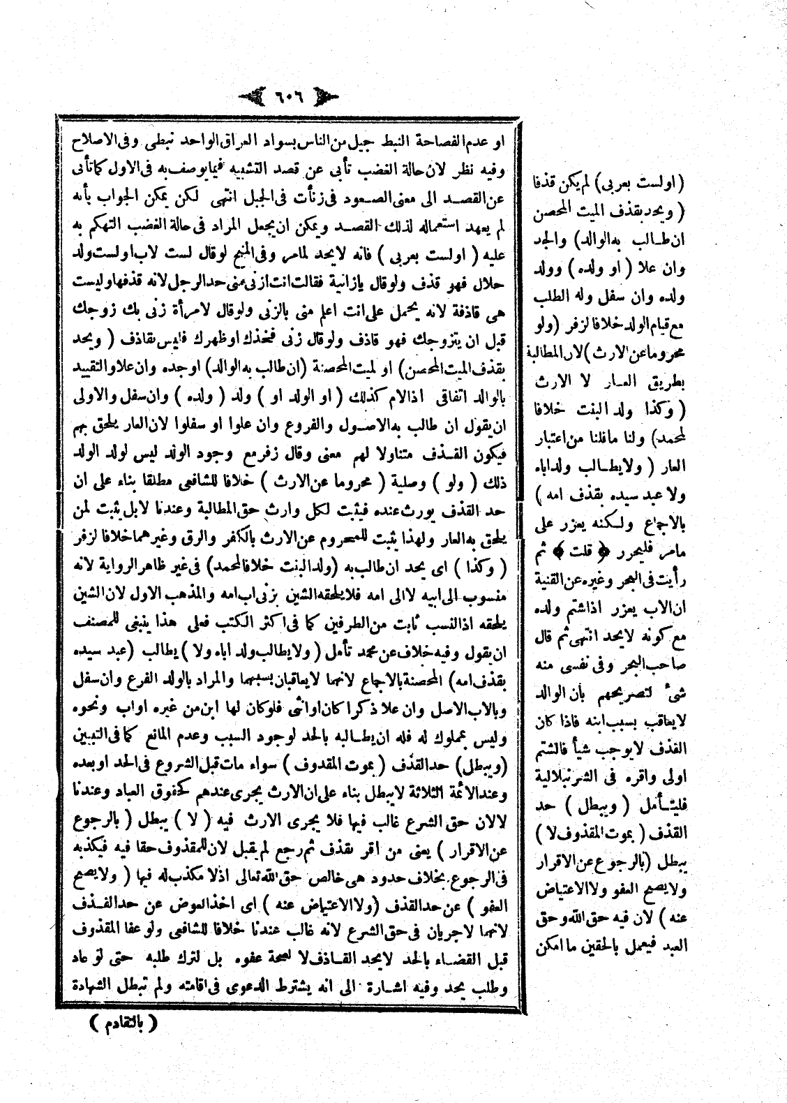 وَقَالَ زُفَرُ مَعَ وُجُودِ الْوَلَدِ لَيْسَ لِوَلَدِ الْوَلَدِ ذَلِكَ (وَلَوْ) وَصْلِيَّةٌ (مَحْرُومًا عَنْ الْإِرْثِ) خِلَافًا لِلشَّافِعِيِّ مُطْلَقًا بِنَاءً عَلَى أَنَّ حَدَّ الْقَذْفِ يُورَثُ عِنْدَهُ فَيَثْبُتُ لِكُلِّ وَارِثٍ حَقُّ الْمُطَالَبَةِ وَعِنْدَنَا لَا بَلْ يَثْبُتُ لِمَنْ يَلْحَقُ بِهِ الْعَارُ؛ وَلِهَذَا يَثْبُتُ لِلْمَحْرُومِ عَنْ الْإِرْثِ بِالْكُفْرِ، وَالرِّقِّ وَغَيْرِهِمَا خِلَافًا لِزُفَرَ.
