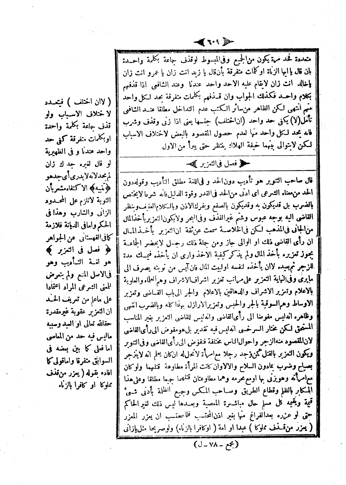 وَفِي النِّهَايَةِ التَّعْزِيرُ عَلَى مَرَاتِبَ تَعْزِيرُ أَشْرَافِ الْأَشْرَافِ وَهُمْ الْعُلَمَاءُ، وَالْعُلْوِيَّةُ بِالْإِعْلَامِ وَتَعْزِيرُ الْأَشْرَافِ، وَالدَّهَاقِينِ بِالْإِعْلَامِ، وَالْجَرِّ إلَى بَابِ الْقَاضِي وَتَعْزِيرُ الْأَوْسَاطِ وَهُمْ السُّوقِيَّةُ بِالْجَرِّ، وَالْحَبْسِ وَتَعْزِيرُ الْأَرَازِلِ بِهَذَا كُلِّهِ وَبِالضَّرْبِ انْتَهَى. وَظَاهِرُهُ أَنَّهُ لَيْسَ مُفَوَّضًا إلَى رَأْيِ الْقَاضِي وَأَنَّهُ لَيْسَ لِلْقَاضِي التَّعْزِيرُ بِغَيْرِ الْمُنَاسِبِ الْمُسْتَحَقِّ لَكِنْ مُخْتَارُ السَّرَخْسِيِّ أَنَّهُ لَيْسَ فِيهِ تَقْدِيرٌ، بَلْ هُوَ مُفَوَّضٌ إلَى رَأْيِ الْقَاضِي؛ لِأَنَّ الْمَقْصُودَ مِنْهُ الزَّجْرُ وَأَحْوَالُ النَّاسِ مُخْتَلِفَةٌ فَتُفَوَّضُ إلَى رَأْيِ الْقَاضِي.