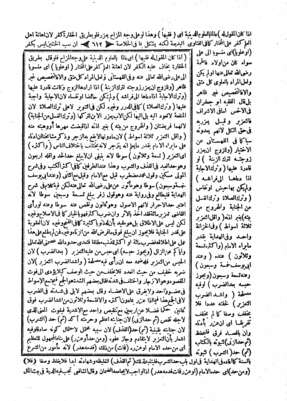 وَفِي رِوَايَةٍ عَنْهُ، وَهُوَ قَوْلُ زُفَرَ يَبْلُغُ تِسْعَةً وَسَبْعِينَ سَوْطًا؛ لِأَنَّهُ اعْتَبَرَ حَدَّ الْأَحْرَارِ؛ لِأَنَّهُمْ الْأُصُولُ، وَهُوَ ثَمَانُونَ وَنَقَصَ عَنْهُ سَوْطًا وَعَنْهُ لَوْ رَأَى الْقَاضِي تَعْزِيرَ مِائَةٍ فَقَدْ أَخَذَ بِالْأَثَرِ، وَإِنْ ضَرَبَ أَكْثَرَ فَهُوَ بِالْخِيَارِ كَمَا فِي الْإِصْلَاحِ وَغَيْرِهِ لَكِنْ لَيْسَ عَلَى الْإِطْلَاقِ بَلْ هُوَ مُقَيَّدٌ بِأَنَّ لَهُ ذُنُوبًا كَثِيرَةً كَمَا فِي الْفَتْحِ وَغَيْرِهِ؛ لِأَنَّ الْعُقُوبَةَ عَلَى قَدْرِ الْجِنَايَةِ فَلَا يَجُوزُ أَنْ يَبْلُغَ فَوْقَ مَا فَرَضَ اللَّهُ مِنْ الزِّنَاءِ وَغَيْرِهِ فَمَنْ لَمْ يَطَّلِعْ عَلَى هَذَا عَمِلَ عَلَى إطْلَاقِهِ فَضَرَبَ مِائَةً، أَوْ أَكْثَرَ لِلذَّنْبِ مُطْلَقًا فَتَعَدَّى حُدُودَ اللَّهِ عَصَمَنِي اللَّهُ تَعَالَى وَإِيَّاكُمْ عَنْ الزَّلَلِ.