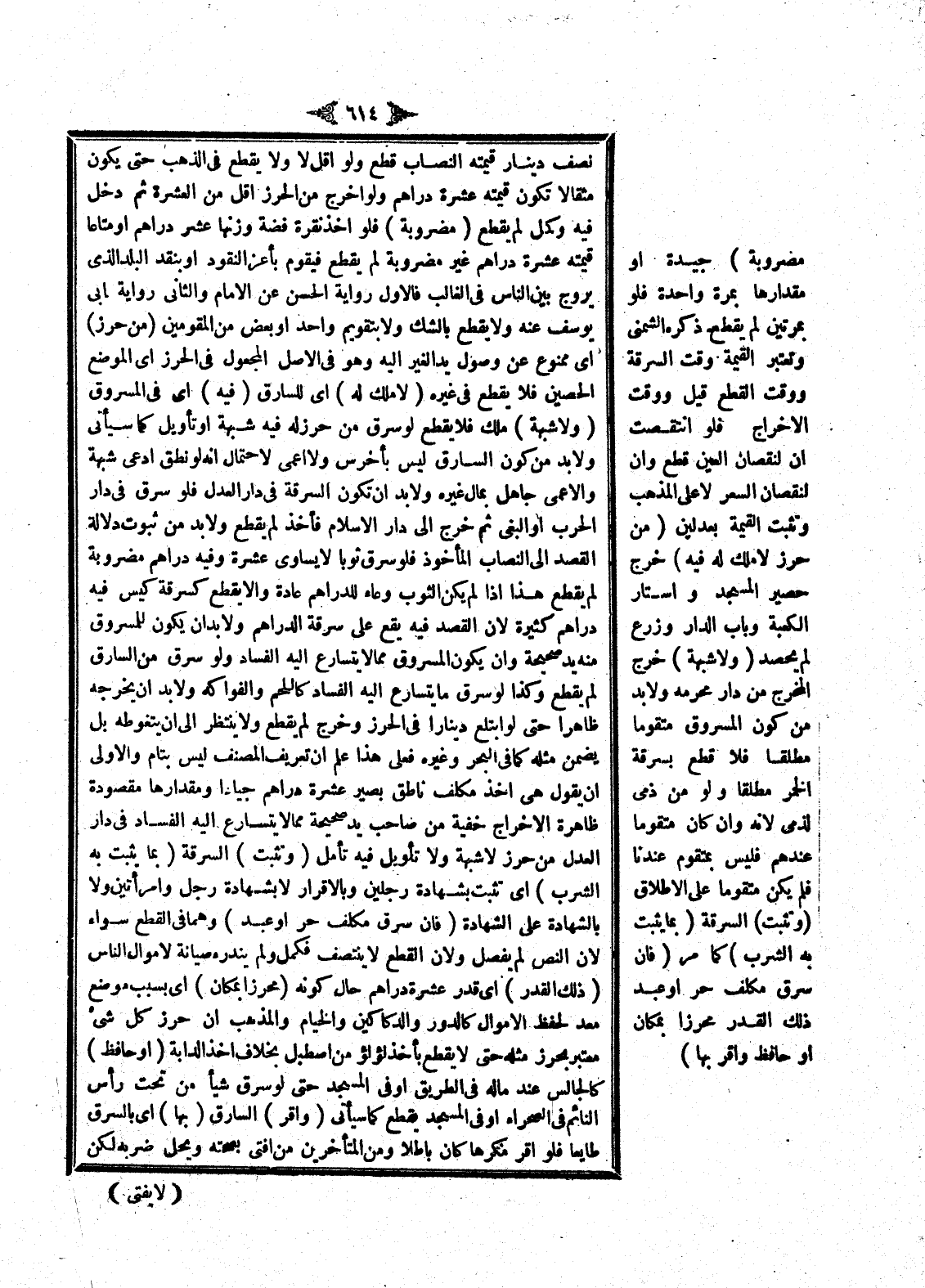 نِصْفَ دِينَارٍ قِيمَتُهُ النِّصَابُ قُطِعَ، وَلَوْ أَقَلَّ لَا وَلَا يُقْطَعُ فِي الذَّهَبِ حَتَّى يَكُونَ مِثْقَالًا تَكُونُ قِيمَتُهُ عَشَرَةَ دَرَاهِمَ، وَلَوْ أَخْرَجَ مِنْ الْحِرْزِ أَقَلَّ مِنْ الْعَشَرَةِ، ثُمَّ دَخَلَ فِيهِ وَكَمَّلَ لَمْ يُقْطَعْ (مَضْرُوبَةً) فَلَوْ أَخَذَ نُقْرَةَ فِضَّةٍ وَزْنُهَا عَشَرَةُ دَرَاهِمَ، أَوْ مَتَاعًا قِيمَتُهُ عَشَرَةُ دَرَاهِمَ غَيْرَ مَضْرُوبَةٍ لَمْ يُقْطَعْ فَيُقَوَّمُ بِأَعَزِّ النُّقُودِ، أَوْ بِنَقْدِ الْبَلَدِ الَّذِي يَرُوجُ بَيْنَ النَّاسِ فِي الْغَالِبِ، فَالْأَوَّلُ رِوَايَةُ الْحَسَنِ عَنْ الْإِمَامِ، وَالثَّانِي رِوَايَةُ أَبِي يُوسُفَ عَنْهُ وَلَا يَقْطَعُ بِالشَّكِّ وَلَا بِتَقْوِيمٍ وَاحِدٍ، أَوْ بَعْضٍ مِنْ الْمُقَوِّمِينَ (مِنْ حِرْزٍ) أَيْ مَمْنُوعٍ عَنْ وُصُولِ يَدِ الْغَيْرِ إلَيْهِ، وَهُوَ فِي الْأَصْلِ الْمَجْعُولُ فِي الْحِرْزِ أَيْ: الْمَوْضِعُ الْحَصِينُ فَلَا يُقْطَعُ فِي غَيْرِهِ (لَا مِلْكَ لَهُ) أَيْ لِلسَّارِقِ (فِيهِ) أَيْ: فِي الْمَسْرُوقِ (وَلَا شُبْهَةَ) مِلْكٍ فَلَا يُقْطَعُ لَوْ سَرَقَ مِنْ حِرْزٍ لَهُ فِيهِ شُبْهَةٌ، أَوْ تَأْوِيلٌ كَمَا سَيَأْتِي وَلَا بُدَّ مِنْ كَوْنِ السَّارِقِ لَيْسَ بِأَخْرَسَ وَلَا أَعْمَى لِاحْتِمَالِ أَنَّهُ لَوْ نَطَقَ ادَّعَى شُبْهَةً، وَالْأَعْمَى جَاهِلٌ بِمَالِ غَيْرِهِ وَلَا بُدَّ أَنْ تَكُونَ السَّرِقَةُ فِي دَارِ الْعَدْلِ فَلَوْ سَرَقَ فِي دَارِ الْحَرْبِ، أَوْ الْبَغْيِ، ثُمَّ خَرَجَ إلَى دَارِ الْإِسْلَامِ فَأَخَذَ لَمْ يُقْطَعْ وَلَا بُدَّ مِنْ ثُبُوتِ دَلَالَةِ الْقَصْدِ إلَى النِّصَابِ الْمَأْخُوذِ فَلَوْ سَرَقَ ثَوْبًا لَا يُسَاوِي عَشَرَةً وَفِيهِ دَرَاهِمُ مَضْرُوبَةٌ لَمْ يُقْطَعْ هَذَا إذَا لَمْ يَكُنْ الثَّوْبُ وِعَاءً لِلدَّرَاهِمِ عَادَةً وَإِلَّا يُقْطَعُ كَسَرِقَةِ كِيسٍ فِيهِ دَرَاهِمُ كَثِيرَةٌ؛ لِأَنَّ الْقَصْدَ فِيهِ يَقَعُ عَلَى سَرِقَةِ الدَّرَاهِمِ وَلَا بُدَّ أَنْ يَكُونَ لِلْمَسْرُوقِ مِنْهُ يَدٌ صَحِيحَةٌ وَأَنْ يَكُونَ الْمَسْرُوقُ مِمَّا لَا يَتَسَارَعُ إلَيْهِ الْفَسَادُ، وَلَوْ سَرَقَ مِنْ السَّارِقِ لَمْ يُقْطَعْ، وَكَذَا لَوْ سَرَقَ مَا يَتَسَارَعُ إلَيْهِ الْفَسَادُ كَاللَّحْمِ، وَالْفَوَاكِهِ وَلَا بُدَّ أَنْ يُخْرِجَهُ ظَاهِرًا حَتَّى لَوْ ابْتَلَعَ دِينَارًا فِي الْحِرْزِ وَخَرَجَ لَمْ يُقْطَعْ وَلَا يَنْتَظِرُ إلَى أَنْ يَتَغَوَّطَهُ، بَلْ يَضْمَنُ مِثْلَهُ كَمَا فِي الْبَحْرِ وَغَيْرِهِ فَعَلَى هَذَا عُلِمَ أَنَّ تَعْرِيفَ الْمُصَنِّفِ لَيْسَ بِتَامٍّ، وَالْأَوْلَى أَنْ يَقُولَ هِيَ أَخْذُ مُكَلَّفٍ نَاطِقٍ بَصِيرٍ عَشَرَةَ دَرَاهِمَ جِيَادًا وَمِقْدَارُهَا مَقْصُودَةً ظَاهِرَةُ الْإِخْرَاجِ خُفْيَةً مِنْ صَاحِبِ يَدٍ صَحِيحَةٍ مِمَّا لَا يَتَسَارَعُ إلَيْهِ الْفَسَادُ فِي دَارِ الْعَدْلِ مِنْ حِرْزٍ لَا شُبْهَةَ وَلَا تَأْوِيلَ فِيهِ تَأَمَّلْ.