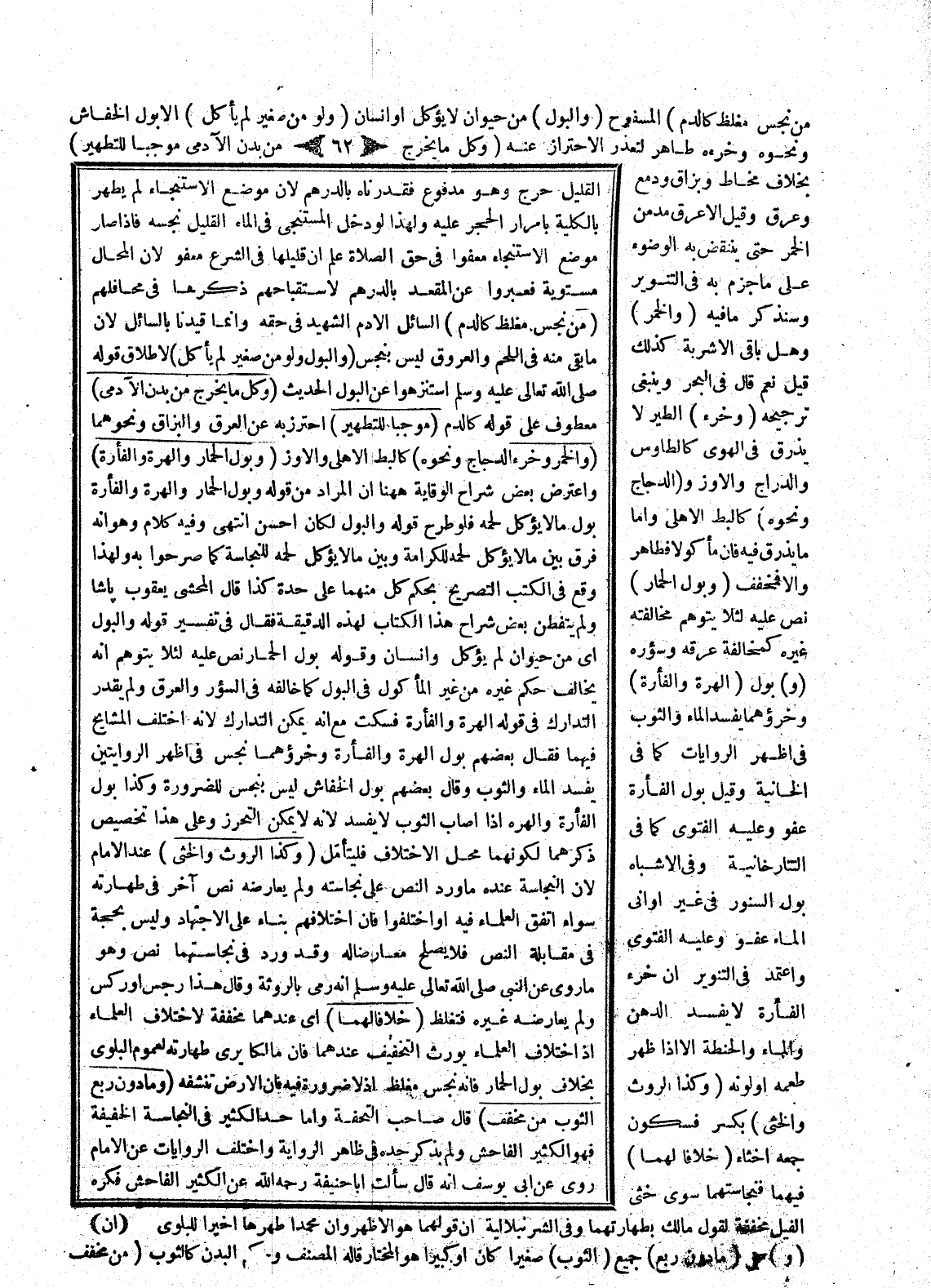 وَفِيهِ كَلَامٌ، وَهُوَ أَنَّهُ فَرَّقَ بَيْنَ مَا لَا يُؤْكَلُ لَحْمُهُ لِلْكَرَامَةِ وَبَيْنَ مَا لَا يُؤْكَلُ لَحْمُهُ لِلنَّجَاسَةِ كَمَا صَرَّحُوا بِهِ؛ وَلِهَذَا وَقَعَ فِي الْكُتُبِ التَّصْرِيحُ بِحُكْمِ كُلٍّ مِنْهُمَا عَلَى حِدَةٍ كَذَا قَالَ الْمُحَشِّي يَعْقُوبُ بَاشَا، وَلَمْ يَتَفَطَّنْ بَعْضُ شُرَّاحِ هَذَا الْكِتَابِ لِهَذِهِ الدَّقِيقَةِ فَقَالَ فِي تَفْسِيرِ قَوْلِهِ: وَالْبَوْلِ أَيْ مِنْ حَيَوَانٍ لَمْ يُؤْكَلْ وَإِنْسَانٍ، وَقَوْلُهُ: بَوْلِ الْحِمَارِ نَصَّ عَلَيْهِ لِئَلَّا يُتَوَهَّمَ أَنَّهُ يُخَالِفُ حُكْمَ غَيْرِهِ مِنْ غَيْرِ الْمَأْكُولِ فِي الْبَوْلِ كَمَا خَالَفَهُ فِي السُّؤْرِ وَالْعِرْقِ وَلَمْ يُقَدِّرْ التَّدَارُكَ فِي قَوْلِهِ الْهِرَّةِ وَالْفَأْرَةِ فَسَكَتَ مَعَ أَنَّهُ يُمْكِنُ التَّدَارُكُ؛ لِأَنَّهُ اخْتَلَفَ الْمَشَايِخُ فِيهِمَا فَقَالَ بَعْضُهُمْ بَوْلُ الْهِرَّةِ وَالْفَأْرَةِ وَخَرْؤُهُمَا نَجَسٌ فِي أَظْهَرِ الرِّوَايَتَيْنِ يَفْسُدُ الْمَاءُ وَالثَّوْبُ.