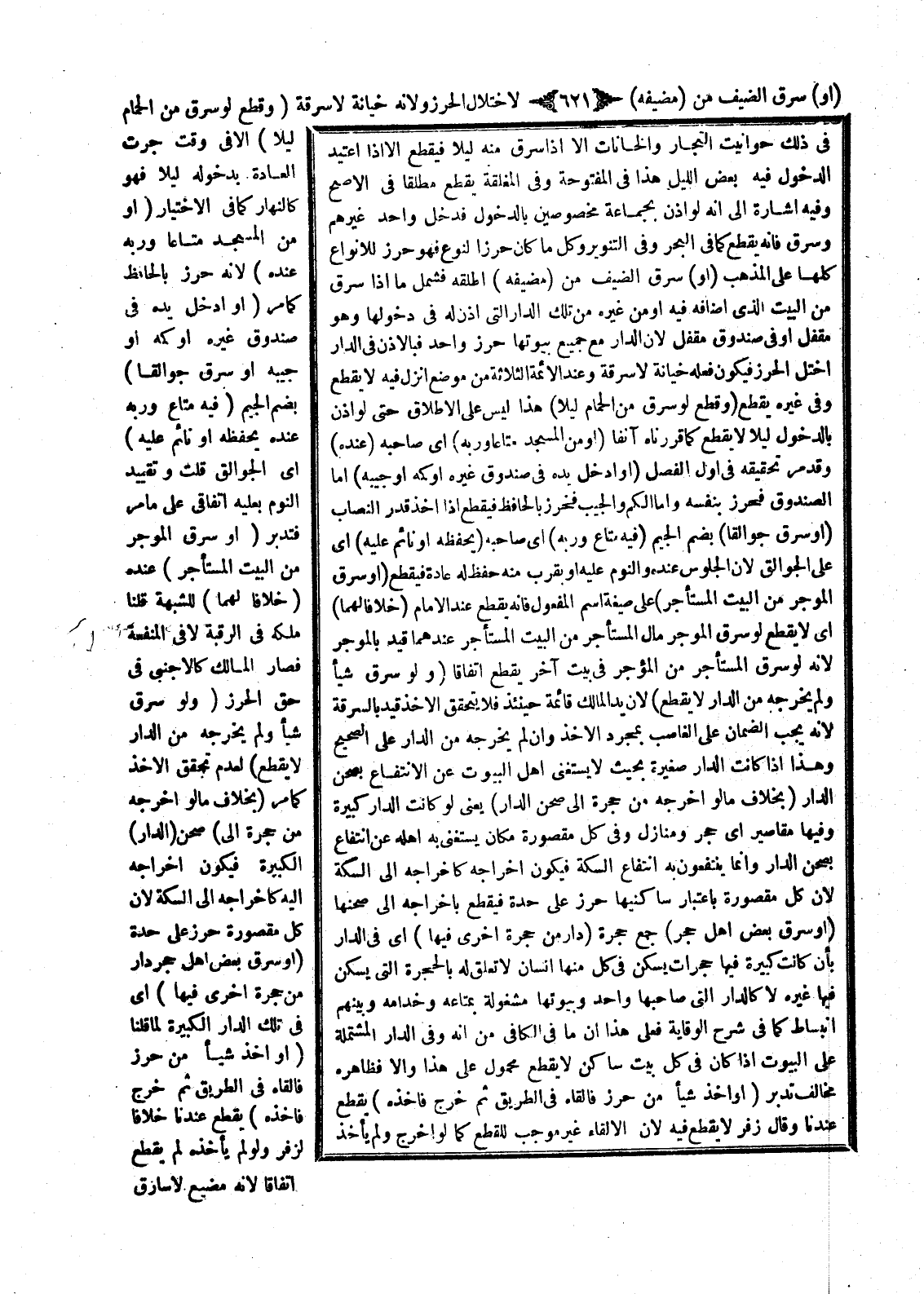 وَفِي غَيْرِهِ يُقْطَعُ (وَقُطِعَ لَوْ سَرَقَ مِنْ الْحَمَّامِ لَيْلًا) هَذَا لَيْسَ عَلَى الْإِطْلَاقِ حَتَّى لَوْ أُذِنَ بِالدُّخُولِ لَيْلًا لَا يُقْطَعُ كَمَا قَرَّرْنَاهُ آنِفًا (أَوْ مِنْ الْمَسْجِدِ مَتَاعًا وَرَبُّهُ) أَيْ صَاحِبُهُ (عِنْدَهُ) ، وَقَدْ مَرَّ تَحْقِيقُهُ فِي أَوَّلِ الْفَصْلِ (أَوْ أَدْخَلَ يَدَهُ فِي صُنْدُوقِ غَيْرِهِ أَوْ كُمِّهِ، أَوْ جَيْبِهِ) أَمَّا الصُّنْدُوقُ فَحِرْزٌ بِنَفْسِهِ، وَأَمَّا الْكُمُّ، وَالْجَيْبُ فَحِرْزٌ بِالْحَافِظِ فَيُقْطَعُ إذَا أَخَذَ قَدْرَ النِّصَابِ (أَوْ سَرَقَ جُوَالِقًا) بِضَمِّ الْجِيمِ (فِيهِ مَتَاعٌ وَرَبُّهُ) أَيْ: صَاحِبُهُ (يَحْفَظُهُ، أَوْ نَائِمٌ عَلَيْهِ) أَيْ: عَلَى الْجُوَالِقِ؛ لِأَنَّ الْجُلُوسَ عِنْدَهُ، وَالنَّوْمَ عَلَيْهِ، أَوْ بِقُرْبٍ مِنْهُ حِفْظٌ لَهُ عَادَةً فَيُقْطَعُ.