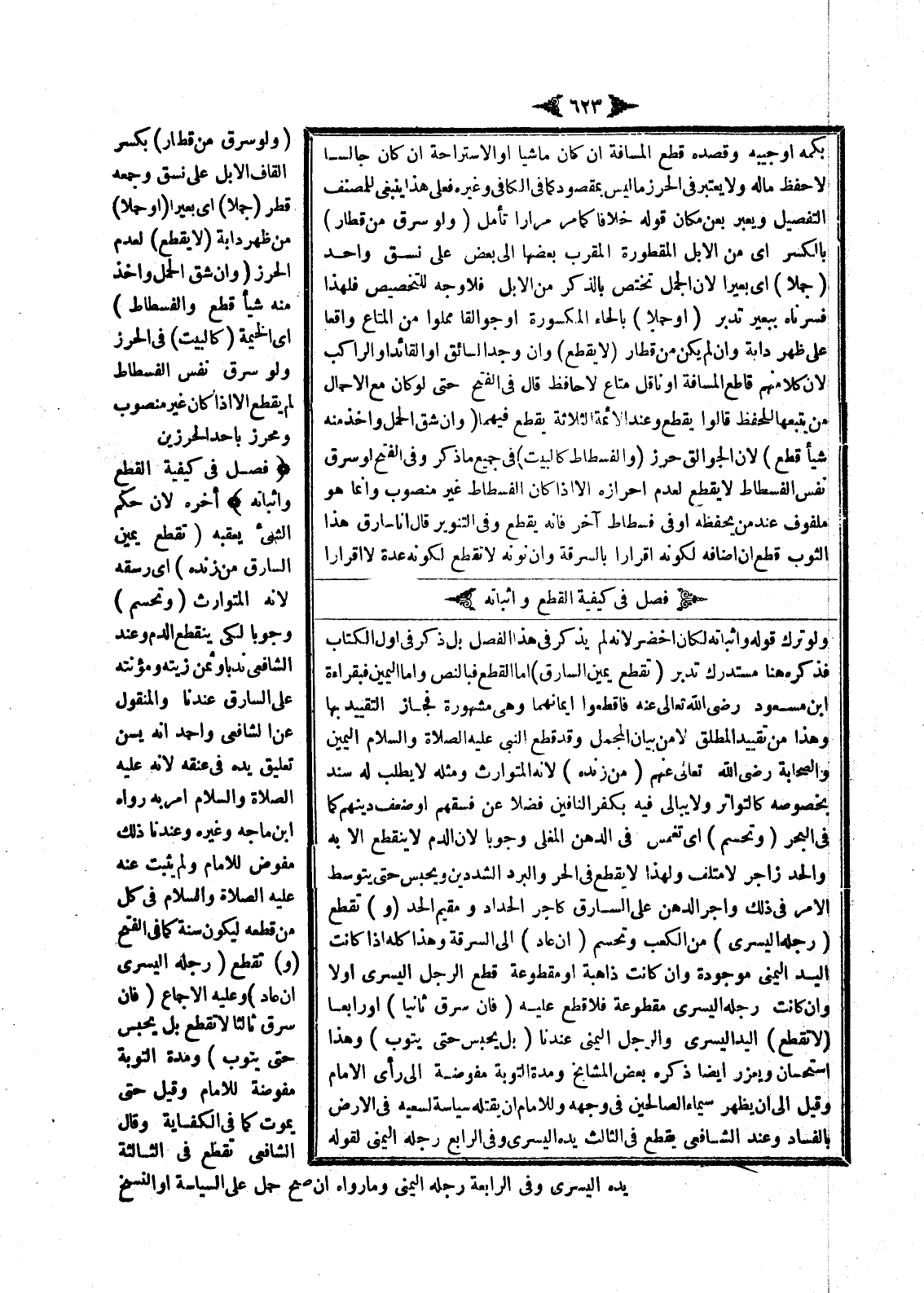(تُقْطَعُ يَمِينُ السَّارِقِ) أَمَّا الْقَطْعُ فَبِالنَّصِّ، وَأَمَّا الْيَمِينُ فَبِقِرَاءَةِ ابْنِ مَسْعُودٍ - رَضِيَ اللَّهُ تَعَالَى عَنْهُ - فَاقْطَعُوا أَيْمَانَهُمَا، وَهِيَ مَشْهُورَةٌ فَجَازَ التَّقْيِيدُ بِهَا وَهَذَا مِنْ تَقْيِيدِ الْمُطْلَقِ لَا مِنْ بَيَانِ الْمُجْمَلِ، وَقَدْ قَطَعَ النَّبِيُّ - عَلَيْهِ الصَّلَاةُ وَالسَّلَامُ - الْيَمِينَ، وَالصَّحَابَةُ - رَضِيَ اللَّهُ تَعَالَى عَنْهُمْ - (مِنْ زَنْدِهِ) ؛ لِأَنَّهُ الْمُتَوَارَثُ وَمِثْلُهُ لَا يُطْلَبُ لَهُ سَنَدٌ بِخُصُوصِهِ كَالتَّوَاتُرِ وَلَا يُبَالَى فِيهِ بِكُفْرِ النَّافِينَ فَضْلًا عَنْ فِسْقِهِمْ، أَوْ ضَعْفِ دِينِهِمْ كَمَا فِي الْبَحْرِ (وَتُحْسَمُ) أَيْ تُغْمَسُ فِي الدُّهْنِ الْمَغْلِيِّ وُجُوبًا؛ لِأَنَّ الدَّمَ لَا يَنْقَطِعُ إلَّا بِهِ، وَالْحَدُّ زَاجِرٌ لَا مُتْلِفٌ؛ وَلِهَذَا لَا يُقْطَعُ فِي الْحَرِّ، وَالْبَرْدِ الشَّدِيدَيْنِ وَيُحْبَسُ حَتَّى يُتَوَسَّطَ الْأَمْرُ فِي ذَلِكَ وَأَجْرُ الدُّهْنِ عَلَى السَّارِقِ كَأَجْرِ الْحَدَّادِ وَمُقِيمِ الْحَدِّ.